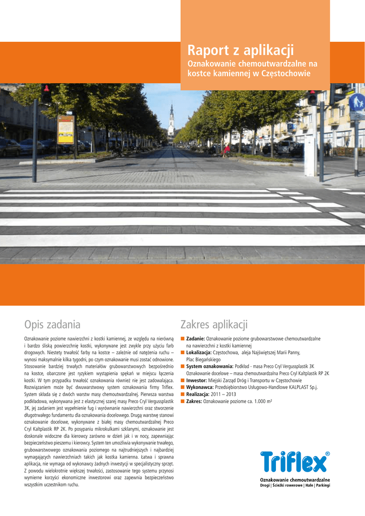 Raport z aplikacji Oznakowanie chemoutwardzalne na kostce kamiennej w Częstochowie Opis zadania Zakres aplikacji Oznakowanie poziome nawierzchni z kostki kamiennej, ze względu na nierówną i bardzo śliską powierzchnię kostki, wykonywane jest zwykle przy użyciu farb drogowych. Niestety trwałość farby na kostce – zależnie od natężenia ruchu – wynosi maksymalnie kilka tygodni, po czym oznakowanie musi zostać odnowione. Stosowanie bardziej trwałych materiałów grubowarstwowych bezpośrednio na kostce, obarczone jest ryzykiem wystąpienia spękań w miejscu łączenia kostki. W tym przypadku trwałość oznakowania również nie jest zadowalająca. Rozwiązaniem może być dwuwarstwowy system oznakowania firmy Triflex. System składa się z dwóch warstw masy chemoutwardzalnej. Pierwsza warstwa podkładowa, wykonywana jest z elastycznej szarej masy Preco Cryl Vergussplastik 3K, jej zadaniem jest wypełnienie fug i wyrównanie nawierzchni oraz stworzenie długotrwałego fundamentu dla oznakowania docelowego. Drugą warstwę stanowi oznakowanie docelowe, wykonywane z białej masy chemoutwardzalnej Preco Cryl Kaltplastik RP 2K. Po posypaniu mikrokulkami szklanymi, oznakowanie jest doskonale widoczne dla kierowcy zarówno w dzień jak i w nocy, zapewniając bezpieczeństwo pieszemu i kierowcy. System ten umożliwia wykonywanie trwałego, grubowarstwowego oznakowania poziomego na najtrudniejszych i najbardziej wymagających nawierzchniach takich jak kostka kamienna. Łatwa i sprawna aplikacja, nie wymaga od wykonawcy żadnych inwestycji w specjalistyczny sprzęt. Z powodu wielokrotnie większej trwałości, zastosowanie tego systemu przynosi wymierne korzyści ekonomiczne inwestorowi oraz zapewnia bezpieczeństwo wszystkim uczestnikom ruchu. ■■ Zadanie: Oznakowanie poziome grubowarstwowe chemoutwardzalne na nawierzchni z kostki kamiennej ■■ Lokalizacja: Częstochowa, aleja Najświętszej Marii Panny, Plac Biegańskiego ■■ System oznakowania: Podkład - masa Preco Cryl Vergussplastik 3K Oznakowanie docelowe – masa chemoutwardzalna Preco Cryl Kaltplastik RP 2K ■■ Inwestor: Miejski Zarząd Dróg i Transportu w Częstochowie ■■ Wykonawca: Przedsiębiorstwo Usługowo-Handlowe KALPLAST Sp.j. ■■ Realizacja: 2011 – 2013 ■■ Zakres: Oznakowanie poziome ca. 1.000 m² Zdjęcia z aplikacji Przygotowanie nawierzchni z kostki kamiennej tj. oczyszczenie, wytrasowanie i oklejenie taśmami Etap 1 - Nakładanie szarej masy chemoutwardzalnej podkładowej, której zadaniem jest wypełnienie fug i wyrównanie nawierzchni Etap 2 - Nakładanie białej masy chemoutwardzalnej wykończeniowej, następnie oznakowanie posypywane jest mikrokulkami szklanymi Oznakowanie jest gotowe zaraz po utwardzaniu się masy chemoutwardzalnej ■■ Preco Cryl Kaltplastik RP 2K ■■ Preco Cryl Vergussplastik 3K Jeśli mają Państwo jakiekolwiek pytania lub potrzebują dalszej informacji, prosimy o kontakt z Bartłomiejem Tomalakiem pod nr tel. +48 696 842 695. Właściwości: ■■ Stosowana do wykonywania oznakowania w formie gładkiej, strukturalnej i profilowanej ■■ Wysoka trwałość i odporność na ścieranie ■■ Nakładanie maszynami samobieżnymi oraz ręcznie kierowanymi ■■ Szybki czas schnięcia 15 min do 20 min przy 20 °C ■■ Nakładanie na nawierzchniach asfaltowych i betonowych ■■ Widoczność w stanie mokrym (BASt, typ II) ■■ Odporność na warunki atmosferyczne ■■ Aprobata Techniczna i Krajowy Certyfikat Zgodności IBDiM ■■ Certyfikat BASt QR-Kod skanuj przy pomocy smartfona w celu uzyskania dostępu do dodatkowych informacji. International Triflex GmbH & Co. KG Karlstrasse 59 32423 Minden | Niemcy Tel. +49 571 38780-0 [email protected] www.triflex.com Polska Triflex Polska ul. Rzymowskiego 53 02-697 Warszawa Tel. +48 22 5480156 [email protected] www.triflex.pl 019 Raport z aplikacji Czestochowie PL-A4-11/2012 Masa chemoutwardzalna