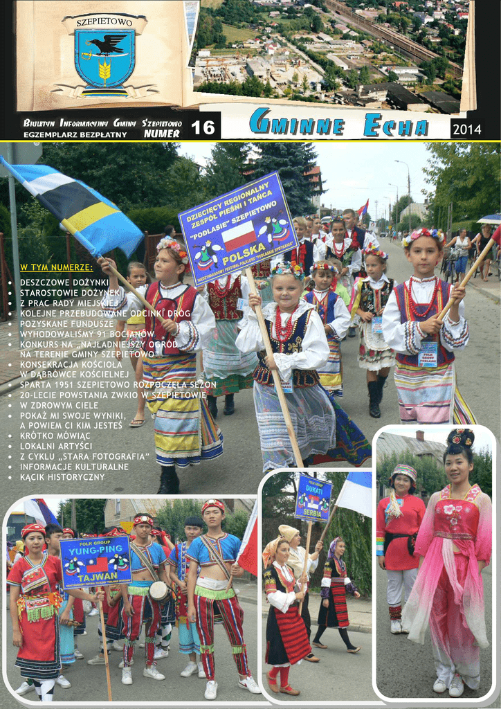 16 W TYM NUMERZE: • • • • • • • • • • • • • • • • • DESZCZOWE DOŻYNKI STAROSTOWIE DOŻYNEK Z PRAC RADY MIEJSKIEJ KOLEJNE PRZEBUDOWANE ODCINKI DRÓG POZYSKANE FUNDUSZE WYHODOWALIŚMY 91 BOCIANÓW KONKURS NA „NAJŁADNIEJSZY OGRÓD NA TERENIE GMINY SZEPIETOWO” KONSEKRACJA KOŚCIOŁA W DĄBRÓWCE KOŚCIELNEJ SPARTA 1951 SZEPIETOWO ROZPOCZĘŁA SEZON 20-LECIE POWSTANIA ZWKIO W SZEPIETOWIE W ZDROWYM CIELE POKAŻ MI SWOJE WYNIKI, A POWIEM CI KIM JESTEŚ KRÓTKO MÓWIĄC LOKALNI ARTYŚCI Z CYKLU „STARA FOTOGRAFIA” INFORMACJE KULTURALNE KĄCIK HISTORYCZNY 2014 GMINNE ECHA DESZCZOWE DOŻYNKI W dniu 24 sierpnia 2014 roku na terenie Spółdzielni Mieszkaniowej w Szepietowie odbyły się, już po raz czwarty, Dożynki Gminne. Ceremonia dożynkowa rozpoczęła się Mszą Świętą dziękczynną w kościele pw. NMP Matki Miłosierdzia w Szepietowie. Przewodniczyli jej ks. kanonik Stanisław Szymborski oraz budowniczy kościoła w Szepietowie i pierwszy proboszcz szepietowskiej parafii – ks. kanonik Józef Żyłowski – Honorowy Obywatel Gminy Szepietowo. Starostowie dożynek, Pani Urszula Wojno z miejscowości Wojny - Piecki i Pan Tomasz Kraszewski z miejscowości Dąbrowa – Łazy, zgodnie z wielowiekową tradycją, przekazali dziekanowi dekanatu szepietowskiego ks. kan. Stanisławowi Szymborskiemu bochen chleba, natomiast delegacje sołectw – dary ofiarne. Starosta dożynek Pan Tomasz Kraszewski oraz Burmistrz Szepietowa Stanisław Roch Wyszyński podziękowali Panu Bogu za urodzaj i zebrane plony, rolnikom za wysiłek i mozolną pracę oraz życzyli, aby chleba nikomu nie zabrakło. Za odprawioną Mszę Świętą w imieniu wszystkich zgromadzonych podziękowała księżom starościna dożynek Pani Urszula Wojno. Po Mszy Świętej orszak dożynkowy udał się na plac Spółdzielni Mieszkaniowej, gdzie odbyła się dalsza część uroczystości. Mimo deszczowej pogody, uczestnicy dożynek nie mogli narzekać na brak emocji. Dużym zainteresowaniem cieszyła się rywalizacja sołectw w konkurencjach sprawnościowych. Publiczność mogła podziwiać swoich reprezentantów w konkurencjach takich jak: przeciąganie liny, bieg na nartach, rzut jajkiem na odległość, wyścig taczek, slalom drużyn dwuosobowych (mężczyzna, kobieta) i kręcioła. Zmaganiom towarzyszyło mnóstwo emocji. Spośród 5 startujących drużyn najlepszą okazała się drużyna z Dąbrowy – Zabłotnych, która minimalnie wyprzedziła drużynę z Szepietowa. Trzecie miejsce zajęła drużyna z Dąbrowy - Moczydeł. Kolejne miejsca zajęły reprezentacje wsi Dąbrowa Kaski2 i Wojny - Szuby. Zwycięzcy otrzymali bon o wartości 1500 zł, zdobywcy II miejsca - bon o wartości 1200 zł, a III miejsca - bon o wartości 1000 zł. Nagrody ufundowała firma „ROL – POL” Halina i Jan Ołdakowscy. Podczas uroczystości dożynkowej podsumowano konkurs na najładniejszy ogród, wręczając zwycięzcom nagrody i dyplomy. Komisja w składzie: Anna Fatyga, Joanna Czarkowska i Paweł Jabłoński dokonała oceny ponad 30 zgłoszonych do konkursu ogrodów. Ze względu na dużą różnorodność ich form, sposobów zagospodarowania i pełnionych funkcji, członkowie komisji postanowili przyznać nagrody aż w 11 kategoriach, m.in.: za nowoczesną formę ogrodu, za sposób zagospodarowania, za magię i tajemniczość, za ukwiecenie, za rekreację i atrakcje dla dzieci, za zachowanie starych budowli oraz za połączenie wiedzy z praktyką. Zwycięzcy w poszczególnych kategoriach otrzymali nagrody w wysokości 300 zł ufundowane przez firmę „POL-KRUSZ” Państwa Alicji i Zbigniewa Wojno. Zainteresowaniem wszystkich zgromadzonych cieszył się również pokaz pojazdów ślubnych. Na zaproszenie organizatorów przyjechało ich do Szepietowa kilkanaście. Niektóre miały nawet ponad 9 m długości. Dla oglądających pokaz był dużą atrakcją, dla właścicieli pojazdów - doskonałą formą reklamy. Uroczystość dożynkową uatrakcyjniały występy działających przy Gminnym Ośrodku Kultury w Szepietowie zespołów: Regionalnego Dziecięcego Zespołu Pieśni i Tańca „Podlasie” oraz Młodzieżowej Orkiestry Dętej z mażoretkami „VIVAT” z Publicznego Gimnazjum w Szepietowie. Późnym popołudniem, mimo deszczu i chłodu, na scenie koncertowały zespoły: „Warszawska Kapela z Targówka”, „Bałkańska Dziewczyna” oraz „JAG QUARTET – muzyka cygańska”. Gwiazdą wieczoru był zespół "AKCENT" z Zenonem Martyniukiem. Brzydka pogoda nie zniechęciła publiczności, która stawiła się licznie i słuchała występu wokalisty, świetnie się przy tym bawiąc. Impreza zakończyła się efektownym pokazem sztucznych ogni. GMINNE ECHA 3 GMINNE ECHA STAROSTOWIE DOŻYNEK Starościna dożynek, Pani Urszula Wojno, zam. Wojny – Piecki, wraz z mężem Wiesławem prowadzą nowoczesne w pełni zmechanizowane gospodarstwo rolne o pow. 60 ha; są właścicielami 40 ha, a 20 ha dzierżawią. Głównym kierunkiem gospodarstwa jest hodowla bydła mlecznego. Aktualnie Państwo Wojno posiadają 60 szt. bydła mlecznego. Średnia wydajność stada wynosiła za 2013 r. 10 100 litrów, a rekordzistka dała 13 800 litrów mleka. W produkcji roślinnej największą powierzchnię zajmują kukurydza i zboża. Jak wielu rolników z terenu naszej gminy, Państwo Urszula i Wiesław Wojno korzystali z dotacji unijnych na modernizację rolnictwa i zakup maszyn. Budynki inwentarskie, park maszynowy, dom mieszkalny i jego otoczenie prezentują się bardzo ładnie i okazale. Państwo Urszula i Wiesław Wojno cieszą się dużym uznaniem wśród sąsiadów i mieszkańców wsi. Zawsze są chętni do współpracy i pomocy innym. Mimo wielu obowiązków, Pani Urszula Wojno znajduje czas na działalność społeczną oraz na prace pielęgnacyjne i utrzymanie pięknego ogrodu. Państwo Urszula i Wiesław Wojno są rodzicami trojga dzieci – Wioletty, Patryka i Dawida. Cieszą się, bo jeden z synów bardzo p