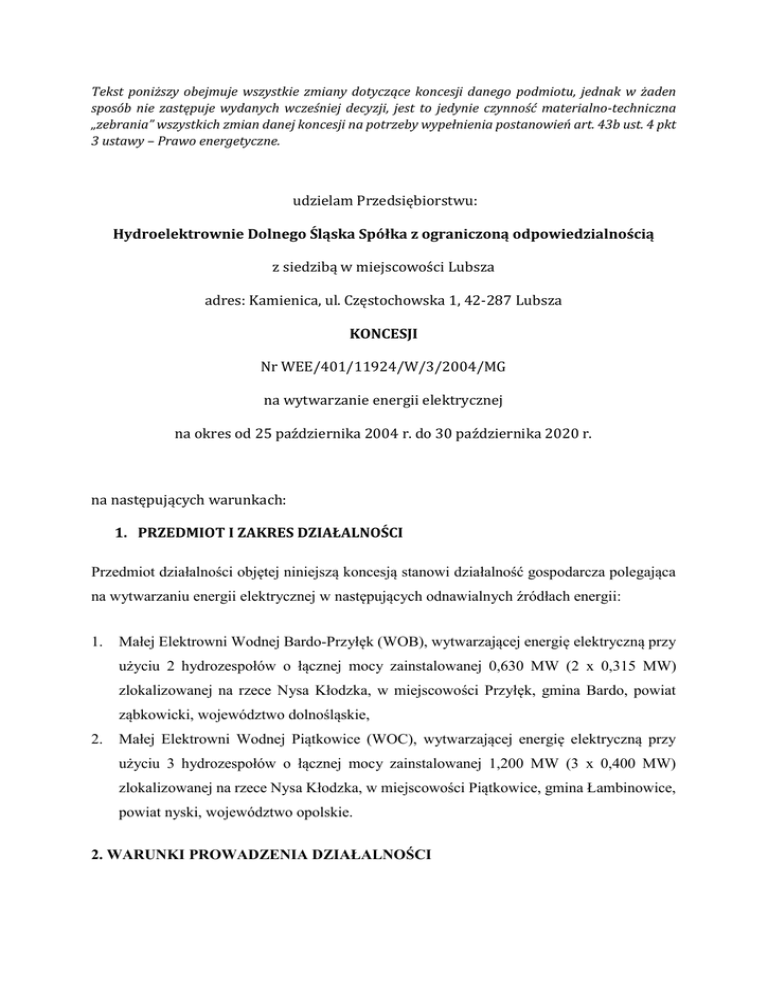 Tekst poniższy obejmuje wszystkie zmiany dotyczące koncesji danego podmiotu, jednak w żaden sposób nie zastępuje wydanych wcześniej decyzji, jest to jedynie czynność materialno-techniczna „zebrania” wszystkich zmian danej koncesji na potrzeby wypełnienia postanowień art. 43b ust. 4 pkt 3 ustawy – Prawo energetyczne. udzielam Przedsiębiorstwu: Hydroelektrownie Dolnego Śląska Spółka z ograniczoną odpowiedzialnością z siedzibą w miejscowości Lubsza adres: Kamienica, ul. Częstochowska 1, 42-287 Lubsza KONCESJI Nr WEE/401/11924/W/3/2004/MG na wytwarzanie energii elektrycznej na okres od 25 października 2004 r. do 30 października 2020 r. na następujących warunkach: 1. PRZEDMIOT I ZAKRES DZIAŁALNOŚCI Przedmiot działalności objętej niniejszą koncesją stanowi działalność gospodarcza polegająca na wytwarzaniu energii elektrycznej w następujących odnawialnych źródłach energii: 1. Małej Elektrowni Wodnej Bardo-Przyłęk (WOB), wytwarzającej energię elektryczną przy użyciu 2 hydrozespołów o łącznej mocy zainstalowanej 0,630 MW (2 x 0,315 MW) zlokalizowanej na rzece Nysa Kłodzka, w miejscowości Przyłęk, gmina Bardo, powiat ząbkowicki, województwo dolnośląskie, 2. Małej Elektrowni Wodnej Piątkowice (WOC), wytwarzającej energię elektryczną przy użyciu 3 hydrozespołów o łącznej mocy zainstalowanej 1,200 MW (3 x 0,400 MW) zlokalizowanej na rzece Nysa Kłodzka, w miejscowości Piątkowice, gmina Łambinowice, powiat nyski, województwo opolskie. 2. WARUNKI PROWADZENIA DZIAŁALNOŚCI 2.1. Warunki ogólne 2.1.1. Koncesjonariusz jest zobowiązany do spełnienia określonych przepisami prawa warunków wykonywania działalności gospodarczej, a w szczególności warunków określonych w ustawie - Prawo energetyczne i wydanych na jej podstawie przepisach wykonawczych. 2.1.2. Koncesjonariusz jest zobowiązany do zawierania umów zgodnie z przepisami ustawy Prawo energetyczne oraz warunkami określonymi w niniejszej koncesji. 2.1.3. Koncesjonariusz jest zobowiązany do prowadzenia działalności w sposób nie stanowiący zagrożenia dla życia lub zdrowia ludzkiego oraz nie narażający na powstanie szkód materialnych. W szczególności Koncesjonariusz jest zobowiązany do przestrzegania przepisów o bezpieczeństwie i higienie pracy, przepisów dotyczących bezpieczeństwa pożarowego oraz bezpieczeństwa ludzi i mierna. 2.1.4. Koncesjonariusz jest zobowiązany do niezwłocznego informowania Prezesa Urzędu Regulacji Energetyki (zwanego dalej „Prezesem URE”) o wykonaniu rozstrzygnięć wydanych na podstawie art. 8 ustawy - Prawo energetyczne. 2.1.5. Koncesjonariusz zapewni, że prowadzona przez niego działalność, inna niż objęta niniejszą koncesją, nie będzie zagrażać ani nie wpłynie negatywnie na warunki prowadzenia działalności objętej niniejszą koncesją, w szczególności przez jej ograniczenie lub pogorszenie jakości świadczonych usług. 2.2. Szczególne warunki wykonywania działalności objętej koncesją ze względu na właściwą obsługę odbiorców 2.2.1. Koncesjonariusz jest zobowiązany do utrzymywania stanu technicznego oraz wyposażenia użytkowanych obiektów, instalacji i urządzeń związanych z prowadzeniem działalności objętej niniejszą koncesją, zgodnego z obowiązującymi przepisami określającymi wymogi techniczne, w tym metrologiczne, jakościowe i ochrony środowiska, zapewniającego w szczególności utrzymywanie właściwych standardów wykonywanej działalności koncesjonowanej, określonej w przepisach wydanych na podstawie art. 9 ust 1 ustawy - Prawo energetyczne, z uwzględnieniem racjonalnego poziomu kosztów. 2.2.2. Koncesjonariusz jest zobowiązany do utrzymywania lub zagwarantowania możliwości pozyskania środków finansowych lub majątku pozwalającego na zaspokojenie roszczeń osób trzecich mogących powstać wskutek niewłaściwego prowadzenia działalności objętej koncesją, lub szkód w środowisku. 2.2.3. Koncesjonariusz jest zobowiązany do zapewnienia, aby czynności w zakresie samodzielnej eksploatacji instalacji i urządzeń określonych w przepisach wydanych na podstawie art. 54 ust. 6 ustawy - Prawo energetyczne, wykonywały wyłącznie osoby legitymujące się posiadaniem wymaganych kwalifikacji, stosownie do art. 54 ust. 1 i 2 tej ustawy. 2.3. Zabezpieczenie ochrony środowiska w trakcie oraz po zaprzestaniu działalności koncesjonowanej 2.3.1. Koncesjonariusz jest zobowiązany do przestrzegania obowiązujących przepisów dotyczących ochrony środowiska, a w szczególności do terminowej realizacji określonych tymi przepisami przedsięwzięć zabezpieczających środowisko przed szkodliwym wpływem działalności prowadzonej na podstawie niniejszej koncesji. 2.3.2. Koncesjonariusz jest zobowiązany do przestrzegania przepisów ustawy - Prawo wodne, a w szczególności do posiadania pozwoleń wodnoprawnych. 2.3.2. W przypadku, gdy działalność objęta niniejszą koncesją wywiera wpływ na środowisko, Koncesjonariusz jest zobowiązany, w trakcie prowadzenia działalności koncesjonowanej oraz po jej zaprzestaniu, do likwidacji skutków tej działalności, w szczególności w zakresie rekultywacji gruntów, przywrócenia rzeźby terenu do właściwego stanu, utylizacji odpadów niebezpiecznych. 2.4. Sprawozdawczość i udzielanie informacji 2.4.1. Koncesjonariusz jest zobowiązany do niezwłocznego pisemnego informowania Prezesa URE o realizowanych inwestycjach związanych z ochroną środowiska, o zamiarze rozbudowy lub likwidacji źródeł, zamiarze rozszerzenia lub ograniczenia działalności związanej z wytwarzaniem energii elektrycznej, zmianach warunków technicznych wytwarzania oraz innych przewidywanych zmianach mających istotny wpływ na warunki prowadzenia działalności koncesjonowanej. 2.4.2. Koncesjonariusz jest zobowiązany do przedstawiania Prezesowi URE, do dnia 1 marca każdego roku, informacji o rozmiarze i przychodach z działalności