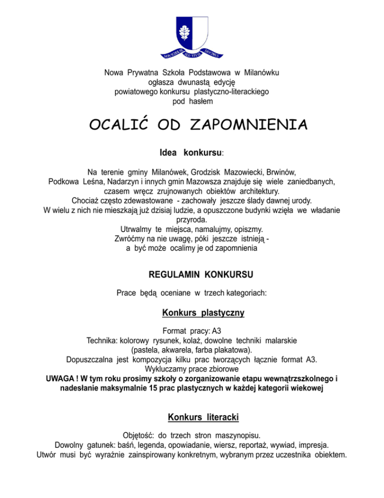 Nowa Prywatna Szkoła Podstawowa w Milanówku ogłasza dwunastą edycję powiatowego konkursu plastyczno-literackiego pod hasłem OCALIĆ OD ZAPOMNIENIA Idea konkursu: Na terenie gminy Milanówek, Grodzisk Mazowiecki, Brwinów, Podkowa Leśna, Nadarzyn i innych gmin Mazowsza znajduje się wiele zaniedbanych, czasem wręcz zrujnowanych obiektów architektury. Chociaż często zdewastowane - zachowały jeszcze ślady dawnej urody. W wielu z nich nie mieszkają już dzisiaj ludzie, a opuszczone budynki wzięła we władanie przyroda. Utrwalmy te miejsca, namalujmy, opiszmy. Zwróćmy na nie uwagę, póki jeszcze istnieją a być może ocalimy je od zapomnienia REGULAMIN KONKURSU Prace będą oceniane w trzech kategoriach: Konkurs plastyczny Format pracy: A3 Technika: kolorowy rysunek, kolaż, dowolne techniki malarskie (pastela, akwarela, farba plakatowa). Dopuszczalna jest kompozycja kilku prac tworzących łącznie format A3. Wykluczamy prace zbiorowe UWAGA ! W tym roku prosimy szkoły o zorganizowanie etapu wewnątrzszkolnego i nadesłanie maksymalnie 15 prac plastycznych w każdej kategorii wiekowej Konkurs literacki Objętość: do trzech stron maszynopisu. Dowolny gatunek: baśń, legenda, opowiadanie, wiersz, reportaż, wywiad, impresja. Utwór musi być wyraźnie zainspirowany konkretnym, wybranym przez uczestnika obiektem. Wykluczone prace zbiorowe. Konkurs plastyczno–literacki Fotoreportaż: od czterech do dwunastu zdjęć z pomysłowymi podpisami, naklejonych na planszę formatu nie większego niż B-2 (50/70 cm) Wykluczone prace zbiorowe. 1. Warunkiem przystąpienia do konkursu jest wykonanie zdjęcia obiektu-inspiracji. W jego doborze i sfotografowaniu pomóc mogą nauczyciele lub rodzice. 2. Prace powinny być wykonane samodzielnie, jedynie pod kierunkiem nauczyciela, w miarę możliwości na zajęciach lekcyjnych lub pozalekcyjnych (nie w domu). 3. Pracę należy zakodować zgodnie z dołączoną do regulaminu instrukcją. 4. Uczeń sam decyduje, czy chce wziąć udział w kilku formach konkursowych, czy tylko w jednej. 5. Zasady oceniania : - prace będą oceniane oddzielnie w trzech kategoriach - uczestnicy konkursu zostaną przydzieleni do jednej z grup wiekowych (klasy IV-VI szkół podstawowych, gimnazja). 6. Termin nadsyłania prac na adres: Nowa Prywatna Szkoła Podstawowa, ul. Brzozowa 1 05-822 Milanówek upływa 14 listopada 2012 roku. Bardzo prosimy o jego przestrzeganie (nie decyduje data stempla pocztowego). 7. Prace nadesłane po terminie, niezgodne z regulaminem a także prace, dla których inspiracją jest obiekt niespełniający idei konkursu nie będą brane pod uwagę. Złożenie pracy jest równoznaczne z przyjęciem warunków opisanych w regulaminie. 8. O przyznaniu ilości nagród decyduje jury, w skład którego wejdą osoby związane z działalnością kulturalną Milanówka i okolicznych miejscowości. 9. O wynikach konkursu, terminie i miejscu wręczenia nagród połączonego z prezentacją wyróżnionych prac powiadomione zostaną szkoły i lokalne media. 10. Organizator zastrzega sobie prawo do bezpłatnego wykorzystania zdjęć i treści nadesłanych prac z podaniem autora pracy. Prace konkursowe można odebrać w siedzibie organizatora w nieprzekraczalnym terminie do dnia 1 marca 2013 roku, po tym terminie prace przechodzą na własność organizatora.