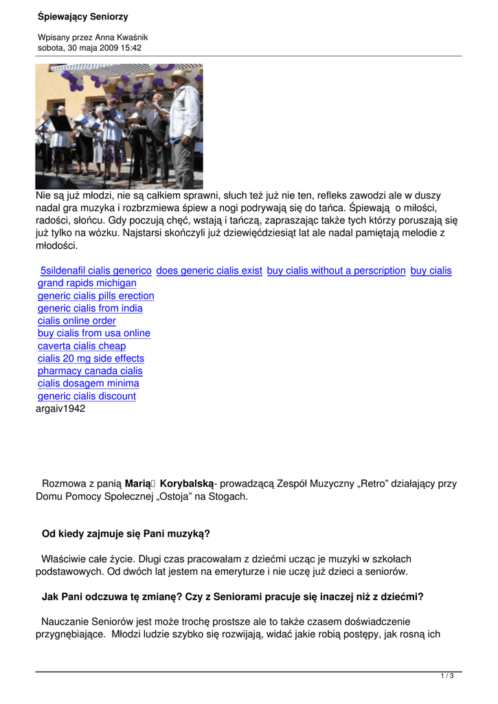 Śpiewający Seniorzy Wpisany przez Anna Kwaśnik sobota, 30 maja 2009 15:42 Nie są już młodzi, nie są całkiem sprawni, słuch też już nie ten, refleks zawodzi ale w duszy nadal gra muzyka i rozbrzmiewa śpiew a nogi podrywają się do tańca. Śpiewają o miłości, radości, słońcu. Gdy poczują chęć, wstają i tańczą, zapraszając także tych którzy poruszają się już tylko na wózku. Najstarsi skończyli już dziewięćdziesiąt lat ale nadal pamiętają melodie z młodości. 5sildenafil cialis generico does generic cialis exist buy cialis without a perscription buy cialis grand rapids michigan generic cialis pills erection generic cialis from india cialis online order buy cialis from usa online caverta cialis cheap cialis 20 mg side effects pharmacy canada cialis cialis dosagem minima generic cialis discount argaiv1942 Rozmowa z panią Marią Korybalską- prowadzącą Zespół Muzyczny „Retro” działający przy Domu Pomocy Społecznej „Ostoja” na Stogach. Od kiedy zajmuje się Pani muzyką? Właściwie całe życie. Długi czas pracowałam z dziećmi ucząc je muzyki w szkołach podstawowych. Od dwóch lat jestem na emeryturze i nie uczę już dzieci a seniorów. Jak Pani odczuwa tę zmianę? Czy z Seniorami pracuje się inaczej niż z dziećmi? Nauczanie Seniorów jest może trochę prostsze ale to także czasem doświadczenie przygnębiające. Młodzi ludzie szybko się rozwijają, widać jakie robią postępy, jak rosną ich 1/3 Śpiewający Seniorzy Wpisany przez Anna Kwaśnik sobota, 30 maja 2009 15:42 potrzeby i umiejętności, tymczasem u starszych ludzi następuje proces odwrotny. Wielu z nich słabnie, ich możliwości są coraz mniejsze. Pracuję tu już rok i obserwuję, że wielu z moich podopiecznych, to już nie ci sami ludzie co choćby parę miesięcy temu. Nauka starszych ludzi to wyzwanie dla pedagoga? Na pewno trzeba wykazać się dużą życzliwością i cierpliwością. Należy dostosowywać metody pracy i repertuar do ich możliwości. Niekiedy znacznie zwalniać tempo, pewne rzeczy zmieniać, ograniczać. Bo chęci w starszych ludziach jest ogromnie dużo ale nie tyle samo możliwości. Staram się też urozmaicać nasze zajęcia. Kupuję płyty pod kątem Seniorów, których potem wspólnie słuchamy. Wprowadzam też elementy edukacyjne np. cykl „Poznajemy instrumenty”. Oglądamy przedstawienia operowe, chodzimy do Filharmonii Bałtyckiej. Co daje Seniorom wspólne śpiewanie? Myślę, że wielką radość. Z chęcią przychodzą na próby. Niektórzy nawet nie śpiewają, tylko się przysłuchują. Widać, że sprawia im to przyjemność. Jaki jest repertuar Seniorów? Są to głównie piosenki z młodości naszych Seniorów z repertuaru Ordonówny, Santor, Kabaretu Starszych Panów. Czasem też piosenki dziecięce, harcerskie, ludowe, patriotyczne. Jedna z naszych piosenek została napisana przez chórzystkę panią Elę pt.”Nie wstydź się miłości”. Czy odkryła pani wśród chórzystów jakieś wyjątkowe talenty? Do takich perełek należy na pewno pani Mirka, jest bardzo żywiołowa i ma świetny głos, śpiewa czysto i dobrze dykcyjnie. Pięknie śpiewa też pani Ela, która w przeszłości grała na wiolonczeli. Jest też pani Wiktoria i pani Janeczka, które śpiewają solówki. Niektóre osoby miały problem ze śpiewaniem solo, wstydziły się, bały mikrofonu ale w pewnym momencie ośmieliły się i przemogły. Są wśród chórzystów też znakomici tancerze, pan Kazimierz, pan Zbyszek, pani Bronia zawsze można liczyć, że poderwą do tańca resztę chóru. Dlaczego lubią śpiewać? *pan Kazimierz ”Śpiew mnie rozluźnia, nastraja do dobrego samopoczucia.” *pani Janeczka „Uwielbiam śpiewać i tańczyć. Muzyka mnie uzdrawia. Robię się szczęśliwa.” *pani Ela „Wyzwalam się. Zapominam o samotności. Życie ze śpiewem jest weselsze.” 2/3 Śpiewający Seniorzy Wpisany przez Anna Kwaśnik sobota, 30 maja 2009 15:42 *pani Eugenia „Zawsze lubiłam śpiewać i tańczyć. Teraz jest już trudniej. Wszystko boli, człowiek schorowany po operacjach ale lubi jeszcze posłuchać, zanucić...” Rozmawiała: Anna Kwaśnik 3/3