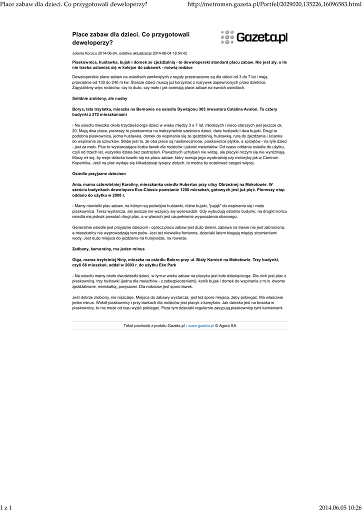 Place zabaw dla dzieci. Co przygotowali deweloperzy? hĴp://metromsn.gazeta.pl/Portfel/2029020,135226,16096583.html Place zabaw dla dzieci. Co przygotowali deweloperzy? Jolanta Korucu 2014-06-04, ostatnia aktualizacja 2014-06-04 18:54:42 Piaskownica, huśtawka, bujak i domek ze zjeŜdŜalnią - to deweloperski standard placu zabaw. Nie jest zły, o ile nie trzeba ustawiać się w kolejce do zabawek - mówią rodzice Deweloperskie place zabaw na osiedlach zamkniętych z reguły przeznaczone są dla dzieci od 3 do 7 lat i mają przeciętnie od 130 do 240 m kw. Starsze dzieci muszą juŜ korzystać z rozrywek zapewnionych przez dzielnice. Zapytaliśmy więc rodziców, czy to duŜo, czy mało i jak oceniają place zabaw na swoich osiedlach. Solidnie zrobiony, ale nudny Borys, tata trzylatka, mieszka na Bemowie na osiedlu Dywizjonu 303 inwestora Catalina Avalon. To cztery budynki z 272 mieszkaniami - Na osiedlu mieszka około trzydzieściorga dzieci w wieku między 3 a 7 lat, młodszych i nieco starszych jest jeszcze ok. 20. Mają dwa place, pierwszy to piaskownica na maksymalnie sześcioro dzieci, dwie huśtawki i dwa bujaki. Drugi to podobna piaskownica, jedna huśtawka, domek do wspinania się ze zjeŜdŜalnią, huśtawką, rurą do zjeŜdŜania i ścianka do wspinania ze sznurków. Słabe jest to, Ŝe oba place są nasłonecznione, piaskownice płytkie, a sprzętów - na tyle dzieci - jest za mało. Plus to wystarczająca liczba ławek dla rodziców i jakość materiałów. Od czasu oddania osiedla do uŜytku, czyli od trzech lat, wszystko działa bez zastrzeŜeń. PowaŜnych uchybień nie widzę, ale placyki niczym się nie wyróŜniają. Marzy mi się, by moje dziecko bawiło się na placu zabaw, który rozwija jego wyobraźnię czy motorykę jak w Centrum Kopernika. Jeśli na plac wydaje się kilkadziesiąt tysięcy złotych, to moŜna by oczekiwać czegoś więcej. Osiedle przyjazne dzieciom Ania, mama czteroletniej Karoliny, mieszkanka osiedla Hubertus przy ulicy ObrzeŜnej na Mokotowie. W sześciu budynkach dewelopera Eco-Classic powstanie 1200 mieszkań, gotowych jest juŜ pięć. Pierwszy etap oddano do uŜytku w 2008 r. - Mamy niewielki plac zabaw, na którym są podwójne huśtawki, róŜne bujaki, "pająk" do wspinania się i mała piaskownica. Teraz wystarcza, ale jeszcze nie wszyscy się wprowadzili. Gdy wybudują ostatnie budynki, na drugim końcu osiedla ma jednak powstać drugi plac, a w planach jest uzupełnienie wyposaŜenia obecnego. Generalnie osiedle jest przyjazne dzieciom - oprócz placu zabaw jest duŜo zieleni, zabawa na trawie nie jest zabroniona, a mieszkańcy nie wyprowadzają tam psów. Jest teŜ niewielka fontanna, dzieciaki latem biegają między strumieniami wody. Jest duŜo miejsca do jeŜdŜenia na hulajnodze, na rowerze. Zadbany, kameralny, ma jeden minus Olga, mama trzyletniej Niny, mieszka na osiedlu Bolero przy ul. Biały Kamień na Mokotowie. Trzy budynki, czyli 68 mieszkań, oddał w 2003 r. do uŜytku Eko Park - Na osiedlu mamy około dwudziestki dzieci, w tym w wieku zabaw na placyku jest koło dziesięciorga. Dla nich jest plac z piaskownicą, trzy huśtawki (jedna dla maluchów - z zabezpieczeniami), konik bujak i domek do wspinania z m.in. dwoma zjeŜdŜalniami, miniskałką, poręczami. Dla rodziców jest sporo ławek. Jest dobrze zrobiony, nie niszczeje. Miejsca do zabawy wystarcza, jest teŜ sporo miejsca, Ŝeby pobiegać. Ma właściwie jeden minus. Wokół piaskownicy i przy ławkach dla rodziców jest placyk z kamyków. Jak dziecko jest na bosaka w piaskownicy, to nie moŜe od razu wyjść pobiegać. Poza tym dzieciaki regularnie zasypują piaskownicę tymi kamieniami. Tekst pochodzi z portalu Gazeta.pl - www.gazeta.pl © Agora SA 1z1 2014.06.05 10:26