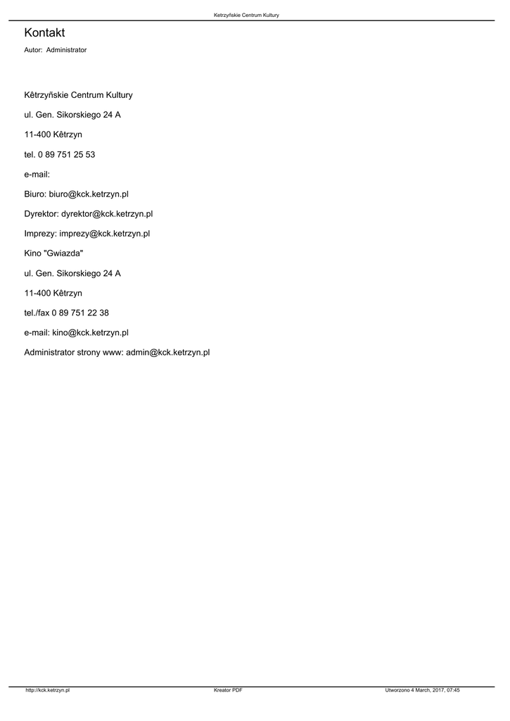 Ketrzyñskie Centrum Kultury Kontakt Autor: Administrator Kêtrzyñskie Centrum Kultury ul. Gen. Sikorskiego 24 A 11-400 Kêtrzyn tel. 0 89 751 25 53 e-mail: Biuro: [email protected] Dyrektor: [email protected] Imprezy: [email protected] Kino "Gwiazda" ul. Gen. Sikorskiego 24 A 11-400 Kêtrzyn tel./fax 0 89 751 22 38 e-mail: [email protected] Administrator strony www: [email protected] http://kck.ketrzyn.pl Kreator PDF Utworzono 4 March, 2017, 07:45