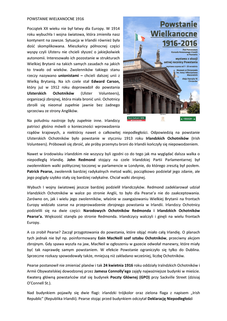 POWSTANIE WIELKANOCNE 1916 Początek XX wieku nie był łatwy dla Europy. W 1914 roku wybuchła I wojna światowa, która zmieniła nasz kontynent na zawsze. Sytuacja w Irlandii również była dość skomplikowana. Mieszkańcy północnej części wyspy czyli Ulsteru nie chcieli słyszeć o jakiejkolwiek autonomii. Interesowało ich pozostanie w strukturach Wielkiej Brytanii na takich samych zasadach na jakich to trwało od wieków. Zwolenników takiego stanu rzeczy nazywano unionistami – chcieli dalszej unii z Wielką Brytanią. Na ich czele stał Edward Carson, który już w 1912 roku doprowadził do powstania Ulsterskich Ochotników (Ulster Volunteers), organizacji zbrojnej, która miała bronić unii. Ochotnicy zbroili się nieomal zupełnie jawnie bez żadnego sprzeciwu ze strony Anglików. Na południu nastroje były zupełnie inne. Irlandzcy patrioci głośno mówili o konieczności wprowadzenia rządów krajowych, a niektórzy nawet o całkowitej niepodległości. Odpowiedzią na powstanie Ulsterskich Ochotników było powstanie w styczniu 1913 roku Irlandzkich Ochotników (Irish Volunteers). Próbowali się zbroić, ale próby przemytu broni do Irlandii kończyły się niepowodzeniem. Nawet w środowisku irlandzkim nie wszyscy byli zgodni co do tego jak ma wyglądać dalsza walka o niepodległą Irlandię. John Redmond stojący na czele Irlandzkiej Partii Parlamentarnej był zwolennikiem walki politycznej toczonej w parlamencie w Londynie, do którego zresztą był posłem. Patrick Pearse, zwolennik bardziej radykalnych metod walki, początkowo podzielał jego zdanie, ale jego poglądy szybko stały się bardziej radykalne. Chciał walki zbrojnej. Wybuch I wojny światowej jeszcze bardziej podzielił Irlandczyków. Redmond zadeklarował udział Irlandzkich Ochotników w walce po stronie Anglii, to było dla Pearse’a nie do zaakceptowania. Zarówno on, jak i wielu jego zwolenników, właśnie w zaangażowaniu Wielkiej Brytanii na frontach Europy widziało szanse na przeprowadzenie zbrojnego powstania w Irlandii. Irlandzcy Ochotnicy podzielili się na dwie części: Narodowych Ochotników Redmonda i Irlandzkich Ochotników Pearse’a. Większość stanęła po stronie Redmonda. Irlandczycy walczyli i ginęli na wielu frontach Europy. A co zrobił Pearse? Zaczął przygotowania do powstania, które objąć miało całą Irlandię. O planach tych jednak nie był np. poinformowany Eoin MacNeill szef sztabu Ochotników, przeciwny akcjom zbrojnym. Gdy spawa wyszła na jaw, MacNeil w ogłoszeniu w gazecie odwołał manewry, które miały być tak naprawdę samym powstaniem. W efekcie Powstanie ograniczyło się tylko do Dublina. Sprzeczne rozkazy spowodowały także, mniejszą niż zakładano wcześniej, liczbę Ochotników. Pearse postanowił nie zmieniać planów i tak 24 kwietnia 1916 roku oddziały Iralndzkich Ochotników i Armii Obywatelskiej dowodzonej przez Jamesa Connolly’ego zajęły najważniejsze budynki w mieście. Kwaterą główną powstańców stał się budynek Poczty Głównej (GPO) przy Sackville Street (dzisiaj O’Connell St.). Nad budynkiem pojawiły się dwie flagi: irlandzki trójkolor oraz zielona flaga z napisem „Irish Republic” (Republika Irlandii). Pearse stojąc przed budynkiem odczytał Deklarację Niepodległości jeden z najważniejszych dokumentów w irlandzkiej historii. Deklaracja ogłaszała powstanie niepodległej Republiki Irlandii. Anglicy zareagowali błyskawicznie. Do miasta ściągnięto dodatkowe posiłki i ciężką artylerię. Zaczął się ostrzał, po kilku dniach z budynku poczty głównej zostały tylko zewnętrzne ściany. Dowódcy z rannym Jamesem Connollym przenieśli się do budynku przy Moore Street. Tam podjęto decyzje o kapitulacji. Poinformować o tym gen. Lowe, dowódcę wojsk angielskich, poszła pielęgniarka Elizabeth O’Farrell. Brytyjczycy zażądali bezwarunkowej kapitulacji, którą złożył na ich ręce sam Pearse. Przywódcy i uczestnicy powstania zostali aresztowani. Ponad 1400 osób wywieziono do obozów w Walii. Często byli to ludzie, którzy nie mieli nic wspólnego z powstaniem. Część z nich została uwolniona jeszcze w grudniu 1916 roku. Wszyscy przywódcy powstania zostali skazani na karę śmierci. Wyroku nie wykonano tylko w dwóch przypadkach. Eamonn de Valera, późniejszy premier i prezydent Irlandii, urodził się w USA, był więc obywatelem amerykańskim. Brytyjczycy nie chcieli się narażać Amerykanom, karę śmierci zamieniono na karę dożywotniego więzienia. Ostatecznie zwolniono go z więzienia w czerwcu 1917 roku. Druga osobą, która uniknęła śmierci była Konstancja Markiewicz, kobieta wykraczająca poza swoje czasy. Doskonale wykształcona, pochodziła ze starej rodziny ze Sligo. Konstancja Markiewicz była oficerem Armii Obywatelskiej, dowodziła oddziałem, który zajął park St. Stephen’s Green. Ocaliła życie bo była kobietą, skazano ją również na dożywocie, ale podobnie jak de Valerę zwolniono ją w czerwcu 1917 na mocy wprowadzonej przez Anglików amnestii. Pozostałych przywódców powstania rozstrzelano na dziedzińcu więzienia Kilmainham. W miejscu gdzie ich stracono zawsze powiewa irlandzka flaga. Wszyscy zostali pochowani na terenie więzienia na Arbour Hill w Dublinie. Za ich grobem ustawiono ścianę, na której wyryto tekst Deklaracji Niepodległości. W zbiorowym grobie spoczywają: Patrick Pearse, James Connolly, Thomas J. Clarke, Éamonn Ceannt, Thomas Mac Donagh, Joseph Plunkett, Seán Mac Diarmada, Michael Mallin, Edward Daly, Michael O’Hanrahan, William Pearse, John MacBride, Con Colbert, Seán Huston. Jeden z przywódców został stracony poza Irlandią. Roger Casement starał się pozyskać dla powstania pomoc zbrojna ze strony Niemców. Fiasko tej misji było jednym z powodów, dla którego Eoin MacNeill chciał koniecznie nie dopuścić do wybuchu powstania. Casement został pojmany po tym jak dotarł do Irlandii, a ponieważ był obywat
