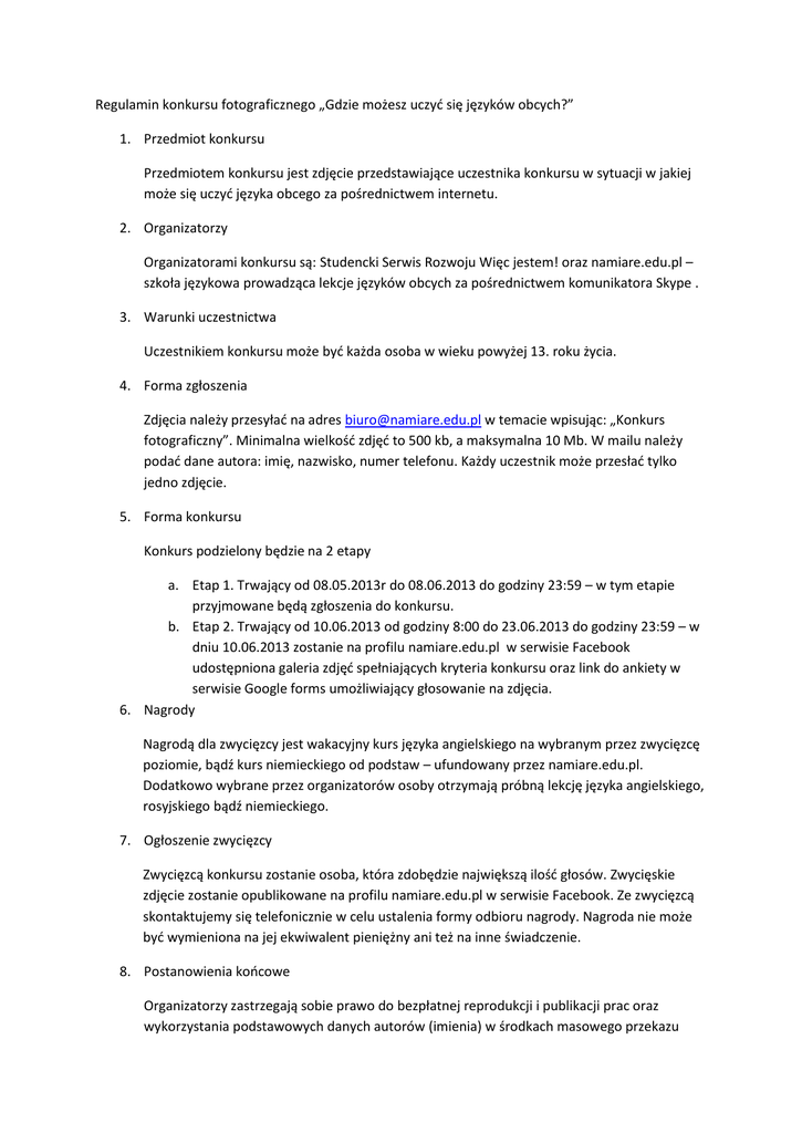 Regulamin konkursu fotograficznego „Gdzie możesz uczyć się języków obcych?” 1. Przedmiot konkursu Przedmiotem konkursu jest zdjęcie przedstawiające uczestnika konkursu w sytuacji w jakiej może się uczyć języka obcego za pośrednictwem internetu. 2. Organizatorzy Organizatorami konkursu są: Studencki Serwis Rozwoju Więc jestem! oraz namiare.edu.pl – szkoła językowa prowadząca lekcje języków obcych za pośrednictwem komunikatora Skype . 3. Warunki uczestnictwa Uczestnikiem konkursu może być każda osoba w wieku powyżej 13. roku życia. 4. Forma zgłoszenia Zdjęcia należy przesyłać na adres [email protected] w temacie wpisując: „Konkurs fotograficzny”. Minimalna wielkość zdjęć to 500 kb, a maksymalna 10 Mb. W mailu należy podać dane autora: imię, nazwisko, numer telefonu. Każdy uczestnik może przesłać tylko jedno zdjęcie. 5. Forma konkursu Konkurs podzielony będzie na 2 etapy a. Etap 1. Trwający od 08.05.2013r do 08.06.2013 do godziny 23:59 – w tym etapie przyjmowane będą zgłoszenia do konkursu. b. Etap 2. Trwający od 10.06.2013 od godziny 8:00 do 23.06.2013 do godziny 23:59 – w dniu 10.06.2013 zostanie na profilu namiare.edu.pl w serwisie Facebook udostępniona galeria zdjęć spełniających kryteria konkursu oraz link do ankiety w serwisie Google forms umożliwiający głosowanie na zdjęcia. 6. Nagrody Nagrodą dla zwycięzcy jest wakacyjny kurs języka angielskiego na wybranym przez zwycięzcę poziomie, bądź kurs niemieckiego od podstaw – ufundowany przez namiare.edu.pl. Dodatkowo wybrane przez organizatorów osoby otrzymają próbną lekcję języka angielskiego, rosyjskiego bądź niemieckiego. 7. Ogłoszenie zwycięzcy Zwycięzcą konkursu zostanie osoba, która zdobędzie największą ilość głosów. Zwycięskie zdjęcie zostanie opublikowane na profilu namiare.edu.pl w serwisie Facebook. Ze zwycięzcą skontaktujemy się telefonicznie w celu ustalenia formy odbioru nagrody. Nagroda nie może być wymieniona na jej ekwiwalent pieniężny ani też na inne świadczenie. 8. Postanowienia końcowe Organizatorzy zastrzegają sobie prawo do bezpłatnej reprodukcji i publikacji prac oraz wykorzystania podstawowych danych autorów (imienia) w środkach masowego przekazu informacji – prace i dane autorów będą publikowane wyłącznie w powiązaniu z konkursem. Nadesłane, nagrodzone i wyróżnione prace nie będą zwracane i przechodzą na własność organizatora konkursu. Prawa autorskie twórców tych prac zostają ograniczone na rzecz organizatorów dla swobodnego wystawiania i publikowania wszystkich we wszelkich materiałach i artykułach dotyczących konkursu i publikacjach dotyczących Więc Jestem! oraz namiare.edu.pl
