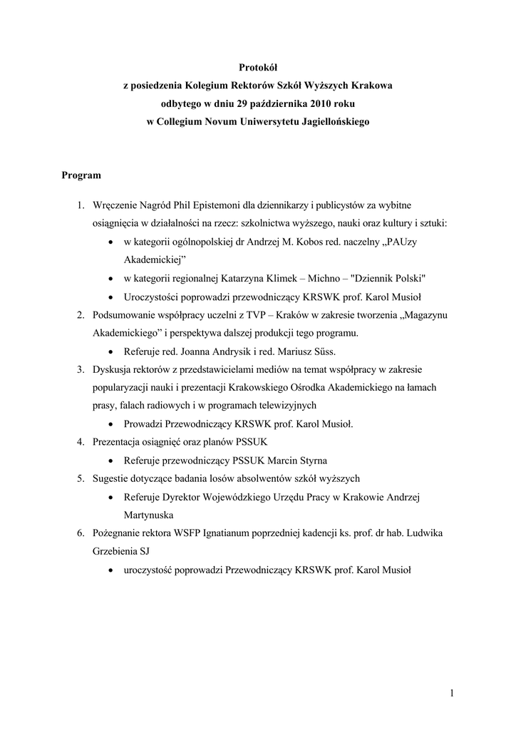 Protokół z posiedzenia Kolegium Rektorów Szkół Wyższych Krakowa odbytego w dniu 29 października 2010 roku w Collegium Novum Uniwersytetu Jagiellońskiego Program 1. Wręczenie Nagród Phil Epistemoni dla dziennikarzy i publicystów za wybitne osiągnięcia w działalności na rzecz: szkolnictwa wyższego, nauki oraz kultury i sztuki: • w kategorii ogólnopolskiej dr Andrzej M. Kobos red. naczelny „PAUzy Akademickiej” • w kategorii regionalnej Katarzyna Klimek – Michno – "Dziennik Polski" • Uroczystości poprowadzi przewodniczący KRSWK prof. Karol Musioł 2. Podsumowanie współpracy uczelni z TVP – Kraków w zakresie tworzenia „Magazynu Akademickiego” i perspektywa dalszej produkcji tego programu. • Referuje red. Joanna Andrysik i red. Mariusz Sűss. 3. Dyskusja rektorów z przedstawicielami mediów na temat współpracy w zakresie popularyzacji nauki i prezentacji Krakowskiego Ośrodka Akademickiego na łamach prasy, falach radiowych i w programach telewizyjnych • Prowadzi Przewodniczący KRSWK prof. Karol Musioł. 4. Prezentacja osiągnięć oraz planów PSSUK • Referuje przewodniczący PSSUK Marcin Styrna 5. Sugestie dotyczące badania losów absolwentów szkół wyższych • Referuje Dyrektor Wojewódzkiego Urzędu Pracy w Krakowie Andrzej Martynuska 6. Pożegnanie rektora WSFP Ignatianum poprzedniej kadencji ks. prof. dr hab. Ludwika Grzebienia SJ • uroczystość poprowadzi Przewodniczący KRSWK prof. Karol Musioł 1 Część I Uroczystość wręczenia Nagrody Phil Epistemoni – Przyjaciel Nauki Ad 1/ Przewodniczący KRSWK prof. Karol Musioł powitał wszystkich przybyłych na uroczystości wręczenia Nagród Phil Epistemoni – Przyjaciel Nauki, w tym szczególnie serdecznie laureatów tej nagrody. Podkreślił, że we współczesnym świecie niezmiernie ważne jest, aby informacja o tym, co się dzieje w pracowniach uczonych za publiczne pieniądze docierała do społeczeństwa i żeby to była informacja rzetelna. To nie jest proste zadanie, gdyż z jednej strony brakuje nam uczonych, którzy potrafią prosto wytłumaczyć swoje skomplikowane badania. Często nie mają na to ochoty lub lekceważą tę powinność. Wkrótce wnioski o nowe duże granty europejskie będą musiały zawierać strategię informowania społeczeństwa na co są przeznaczone przyznane w ramach tego grantu środki. Jest to niezwykle istotne, gdyż możliwe jest blokowanie wdrożenia nowych technologii ze względu na brak wiedzy na ich temat, z tego typu zjawiskiem mamy do czynienia w przypadku energetyki jądrowej. We Francji ponad 70% energii wytwarzanej jest w elektrowniach jądrowych, ale w Polsce i Niemczech panuje negatywna opinia na ich temat. Podobnie rzecz ma się w przypadku modyfikowanej genetycznie żywności. Trwa ożywiona dyskusja, ale bez oparcia w rzetelnej wiedzy na ten temat. Dlatego niezwykle istotne jest żeby używać prawdziwych argumentów, żeby ludzi nie straszyć, ale też nie być przesadnym optymistą. Połowa odpowiedzialności w tym zakresie spoczywa na uczonych a reszta na specjalistach od przekazywania informacji społeczeństwu – dziennikarzach, wydawcach, właścicielach mediów. Media odgrywają coraz większą role w społeczeństwie, ale wzrost ich znaczenia powinien być powiązany z odpowiedzialnością. Tak jak potrzebujemy nowego typu naukowca, który jest otwarty na popularyzację wiedzy za pośrednictwem mediów, tak potrzebny jest nowy typ dziennikarza, który potrafił będzie porozmawiać z naukowcem i czasem przetłumaczyć jego hermetyczny język na zrozumiały dla przeciętnego odbiorcy informacji medialnej. Taki program współpracy między światem mediów i światem nauki będzie tematem tego posiedzenia KRSWK. Nie jest to nowa tematyka, rektorzy od dawna doceniają bowiem znaczenie mediów, już w 1987 roku ustanowili nagrodę dla dziennikarzy za wybitne osiągnięcia w działalności na rzecz szkolnictwa wyższego, nauki oraz kultury i sztuki została. Dziś spotkanie rozpocznie się od wręczenia Nagrody Phil Epistemoni – Przyjaciel Nauki za lata 2008-2009. KRSWK przyznało tę Nagrodę w kategorii ogólnopolskiej dr Andrzejowi M. Kobosowi red. naczelnemu „PAUzy Akademickiej”, a w 2 kategorii środowiskowej pani red. Katarzynie Klimek-Michno z redakcji „Dziennika Polskiego”. Podziękował Marszałkowi Woj. Małopolskiego za przybycie na tę uroczystość i przypomniał, że obrady KRSWK będą miały dwie części. W pierwszej nastąpi uroczyste wręczenie wspomnianych Nagród a w drugiej robocza dyskusja z przedstawicielami mediów, na którą zaprosił do sali 30 rektorów i zaproszonych gości. Następnie odczytał tekst stosownej uchwały KRSWK Uchwała 1/1.07.2010 Kolegium Rektorów Szkół Wyższych Krakowa W sprawie przyznania Nagrody Phil Epistemoni za latach 2008-2009 Kolegium Rektorów Szkół Wyższych Krakowa na posiedzeniu w dniu 1 lipca 2010 roku po rozpatrzeniu przedstawionych kandydatur do Nagrody Phil Epistemoni – Przyjaciel Nauki za lata 2008-2009 postanowiło większością głosów przyznać: • Nagrodę Ogólnopolską Phil Epistemoni Dr Andrzejowi Kobosowi, red. naczelnemu „PAUzy Akademickie” stworzenie i redagowanie pierwszego polskiego tygodnika internetowego, poświęconego w całości sprawom nauki i szkolnictwa wyższego oraz dorobek dziennikarski, a szczególnie cykl wywiadów z wybitnymi uczonymi • Nagrodę Środowiskową Phil Epistemoni red. Katarzynie Klimek-Michno z „Dziennika Polskiego” za szczególną dbałość w prezentacji zagadnień związanych z szeroko pojętą edukacją oraz zaangażowanie w popularyzację rodzimej nauki Przedstawił sylwetkę laureata Ogólnopolskiej Nagrody Phil Epistemoni: „Dr Andrzej M. Kobos redaguje pierwszy polski tygodnik internetowy „PAUza Akademicka”, poświęcony w całości sprawom nauki i szkolnictwa wyższego. Jest to czasopismo interesujące i na wysokim poziomie, wychodzi regularnie. Począwszy od czerwca 2008 ro