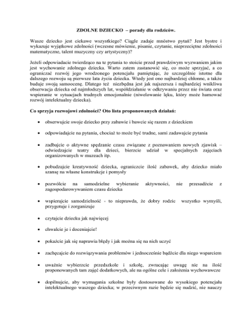ZDOLNE DZIECKO – porady dla rodziców. Wasze dziecko jest ciekawe wszystkiego? Ciągle zadaje mnóstwo pytań? Jest bystre i wykazuje wyjątkowe zdolności (wczesne mówienie, pisanie, czytanie, nieprzeciętne zdolności matematyczne, talent muzyczny czy artystyczny)? Jeżeli odpowiadacie twierdząco na te pytania to stoicie przed prawdziwym wyzwaniem jakim jest wychowanie zdolnego dziecka. Warto zatem zastanowić się, co może sprzyjać, a co ograniczać rozwój jego wrodzonego potencjału pamiętając, że szczególnie istotne dla dalszego rozwoju są pierwsze lata życia dziecka. Wtedy jest ono najbardziej chłonne, a także buduje swoją samoocenę. Dlatego też niezbędna jest jak najszersza i najbardziej wnikliwa obserwacja dziecka od najmłodszych lat, współdziałanie w odkrywaniu przez nie świata oraz wspieranie w sytuacjach trudnych emocjonalnie (niwelowanie lęku, który może hamować rozwój intelektualny dziecka). Co sprzyja rozwojowi zdolności? Oto lista proponowanych działań: obserwujcie swoje dziecko przy zabawie i bawcie się razem z dzieckiem odpowiadajcie na pytania, chociaż to może być trudne, sami zadawajcie pytania zadbajcie o aktywne spędzanie czasu związane z poznawaniem nowych zjawisk – odwiedzajcie teatry dla dzieci, bierzcie udział w specjalnych zajęciach organizowanych w muzeach itp. pobudzajcie kreatywność dziecka, ograniczcie ilość zabawek, aby dziecko miało szansę na własne konstrukcje i pomysły pozwólcie na samodzielne wybieranie zagospodarowywaniem czasu dziecka wspierajcie samodzielność - to nieprawda, że dobry rodzic przygotuje i zorganizuje czytajcie dziecku jak najwięcej chwalcie je i doceniajcie! pokażcie jak się naprawia błędy i jak można się na nich uczyć zachęcajcie do rozwiązywania problemów i jednocześnie bądźcie dla niego wsparciem uważnie wybierzcie przedszkole i szkołę, zwracając uwagę nie na ilość proponowanych tam zajęć dodatkowych, ale na ogólne cele i założenia wychowawcze dopilnujcie, aby wymagania szkolne były dostosowane do wysokiego potencjału intelektualnego waszego dziecka; w przeciwnym razie będzie się nudzić, nie nauczy aktywności, nie przesadźcie z wszystko wymyśli, się także uczyć, co w późniejszych latach szkolnych może skutkować zbyt niskimi osiągnięciami edukacyjnymi niewspółmiernymi z możliwościami współpracujcie ze szkołą, wykorzystajcie oferowaną pomoc i możliwości zarezerwowane dla waszego dziecka (indywidualny program nauki, indywidualny tok nauki, udział w zajęciach dodatkowych) wspierajcie emocjonalnie, gdyż wasze dziecko czuje presję otoczenia i lęk przed porażką, a często mierzy się z rywalizacją – konkursy, olimpiady itp. obserwujcie jak czuje się w grupie rówieśniczej. Dzieci zdolne często mają problemy społeczne wynikające z „inności” podczas gdy większość dzieci chce być taka jak wszyscy, a akceptacja rówieśnicza zaczyna mieć pierwszorzędne znaczenie. Czasem też mają trudności w przystosowaniu do grupy (chęć imponowania, dominowania, postawa rywalizacyjna) doceniacie sukcesy, a nie przeceniajcie ewentualnych porażek. POWODZENIA!