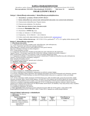 KARTA CHARAKTERYSTYKI Sporządzona zgodnie z Rozporządzeniem WE Nr 1907/2006 (REACH) oraz z Rozporządzeniem Komisji (UE) 453/2010 Data sporządzenia: 19.01.2011r. Data aktualizacji: 10.10.2015 r. Ilość stron: 1/6 wersja:2.0 SMAR LITOWY BIAŁY Sekcja 1. Identyfikacja mieszaniny i identyfikacja przedsiębiorstwa. 1.1 Identyfikator produktu: SMAR LITOWY BIAŁY 1.2 Istotne zidentyfikowane zastosowania substancji lub mieszaniny oraz zastosowania odradzane: 1.2.1 Zastosowania zidentyfikowane: Preparat smarny. 1.2.2 Zastosowania odradzane: Nie określono 1.3 Dane dotyczące dostawcy karty charakterystyki: 1.3.1Producent: Permatex Inc. USA 1.3.1 Dystrybutor: AMTRA Sp. z o.o. 1.3.2 Adres: ul. Schonów 3, 41-200 Sosnowiec 1.3.3 Telefon/Fax: +48 32 2944130 / + 48 32 2944134 1.3.4 Adres email osoby odpowiedzialnej za kartę charakterystyki: [email protected] 1.4 Numer telefonu alarmowego: +48 32 294 41 30 (w godzinach 800- 1500), 112 ( ogólny telefon alarmowy),998 Sekcja 2. Identyfikacja zagrożeń. 2.1 Klasyfikacja mieszaniny: 2.1.1. Zagrożenia dla człowieka: Produkt został sklasyfikowany jako niebezpieczny Asp. Tox.1- Zagrożenie spowodowane aspiracją, kategoria 1 H304-Połknięcie i dostanie się przez drogi oddechowe może grozić śmiercią Skin Irrit.2-Działąnie drażniące na skórę, kategoria 2 H315- Działa drażniąco na skórę 2.1.2 Zagrożenie dla środowiska: Produkt jest klasyfikowany jako niebezpieczny dla środowiska. Aquatic Chronic 1-Stwarzające zagrożenie dla środowiska wodnego, kategoria przewlekła, kategoria 1 H410- Działa bardzo toksycznie na organizmy wodne, powodując długotrwałe skutki 2.1.3 Zagrożenia wynikające z właściwości fizycznych i chemicznych: Produkt jest klasyfikowany jako niebezpieczny Aerosol 1-Wyrób aerozolowy łatwopalny, kategoria 1 H222- Skrajnie łatwopalny aerozol H229- Pojemnik pod ciśnieniem: ogrzanie grozi wybuchem 2.2. Elementy oznakowania: 2.2.1 Piktogramy określające rodzaj zagrożenia: 2.2.2 Hasła ostrzegawcze: NIEBEZPIECZEŃSTWO 2.2.3 Nazwy niebezpiecznych składników umieszczone na etykiecie: propan, heptan 2.2.4 Zwroty wskazujące rodzaj zagrożenia: H222-Skrajnie łatwopalny aerozol H229-Pojemnik pod ciśnieniem: ogrzanie grozi wybuchem H315-Działa drażniąco na skórę H410-Działa bardzo toksycznie na organizmy wodne, powodując długotrwałe skutki. 2.2.5 Zwroty wskazujące środki ostrożności: P210-Przechowywać z dala od źródeł ciepła, gorących powierzchni, źródeł iskrzenia, otwartego ognia i innych źródeł zapłonu. Nie palić P211-Nie rozpylać nad otwartym ogniem lub innym źródłem zapłonu P251-Nie przekłuwać ani nie spalać, nawet po zużyciu P410+P412-Chronić przed światłem słonecznym. Nie wystawiać na działanie temperatury przekraczającej 50 °C/122 °F P280-Stosować rękawice ochronne/ odzież ochronną/ ochronę oczu/ ochronę twarzy P302+P352-W PRZYPADKU KONTAKTU ZE SKÓRĄ: Umyć dużą ilością wody z mydłem. P273-Unikać uwolnienia do środowiska. 2.2.6 Dodatkowe informacje: Nie dotyczy 2.3 Inne zagrożenia: Brak informacji na temat spełniania kryteriów PBT lub vPvB zgodnie z załącznikiem XIII Rozporządzenia Komisji (UE) Nr 253/2011 z dnia 15 marca 2011r. Badania nie zostały przeprowadzone. Sekcja3.Skład i informacje o składnikach 3.1 Substancje: Nie dotyczy 3.2 Mieszaniny: Nazwa chemiczna składnika Zakres stężeń Numer CAS Numer WE Klasyfikacja wg 1272/2008/WE Destylaty ciężkie naftenowe, rafinowane rozpuszczalnikiem (ropa naftowa) Olej bazowy - 15%-40% 64741-96-4 265-097-6 Nota L KARTA CHARAKTERYSTYKI Sporządzona zgodnie z Rozporządzeniem WE Nr 1907/2006 (REACH) oraz z Rozporządzeniem Komisji (UE) 453/2010 Data sporządzenia: 19.01.2011r. Data aktualizacji: 10.10.2015 r. Ilość stron: 2/6 wersja:2.0 SMAR LITOWY BIAŁY niespecyfikowany Destylaty lekkie obrabiane wodorem (ropa naftowa). Frakcja naftowaniespecyfikowana Propan 15%-40% 64742-52-5 265-155-0 Nota L 10%-30% 74-98-6 200-827-9 Destylaty lekkie obrabiane wodorem (ropa naftowa) Frakcja naftowa niespecyfikowana Heptan 10%-30% 64742-47-8 265-149-8 Flam. Gas.1 Press. Gas, H220 Nota U Asp. Tox.1, H304 1%-10% 142-82-5 205-563-8 Tlenek cynku 0,5%-1,5% 1314-13-2 215-222-5 Flam. Liq.2, H225 Asp. Tox.1, H304 Skin Irrit.2, H315 STOT SE 3, H336 Aquatic Acute 1, H400 Aquatic Chronic 1, H410 Aquatic Acute 1, H400 Aquatic Chronic 1, H410 SEKCJA 4. ŚRODKI PIERWSZEJ POMOCY 4.1 Opis środków pierwszej pomocy: 4.1.1 Połknięcie: W razie połknięcia przepłukać jamę ustną, wyjąć protezy dentystyczne jeśli są. Przetransportować do najbliższej placówki medycznej celem podjęcia leczenia. Nie wywoływać wymiotów. Pokazać opakowanie lub etykietę. Jeśli wystąpią spontanicznie wymioty, trzymać głowę poniżej bioder. 4.1.2. Zatrucie inhalacyjne: Wynieść poszkodowanego z miejsca narażenia i zapewnić dostęp świeżego powietrza oraz spokój i odpoczynek. W przypadku dolegliwości (kaszel, wymioty, zawroty głowy, świszczący oddech) zapewnić pomoc lekarską. Nieprzytomnego ułożyć w pozycji bocznej. 4.1.3. Skażenie skóry: Zdjąć skażoną odzież. Skórę zmyć ciepłą wodą z mydłem. W razie wystąpienia podrażnienia skóry skontaktować się z lekarzem. 4.1.4.Skażenie oczu: Jeżeli poszkodowany nosi szkła kontaktowe niezwłocznie je wyjąć. Dokładnie przemyć oczy dużą ilością wody, wywijając powieki. Zapewnić pomoc okulisty. Uwaga: osoby narażone na skażenie oczu powinny być pouczone o konieczności i sposobie natychmiastowego płukania oczu 4.2 Najważniejsze ostre i opóźnione objawy oraz skutki narażenia: 4.2.1 Skażenie oczu: Może wystąpić podrażnienie, zaczerwienienie oraz łzawienie 4.2.2 Połknięcie: Mogą pojawić się mdłości, wymioty oraz ból brzucha 4.2.3 Kontakt ze skórą: Może wystąpić podrażnienie skóry. 4.3 Wskazania dotyczące wszelkiej natychmiastowej pomocy lekarskiej i szczególnego postępowania z poszkodowanym: Leczenie objawowe. SEK