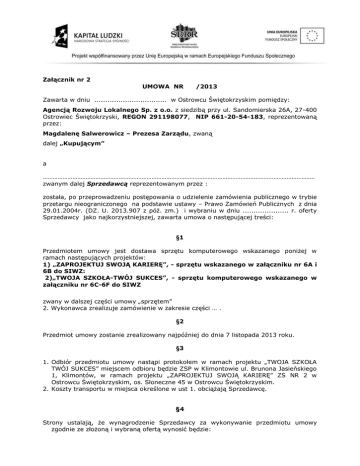 Załącznik nr 2 UMOWA NR /2013 Zawarta w dniu ................................. w Ostrowcu Świętokrzyskim pomiędzy: Agencją Rozwoju Lokalnego Sp. z o.o. z siedzibą przy ul. Sandomierska 26A, 27-400 Ostrowiec Świętokrzyski, REGON 291198077, NIP 661-20-54-183, reprezentowaną przez: Magdalenę Salwerowicz – Prezesa Zarządu, zwaną dalej „Kupującym” a ………………………………………………………………………………………………………………………………………………… zwanym dalej Sprzedawcą reprezentowanym przez : została, po przeprowadzeniu postępowania o udzielenie zamówienia publicznego w trybie przetargu nieograniczonego na podstawie ustawy – Prawo Zamówień Publicznych z dnia 29.01.2004r. (DZ. U. 2013.907 z póź. zm.) i wybraniu w dniu ..................... r. oferty Sprzedawcy jako najkorzystniejszej, zawarta umowa o następującej treści: §1 Przedmiotem umowy jest dostawa sprzętu komputerowego wskazanego poniżej w ramach następujących projektów: 1) „ZAPROJEKTUJ SWOJĄ KARIERĘ”, - sprzętu wskazanego w załączniku nr 6A i 6B do SIWZ: 2)„TWOJA SZKOŁA-TWÓJ SUKCES”, - sprzętu komputerowego wskazanego w załączniku nr 6C-6F do SIWZ zwany w dalszej części umowy „sprzętem” 2. Wykonawca zrealizuje zamówienie w zakresie części … . §2 Przedmiot umowy zostanie zrealizowany najpóźniej do dnia 7 listopada 2013 roku. §3 1. Odbiór przedmiotu umowy nastąpi protokołem w ramach projektu „TWOJA SZKOŁA TWÓJ SUKCES” miejscem odbioru będzie ZSP w Klimontowie ul. Brunona Jasieńskiego 1, Klimontów, w ramach projektu „ZAPROJEKTUJ SWOJĄ KARIERĘ” ZS NR 2 w Ostrowcu Świętokrzyskim, os. Słoneczne 45 w Ostrowcu Świętokrzyskim. 2. Koszty transportu w miejsca określone w ust 1. obciążają Sprzedawcę. §4 Strony ustalają, że wynagrodzenie Sprzedawcy za wykonywanie przedmiotu umowy zgodnie ze złożoną i wybraną ofertą wynosić będzie: netto ……………….zł (słownie:……………………………………………..……), brutto ………….…..zł (słownie:………………………………………………….) 3.Strony ustalają, iż wynagrodzenie Sprzedawcy zostanie wypłacone na podstawie faktury przelewem w ciągu 30 dni od daty złożenia prawidłowo wystawionej faktury z zastrzeżeniem wydłużenia terminu płatności do czasu otrzymania środków od Instytucji Pośredniczącej. 2. Podstawą wystawienia faktury przez Sprzedawcę będzie protokół odbioru sprzętu wystawiony w terminie określonym w §2, zawierający oświadczenie Sprzedawcy, że sprzęt jest wolny od wad, jego rodzaj i ilość są zgodne z ofertą Sprzedawcy (kopia Oferty stanowi załącznik do niniejszej umowy), a także stwierdzający ewentualne naliczenie przez Kupującego kar umownych, z podaniem ich wysokości i przyczyny naliczenia. Kwota kar umownych zostanie potrącona z faktury wystawionej przez Sprzedającego na kwotę brutto określoną w ust. 2. Potrącenie nastąpi na podstawie noty księgowej wystawionej przez Kupującego. §5 Strony ustalają, że osobą odpowiedzialną za przedmiot umowy z ramienia Sprzedawcy będzie: p............................................................................a z ramienia Kupującego p. ...................... §6 1. Strony ustalają, że na sprzęt komputerowy Sprzedawca udziela 2 letniej rękojmi i 2 letniej gwarancji producenta na pozostałe sprzęty na okres wskazany przez producenta. 2. Upływ okresu rękojmi i gwarancji, o której mowa w ust.1, liczy się od daty protokolarnego odbioru sprzętu komputerowego. 3. Czas reakcji serwisowej strony ustalają na 24 godziny ( liczone w dni robocze) od czasu zgłoszenia awarii sprzętu. 4. Czas naprawy sprzętu strony ustalają na 48 godzin od pierwszego zgłoszenia awarii. 5. W przypadku konieczności dłuższej naprawy, Sprzedający zobowiązuje się dostarczyć zamienny sprzęt w ciągu 48 godzin( liczonych w dni robocze ) od pierwszego zgłoszenia awarii. 6. Na zakupione oprogramowanie Sprzedający udziela Kupującemu licencji, zgodnie z warunkami licencji producenta oprogramowania. §7 1. Strony ustalają odpowiedzialność za niewykonanie lub nienależyte wykonanie umowy w formie kar umownych w następujących wypadkach i wysokościach: 1) Sprzedawca zapłaci Kupującemu kary umowne: a) za zwłokę w wykonaniu przedmiotu umowy - w wysokości 0,5 % wynagrodzenia brutto określonego w § 4 ust. 2, za każdy dzień zwłoki, b) z tytułu odstąpienia przez Kupującego od umowy z przyczyn zależnych od Sprzedającego - w wysokości 10 % wartości wynagrodzenia brutto określonego w § 4 ust. 2. c) za zwłokę w reakcji serwisowej i dostarczeniu zamiennego sprzętu komputerowego w przypadkach określonych w §6 ust.3, 4 i 5 - w wysokości 0,04 % wynagrodzenia brutto określonego w § 4 ust. 2, za każdy dzień zwłoki, 2) Kupujący zobowiązany jest zapłacić Sprzedawcy karę umowną z tytułu odstąpienia od umowy z przyczyn zależnych od Kupującego - w wysokości 10 % wartości wynagrodzenia brutto określonego w § 4 ust. 2. 2. W przypadku gdy kary umowne, o których mowa w ust.1, nie zrekompensują w pełni poniesionej szkody, strony opuszczają możliwość dochodzenia odszkodowania uzupełniającego na zasadach ogólnych. §8 1. Zakazuje się istotnych zmian postanowień zawartej umowy za wyjątkiem okoliczności oraz warunków zmian określonych w § 9. 2. Zmiana umowy dokonana z naruszeniem przepisu § 9 jest nieważna. 3. W razie zaistnienia istotnej zmiany okoliczności powodującej, że wykonanie umowy nie leży w interesie publicznym, czego nie można było przewidzieć w chwili zawarcia umowy, Kupujący może odstąpić od umowy w terminie 30 dni od powzięcia wiadomości o tych okolicznościach. W takim przypadku, Sprzedający może żądać wyłącznie wynagrodzenia należnego z tytułu wykonania części umowy. §9 1. Strony nie przewidują istotnych zmian postanowień 