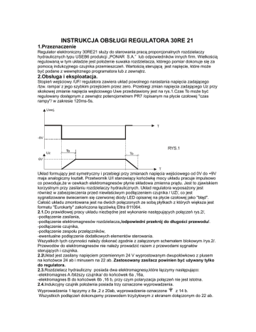 INSTRUKCJA OBSŁUGI REGULATORA 30RE 21 1.Przeznaczenie Regulator elektroniczny 30RE21 służy do sterowania pracą proporcjonalnych rozdzielaczy hydraulicznych typu USEB6 produkcji „PONAR S.A.” lub odpowiedników innych firm. Wielkością regulowaną w tym układzie jest położenie suwaka rozdzielacza, którego pomiar dokonuje się za pomocą indukcyjnego czujnika przemieszczeń. Wartością sterującą jest napięcie, które może być podane z wewnętrznego programatora lub z zewnątrz. 2.Obsługa i eksploatacja. Stopień wejściowy /UF/ regulatora zawiera układ powolnego narastania napięcia zadającego /tzw. rampa/ z jego szybkim przejściem przez zero. Przebiegi zmian napięcia zadającego Uz przy skokowej zmianie napięcia wejściowego Uwe przedstawiony jest na rys.1.Czas To może być regulowany dostępnym z zewnątrz potencjometrem PR7 /opisanym na płycie czołowej "czas rampy"/ w zakresie 120ms-5s. Uwej. T -9V Uz To RYS.1 To 6V T Układ formujący jest symetryczny i przebiegi przy zmianach napięcia wejściowego od 0V do +9V maja analogiczny kształt. Przetwornik U/I stanowiący końcówkę mocy układu pracuje impulsowo co powoduje,że w cewkach elektromagnesów płynie składowa zmienna prądu. Jest to zjawiskiem korzystnym przy zasilaniu rozdzielaczy hydraulicznych. Układ regulatora wyposażony jest również w zabezpieczenia przed niewłaściwym podłączeniem czujnika / UZ/, co jest sygnalizowane świeceniem się czerwonej diody LED opisanej na płycie czołowej jako "błąd". Całość układu zmontowana jest na dwóch połączonych ze sobą płytkach z których większa jest formatu "Eurokarty" zakończona łączówką Eltra 811064. 2.1.Do prawidłowej pracy układu niezbędne jest wykonanie następujących połączeń rys.2/, -podłączenie zasilania, -podłączenie elektromagnesów rozdzielacza,/odpowiedni przekrój do długości przewodu/. -podłączenie czujnika, -podłączenie zespołu przełączników, -ewentualne podłączenie dodatkowych elementów sterowania. Wszystkich tych czynności należy dokonać zgodnie z załączonym schematem blokowym /rys.2/. Przewodów do elektromagnesów nie należy prowadzić razem z przewodami sygnałów sterujących i czujnika. 2.2Układ jest zasilany napięciem przemiennym 24 V wyprostowanym dwupołówkowo z plusem na końcówce 24 ab i minusem na 22 ab. Zastosowany zasilacz powinien być używany tylko do regulatora. 2.3.Rozdzielacz hydrauliczny posiada dwa elektromagnesy,które łączymy następująco: -elektromagnes A /bliższy czujnika/ do końcówek 6a ,16a, -elektromagnes B do końcówek 6b ,16 b, przy czym polaryzacja połączeń nie jest istotna. 2.4.Indukcyjny czujnik położenia posiada trzy oznaczone wyprowadzenia. Wyprowadzenia 1 łączymy z 8a ,2 z 20ab, wyprowadzenie oznaczone z 14 b. Wszystkich podłączeń dokonujemy przewodem trzyżyłowym z ekranem dołączonym do 22 ab. 2.5.Zespół przełączników W1-W4 należy podłączyć zależnie od wybranego sposobu sterowania regulatorem,które odbywa się poprzez podanie napięcia UL /pobranego z końcówki 2 a / na sterowanie odpowiednich przełączników elektronicznych. Przełączniki W1-W4 powinny tworzyć zespół zależny i służą do wybierania żądanej sekcji programatora co jest sygnalizowane świeceniem się jednej z czterech diod LED D1-D4 na płycie czołowej. Jeżeli żaden z nich nie jest załączony to napięcie Uz przyjmuje wartość 0V. Przełącznik W5 służy do wyłączania opóżnienia rampy. Przełącznik W6 zmienia polaryzację napięcia 9V na końcówce 2b . Oba przełączniki W5 i W6 powinny być niezależne i stabilne. Zależnie od potrzeb po dokonaniu odpowiednich połączeń do zasilania potencjometrów P1-P4 możemy wykorzystywać napięcie o zmieniającej się polaryzacji z końcówki 2b lub napięcia o stałej polaryzacji z końcówek 18b /+9V / lub 20 ab /- 9V / .Przy wybieraniu znaku napięcia należy wziąć pod uwagę ,że napięcie wejściowe + 9V powoduje ujemny znak napięcia zadającego Uz /mierzonego na końcówce 8b / i przesuwanie się suwaka rozdzielacza w kierunku do czujnika /działa elektromagnes B /.Napięcie Um odpowiadające temu przesunięciu jest dodatnie /końcówka 4a /.Dla napięcia wejściowego -9V sytuacja jest odwrotna. Zakres przemieszczeń suwaka rozdzielacza wynosi około 3 mm co odpowiada zmianom napięcia Um w granicach około 6V. Podczas dokonywania w/w połączeń należy mieć na uwadze, że obciążalność prądowa końcówek 2b, 18ab ,20ab -nie może przekroczyć 20 mA. 2.6.Prezentowany układ regulatora stwarza również inne możliwości sterowania: -sterowanie zewnętrznym napięciem z przedziału -9V : +9V odniesionym do masy układu /12b / odbywa się poprzez dołączenie go do wejść wybranych potencjometrów P1-P4 skręconych na maksimum. Przy takim podłączeniu w dalszym ciągu korzysta się z przełączników W1-W4. -sterowanie napięciem bezpotencjałowym -10V + +10V może odbywać się tylko alternatywnie poprzez podanie go na wejście różnicowe /końcówki 10a i 12a /.Programator wtedy nie pracuje i przełączniki W1-W4 są zbędne. W przypadku nie korzystania z wejścia bezpotencjałowego końcówki 10a i 12a powinny być zwarte krótkim przewodem. -dodatkowe możliwości stwarza również układ sterowania pracą rampy. Do końcówek 18a i 4b można dołączyć dodatkowy przełącznik lub styki przekażnika pozwalające na zwieranie rampy niezależnie od przełącznika W5.W przypadku, gdy istnieje potrzeba ustawiania czasów rampy poza płytką,do końcówek 18a i 4b można dołączyć dodatkowy potencjometr /potencjometr /PR7 skręcony na max. / 2.7.Dostarczony regulator jest fabrycznie zestrojony. Nie zaleca się przeprowadzania jakichkolwiek samodzielnych regulacji i przeróbek. 3.DANE TECHNICZNE - napięcie zasilania /wyprostowane dwupołówkowo/ 24V - pobór mocy max. 35 VA - czas regulacji min. 120 ms max. 5 sek. - nieliniowość 1% - współczynnik temp. 0.05 *C - temp