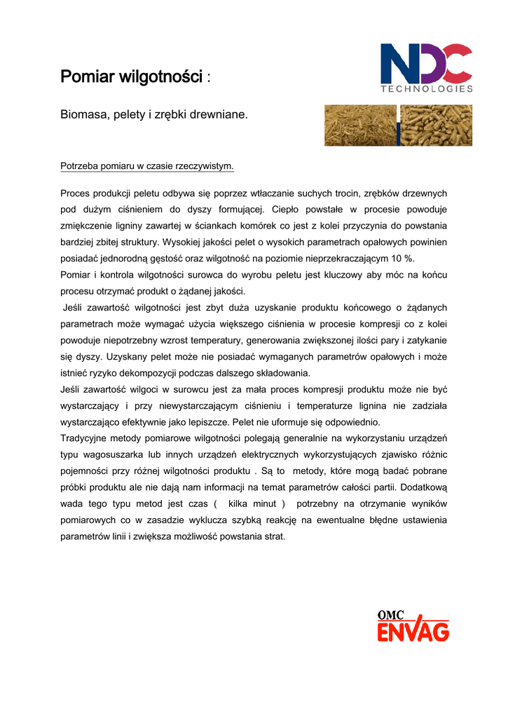 Pomiar wilgotności : Biomasa, pelety i zrębki drewniane. Potrzeba pomiaru w czasie rzeczywistym. Proces produkcji peletu odbywa się poprzez wtłaczanie suchych trocin, zrębków drzewnych pod dużym ciśnieniem do dyszy formującej. Ciepło powstałe w procesie powoduje zmiękczenie ligniny zawartej w ściankach komórek co jest z kolei przyczynia do powstania bardziej zbitej struktury. Wysokiej jakości pelet o wysokich parametrach opałowych powinien posiadać jednorodną gęstość oraz wilgotność na poziomie nieprzekraczającym 10 %. Pomiar i kontrola wilgotności surowca do wyrobu peletu jest kluczowy aby móc na końcu procesu otrzymać produkt o żądanej jakości. Jeśli zawartość wilgotności jest zbyt duża uzyskanie produktu końcowego o żądanych parametrach może wymagać użycia większego ciśnienia w procesie kompresji co z kolei powoduje niepotrzebny wzrost temperatury, generowania zwiększonej ilości pary i zatykanie się dyszy. Uzyskany pelet może nie posiadać wymaganych parametrów opałowych i może istnieć ryzyko dekompozycji podczas dalszego składowania. Jeśli zawartość wilgoci w surowcu jest za mała proces kompresji produktu może nie być wystarczający i przy niewystarczającym ciśnieniu i temperaturze lignina nie zadziała wystarczająco efektywnie jako lepiszcze. Pelet nie uformuje się odpowiednio. Tradycyjne metody pomiarowe wilgotności polegają generalnie na wykorzystaniu urządzeń typu wagosuszarka lub innych urządzeń elektrycznych wykorzystujących zjawisko różnic pojemności przy różnej wilgotności produktu . Są to metody, które mogą badać pobrane próbki produktu ale nie dają nam informacji na temat parametrów całości partii. Dodatkową wada tego typu metod jest czas ( kilka minut ) potrzebny na otrzymanie wyników pomiarowych co w zasadzie wyklucza szybką reakcję na ewentualne błędne ustawienia parametrów linii i zwiększa możliwość powstania strat. Pomiar i kontrola parametrów procesu w czasie rzeczywistym jaki oferuje firma NDC Technologies oparty na metodzie podczerwieni ( NIR) zapewnia naszym Klientom poziom informacji o procesie niemożliwy do uzyskania dzięki innym sposobom. Dzięki głowicy pomiarowej CM710 E uzyskujemy stały, bardzo dokładny i stabilny pomiar wilgotności w czasie rzeczywistym, który może posłużyć do kontroli i optymalizacji parametrów procesu. Najważniejsze korzyści wynikające z zastosowania tego typu rozwiązania. Zwiększona jakość produktu końcowego i wydajności procesu Zmniejszenie ilości koniecznych zatrzymań prasy z powodu niewłaściwych ustawień. Zmniejszenie kosztów oraz zmniejszenie emisji poprze lepszą kontrolę poszczególnych stopni procesu. Miejsce dokonywania pomiarów Z uwagi na bardzo istotna rolę jaką odgrywa poziom wilgotności w surowcu przeznaczonym w produkcji peletu głowice pomiarowe najczęściej umieszcza się nad dostarczanym surowcem( pasy transmisyjne) na etapach przed i po suszeniu. ( Zdjęcie poniżej) Drugim sposobem pomiaru jest umieszczenie głowicy wraz urządzeniem do poboru próbki (Powder Vision sampling cup) w miejscu gdzie może to być bardziej użyteczne dla kontroli procesu. Próbka materiału wpada do specjalnie zaprojektowanego uchwytu, gdzie następuje pomiar ( głowica pomiarowa) i próbka zostaje usunięta poprzez wydmuch sprężonego powietrza. Następna próbka jest mierzona. Pobór próbki Widok okna pomiarowego Próbka po pomiarze zostaje usunięta i pobierana jest nowa próbka. Demonstracja wyników. Aby pokazać rozkład przykładowych pomiarów zbadano różnego rodzaju próbki zrębków o wysokiej i niskiej zawartości wilgoci. Dla każdego typu produktu wynik uzyskany dzięki głowicy pomiarowej został porównany z danymi uzyskanymi dzięki metodzie referencyjnej – wagosuszarka ( 2 godziny w temperaturze 120C ) Wyniki pokazane zostały poniżej. Podsumowanie Dla każdego typu pomiaru oraz zakresu pomiarowego widać doskonałą korelację pomiędzy wynikami uzyskanymi dzięki referencyjnej metodzie pomiarowej oraz wynikami uzyskanymi dzięki głowicy pomiarowej CM710E. Wyniki charakteryzują się bardzo dużą stabilnością . Dokładność pomiarów – dla zakresu wilgotności od 1 do 50 % oczekiwana dokładność 2Ƃ(sigma) to +/- 0,5 %. Dla zakresu wilgotności od 40 do 80 % oczekiwana dokładność 2Ƃ(sigma) to +/- 1 %. Podstawowe cechy systemu - Nowoczesny system oparty na opatentowanych rozwiązaniach, stworzony aby zapewnić Klientowi dokładny i wiarygodny pomiar. - System jest nie czuły na zmiany temperatury, wilgotności i oświetlenia otoczenia. Pomiar jest dokładny i wiarygodny. - Najwyższa dokładność pomiaru, stabilność i odporność na zakłócenia - Niskie koszty obsługi - Bardzo duża trwałość i bezawaryjność. - Profesjonalny serwis na terenie Polski Wyłączny dystrybutor OMC ENVAG Sp. z o.o. Ul. Iwonicka 21 02-924 Warszawa www.envag.com.pl kontakt e-mail: [email protected] , [email protected]
