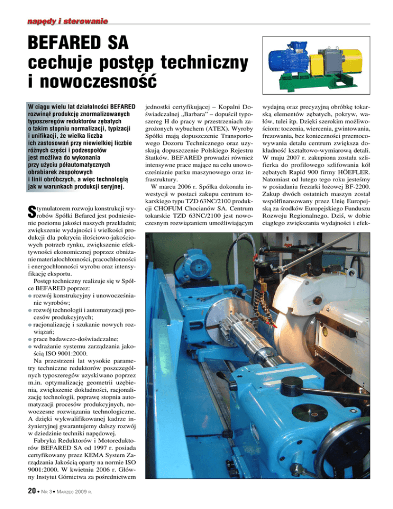 BEFARED SA cechuje postęp techniczny i nowoczesność W ciągu wielu lat działalności BEFARED rozwinął produkcję znormalizowanych typoszeregów reduktorów zębatych o takim stopniu normalizacji, typizacji i unifikacji, że wielka liczba ich zastosowań przy niewielkiej liczbie różnych części i podzespołów jest możliwa do wykonania przy użyciu półautomatycznych obrabiarek zespołowych i linii obróbczych, a więc technologią jak w warunkach produkcji seryjnej. S tymulatorem rozwoju konstrukcji wyrobów Spółki Befared jest podniesienie poziomu jakości naszych przekładni; zwiększenie wydajności i wielkości produkcji dla pokrycia ilościowo-jakościowych potrzeb rynku, zwiększenie efektywności ekonomicznej poprzez obniżanie materiałochłonności, pracochłonności i energochłonności wyrobu oraz intensyfikację eksportu. Postęp techniczny realizuje się w Spółce BEFARED poprzez: l rozwój konstrukcyjny i unowocześnianie wyrobów; l rozwój technologii i automatyzacji procesów produkcyjnych; l racjonalizację i szukanie nowych rozwiązań; l prace badawczo-doświadczalne; l wdrażanie systemu zarządzania jakością ISO 9001:2000. Na przestrzeni lat wysokie parametry techniczne reduktorów poszczególnych typoszeregów uzyskiwano poprzez m.in. optymalizację geometrii uzębienia, zwiększenie dokładności, racjonalizację technologii, poprawę stopnia automatyzacji procesów produkcyjnych, nowoczesne rozwiązania technologiczne. A dzięki wykwalifikowanej kadrze inżynieryjnej gwarantujemy dalszy rozwój w dziedzinie techniki napędowej. Fabryka Reduktorów i Motoreduktorów BEFARED SA od 1997 r. posiada certyfikowany przez KEMA System Zarządzania Jakością oparty na normie ISO 9001:2000. W kwietniu 2006 r. Główny Instytut Górnictwa za pośrednictwem 20 l Nr 3 l Marzec 2009 r. jednostki certyfikującej – Kopalni Doświadczalnej „Barbara” – dopuścił typoszereg H do pracy w przestrzeniach zagrożonych wybuchem (ATEX). Wyroby Spółki mają dopuszczenie Transportowego Dozoru Technicznego oraz uzyskują dopuszczenie Polskiego Rejestru Statków. BEFARED prowadzi również intensywne prace mające na celu unowocześnianie parku maszynowego oraz infrastruktury. W marcu 2006 r. Spółka dokonała inwestycji w postaci zakupu centrum tokarskiego typu TZD 63NC/2100 produkcji CHOFUM Chocianów SA. Centrum tokarskie TZD 63NC/2100 jest nowoczesnym rozwiązaniem umożliwiającym wydajną oraz precyzyjną obróbkę tokarską elementów zębatych, pokryw, wałów, tulei itp. Dzięki szerokim możliwościom: toczenia, wiercenia, gwintowania, frezowania, bez konieczności przemocowywania detalu centrum zwiększa dokładność kształtowo-wymiarową detali. W maju 2007 r. zakupiona została szlifierka do profilowego szlifowania kół zębatych Rapid 900 firmy HÖEFLER. Natomiast od lutego tego roku jesteśmy w posiadaniu frezarki łożowej BF-2200. Zakup dwóch ostatnich maszyn został współfinansowany przez Unię Europejską za środków Europejskiego Funduszu Rozwoju Regionalnego. Dziś, w dobie ciągłego zwiększania wydajności i efek- Fabryka Reduktorów i Motoreduktorów BEFARED S.A. Nr 3 l Marzec 2009 r. l 21 tywności produkcji, nie wystarcza zastosowanie standardowych i katalogowych wyrobów. Dlatego, oprócz produkcji podstawowej, fundamentalne staje się wykonawstwo przekładni specjalnych, pozakatalogowych. BEFARED SA od kilku lat wyspecjalizował się w projektowaniu i wytwarzaniu aplikacji niestandardowych: zespoły napędowe dużej mocy (powyżej 320 kW) oraz przekładnie na specjalne zamówienie klienta stały się domeną Spółki. Elastyczność BEFARED SA i chęć stosowania dodatkowych, nowatorskich rozwiązań pozwala na zachowanie silnej pozycji na rynku. Odzwierciedleniem tego jest wzrost sprzedaży naszych wyrobów zarówno do odbiorców krajowych, jak i zagranicznych. Pragnąc zapewnić Państwu jeszcze większe poczucie niezawodności w użyt- 22 l Nr 3 l Marzec 2009 r. kowaniu naszych urządzeń, Spółka BEFARED pragnie poinformować, że od 1 lutego 2009 r. został uruchomiony serwis fabryczny, którego zadaniem jest błyskawiczna reakcja w przypadku problemów z reduktorem w ramach obsługi gwarancyjnej i pogwarancyjnej. Ponadto serwis fabryczny BEFARED zapewnia: l obsługę serwisową użytkowanych przekładni w miejscu ich zamontowania; l remonty wszelkich przekładni (zarówno produkcji BEFARED, jak i innych producentów); l montaż zespołów napędowych na urządzeniach (wraz z demontażem zużytych przekładni); l utrzymanie ruchu przekładni oraz urządzeń „okołonapędowych”; l monitoring pracy przekładni; s ystematycznie uzupełniany magazyn części zamiennych; l doradztwo techniczne i ekspertyzę napędów. Gwarantujemy wysoką jakość usług, dyspozycyjność, fachową obsługę oraz elastyczne warunki współpracy. Serdecznie zapraszamy do współpracy. n l Fabryka Reduktorów i Motoreduktorów BEFARED SA ul. Grażyńskiego 71 43-300 Bielsko-Biała tel. 033-812 60 31 do 35 fax 033-815 93 63 e-mail: [email protected] www.befared.com.pl
