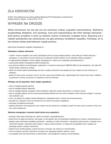 DLA KIEROWCÓW Źródło: http://dlakierowcow.policja.pl/dk/profilaktyka/47470,Wypadek-na-drodze.html Wygenerowano: Sobota, 4 marca 2017, 07:37 WYPADEK NA DRODZE Wielu kierowców nie wie jak ma się zachować widząc wypadek samochodowy. Niektórzy przejeżdżają obojętnie, inni panikują. Czas jest najważniejszy dla ofiar takiego zdarzenia jeśli pomoc przyjdzie w porę są większe szanse uratowane czyjegoś życia. Zapoznaj się z radami policjantów jak zachowywać się gdy jesteśmy świadkami wypadku. Pamiętaj, że ty też możesz kiedyś potrzebować czyjejś pomocy. Jeżeli jesteś świadkiem wypadku drogowego to: Zabezpiecz miejsce zdarzenia: ● "zasłoń" miejsce wypadku oraz osoby udzielające pomocy bryłą swojego pojazdu, warto włączyć światła awaryjne i postojowe ( w warunkach nocnych konieczne są włączone światła mijania, to one oświetlą miejsce wypadku ), ● w odpowiedniej odległości ustaw trójkąty ostrzegawcze ( własny lub z pojazdów poszkodowanych ), ● wykorzystaj światło ostrzegawcze latarki podręcznej, ● przy pomocy telefonu komórkowego ( połączenie z numerami alarmowymi 998,997,999,112 jest bezpłatne ) lub radia CB wezwij służby ratownicze, policję, ● jeżeli nie możesz spełnić powyższego warunku, spróbuj zatrzymać inne pojazdy bo sam możesz nie być skuteczny w działaniu, ● jeżeli nie masz szans na pomoc innych, nie trać czasu zacznij działać sam, najważniejsze dla rannych bez pulsu i oddechu są pierwsze 4 minuty, ale pomoc im udzielona musi być fachowa. Zbliżając się do pojazdów, które uległy wypadkowi: ● weź ze swojego pojazdu gaśnicę, ● weź ze swojego pojazdu apteczkę, ● weź ze swojego pojazdu narzędzie, którym będziesz mógł zbić szybę lub pomoże ci w otwarciu drzwi, ● weź ze swojego pojazdu nóż do cięcia pasów bezpieczeństwa lub inne ostre narzędzie, które może go zastąpić ( scyzoryk, nóż myśliwski, itp.) ● oceń, czy pojazd nie ulegnie niekontrolowanemu niebezpiecznemu ruchowi lub przemieszczeniu, ● sprawdź czy z pojazdu (-ów) nie wycieka lub nie ulatnia się medium napędowe, ● zachowaj szczególną ostrożność, ● spróbuj zatrzymać inne pojazdy bo sam możesz nie być skuteczny w działaniu, jeżeli nie masz szans na pomoc innych nie trać czasu działaj sam. Wykonaj następujące czynności jeżeli jesteś przy pojazdach: ● sprawdź, które drzwi otwierają się i ułatwi to kontakt z poszkodowanymi, ● jeżeli drzwi nie dają się otworzyć, zbij szybę, w taki sposób, aby nie powodować dodatkowych urazów u poszkodowanych, ● zbijając szyby zachowaj szczególną ostrożność - pamiętaj, że szkło hartowane ( najczęściej szyby boczne ) rozpada się na małe ostre kawałki, natomiast szyby klejone ( zawsze szyba przednia i w większości przypadków tylna ) pękają, ale pozostają zwykle w jednym elemencie, ● dostań się do środka pojazdu, wyjmij kluczyki ze stacyjki, ale zostaw je w samochodzie, ● oceń czy dalsze czynności ratownicze na pewno nie zagrażają twojemu zdrowiu i życiu, ● w przypadku jeśli samochód stanie w płomieniach, użyj dostępnej Ci gaśnicy samochodowej, ● jeśli stwierdzisz u poszkodowanych brak oznak pulsu i oddechu przystąp do ożywiania, ● najskuteczniejsze działania przedmedyczne wykonasz z dala od uszkodzonych pojazdów ewakuując poszkodowanych. Zaalarmuj służby ratownicze, a w przypadku gdy: ● samochód nie jest narażony na niekontrolowany ruch lub przemieszczenie ● nie ma wycieków paliwa ● odłączona jest instalacja elektryczna pojazdu ● miejsce zdarzenia jest odpowiednio zabezpieczone ● poszkodowani dają oznaki życia, ale są uwięzieni w pojeździe, przystąp do udzielania im pierwszej pomocy ( opatrzenia ran, tamowania krwotoków, ustabilizowania kręgosłupa i kończyn ). Kontroluj oddech i czynności serca poszkodowanych, okryj ich kocem lub odzieżą w celu uniknięcia pogłębienia wstrząsu. Zostań przy poszkodowanych do czasu przybycia ratowników. Pamiętaj, aby wszystkie czynności wykonywać z rozwagą, bez niepotrzebnych emocji i dodatkowych zniszczeń, do czasu aż przybędą specjalistyczne służby ratownicze. Pamiętaj, że Ty również możesz się znaleźć w podobnej sytuacji. *) źródło Komenda Stołeczna Policji Ocena: 4.8/5 (6) Tweetnij
