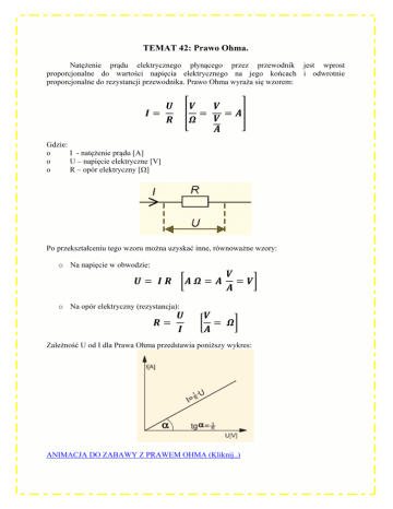 TEMAT 42: Prawo Ohma. Natężenie prądu elektrycznego płynącego przez przewodnik jest wprost proporcjonalne do wartości napięcia elektrycznego na jego końcach i odwrotnie proporcjonalne do rezystancji przewodnika. Prawo Ohma wyraża się wzorem: = = = Gdzie: o I - natężenie prądu [A] o U – napięcie elektryczne [V] o R – opór elektryczny [Ω] Po przekształceniu tego wzoru można uzyskać inne, równoważne wzory: o Na napięcie w obwodzie: = o Na opór elektryczny (rezystancja): = = = = Zależność U od I dla Prawa Ohma przedstawia poniższy wykres: ANIMACJA DO ZABAWY Z PRAWEM OHMA (Kliknij..) ZADANIA: 1. Jaki jest opór żarówki latarki zasilanej napięciem 9 V jeżeli płynie przez nią prąd o natężeniu 750 mA? 2. Jakie napięcie panuje między końcami opornika o oporze 8 Ω, jeżeli w ciągu 5 minut przepłynął przez niego ładunek 65 C? 3. Jak zmienią się wskazania amperomierza w obwodzie przedstawionym na schemacie, jeżeli woltomierz wskaże: a) 9 V, b) 27 V? Obecnie: I=500 mA U=5 V 4. Wyznacz opór elektryczny urządzenia, którego zależność napięcia od natężenia przedstawiona jest na wykresie: