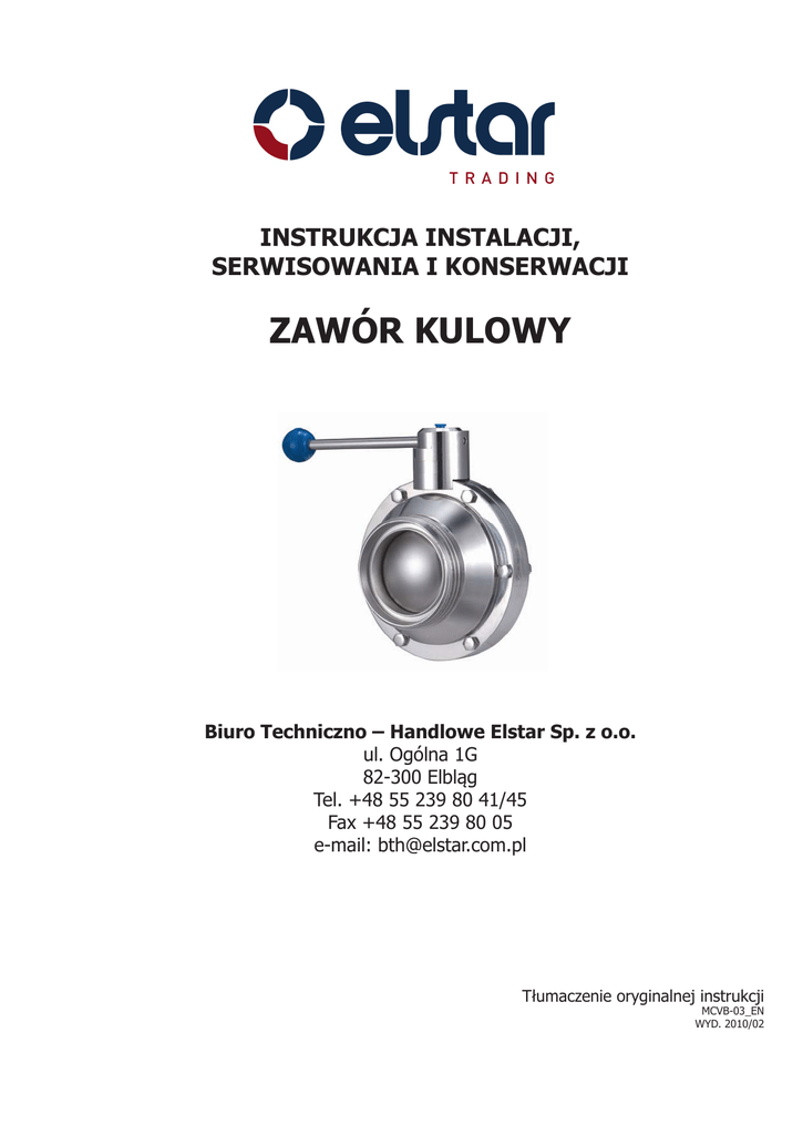 INSTRUKCJA INSTALACJI, SERWISOWANIA I KONSERWACJI ZAWÓR KULOWY Biuro Techniczno – Handlowe Elstar Sp. z o.o. ul. Ogólna 1G 82-300 Elbląg Tel. +48 55 239 80 41/45 Fax +48 55 239 80 05 e-mail: [email protected] Tłumaczenie oryginalnej instrukcji MCVB-03_EN WYD. 2010/02 1. Bezpieczeństwo 1.1 INSTRUKCJA OBSŁUGI Niniejsza instrukcja zawiera podstawowe wskazówki, których należy przestrzegać podczas instalacji, uruchamiania i konserwacji zaworu. Informacje zawarte w niniejszej instrukcji oparte są na aktualnych danych. Producent zastrzega sobie prawo do wprowadzania zmian w instrukcji bez wcześniejszego powiadomienia. 1.2 INSTRUKCJE DLA ROZRUCHU Niniejsza instrukcja obsługi zawiera ważne i użyteczne informacje odnośnie właściwej obsługi i konserwacji zakupionego zaworu. Należy przestrzegać zaleceń bezpieczeństwa zawartych w niniejszym rozdziale, jak również stosować specjalne środki i zalecenia opisane w innych rozdziałach instrukcji. Instrukcję należy przechowywać w zabezpieczonym miejscu w pobliżu instalacji. 1.3 BEZPIECZEŃSTWO 1.3.1. Symbole ostrzegawcze Ogólne zagrożenie dla ludzi. Niebezpieczeństwo zranienia spowodowane ruchomymi częściami urządzenia. Zagrożenie związane z prądem elektrycznym. Niebezpieczeństwo! Substancje żrące i drażniące. Niebezpieczeństwo! Podwieszone ładunki Zagrożenie dla prawidłowego działania urządzenia. Wymagane okulary ochronne. Zobowiązanie do zapewnienia bezpieczeństwa na stanowisku pracy. 1.4 OGÓLNE INSTRUKCJE BEZPIECZEŃSTWA Przed przystąpieniem do instalacji i uruchomienia zaworu przeczytaj uważnie instrukcję obsługi. W przypadku wątpliwości skontaktuj się z producentem. 1.4.1. W trakcie instalacji Bezwzględnie należy przestrzegać Specyfikacji Technicznych opisanych w Rozdziale 5. Instalacja oraz eksploatacja zaworu/siłownika powinna być zawsze prowadzona zgodnie z obowiązującymi przepisami BHP. Przed uruchomieniem zaworu/siłownika upewnij się, że montaż został przeprowadzony prawidłowo, a wałek kuli jest idealnie dopasowany. Nieprawidłowe dopasowanie i/lub użycie nadmiernej siły przy mocowaniu zaworu/siłownika mogą spowodować poważne problemy mechaniczne. W trakcie instalacji wszystkie prace elektryczne muszą być wykonywane przez uprawniony do tego personel. 1.4.2. W trakcie eksploatacji ED. 2010/02 Bezwzględnie należy przestrzegać Specyfikacji Technicznych opisanych w Rozdziale 5. Pod żadnym pozorem podane wartości graniczne nie mogą być przekraczane. 1. Bezpieczeństwo 2 Podczas działania NIGDY nie dotykaj zaworu i/lub rur stykających się z cieczą: istnieje ryzyko oparzeń, jeśli obsługują one gorące substancje. W przypadku awarii nigdy nie posługuj się dźwignią; sprężyny nie są zabezpieczone. Zawór/siłownik zawiera części obrotowe. Nie wkładaj palców ani dłoni w połączenie między zaworem a siłownikiem przy podłączonym sprężonym powietrzu, może to spowodować poważne obrażenia. 1.4.3. W trakcie konserwacji Należy zawsze przestrzegać Specyfikacji Technicznych opisanych w Rozdziale 5. NIGDY nie demontuj zaworu przed opróżnieniem rur. Weź pod uwagę, że ciecz w rurach może być niebezpieczna lub bardzo gorąca. Sprawdź obowiązujące w danym kraju przepisy dotyczące takich przypadków. Nie zostawiaj na podłodze części luzem. Wszystkie prace elektryczne muszą być wykonywane przez uprawniony do tego personel. 1.4.4. Przestrzeganie instrukcji obsługi Nieprzestrzeganie instrukcji obsługi może spowodować zagrożenie dla operatorów, środowiska oraz urządzeń, a także prowadzić do utraty praw gwarancyjnych. Nieprzestrzeganie instrukcji może spowodować następujące zagrożenia: • Utratę ważnych funkcji urządzenia/instalacji. • Błędy w określonych procedurach konserwacji i napraw. • Możliwość wystąpienia zagrożeń elektrycznych, mechanicznych i chemicznych. • Zagrożenie dla środowiska z powodu uwolnienia niebezpiecznych substancji. 1.5 GWARANCJA Wszelkie gwarancje zostaną anulowane natychmiast i z mocą prawną, a także będziemy dodatkowo domagać się odszkodowania z tytułu odpowiedzialności cywilnej osób trzecich w przypadku gdy: • Prace instalacyjne i konserwacyjne nie zostały przeprowadzone zgodnie z zaleceniami niniejszej instrukcji obsługi. • Naprawy nie zostały przeprowadzone przez personel naszej firmy lub zostały wykonane bez naszego pisemnego upoważnienia. • Użyte części nie są oryginalnymi częściami producenta. • Nasze materiały zostały poddane modyfikacjom bez pisemnego upoważnienia. • Materiały zostały użyte w sposób niewłaściwy, niedbały lub niezgodny ze wskazówkami i przeznaczeniem określonym w niniejszej instrukcji. Mają także zastosowanie posiadane już przez Państwa ogólne warunki dostawy. Prosimy o kontakt w przypadku wątpliwości lub jeśli niezbędne będą bardziej szczegółowe wyjaśnienia odnośnie poszczególnych procedur (regulacje, montaż, demontaż itp.). 3 1. Bezpieczeństwo ED. 2010/02 2. Dostawa i instalacja 2.1.SPRAWDZENIE DOSTAWY Pierwszą czynnością po dostarczeniu zaworu jest potwierdzenie jego zgodności z dokumentem dostawy. Producent sprawdza wszystkie urządzenia przed zapakowaniem, jednakże nie może zagwarantować, że produkt dotrze do odbiorcy nietknięty. Z tego powodu należy sprawdzić dostarczony zawór oraz wszelkie inne artykuły i w przypadku, gdy okaże się, że nie są one w dobrym stanie i/lub brakuje części, przewoźnik powinien niezwłocznie wyjaśnić sprawę. Każdy zawór ma wygrawerowany numer fabryczny. Numer fabryczny należy zamieszczać we wszelkiej dokumentacji oraz korespondencji. W przypadku dostarczenia zaworu z siłownikiem, będzie on posiadał nalepką z następującymi informacjami: VALVULAS NEUMATICAS / AIR OPERATED VALVES NºFIGURA: TAMAÑO: FIGURE NR: SIZE: TIPO ACTUADOR: ACTUATOR TYPE: PRESION DE TRABAJO:min Numer seryjny /máx WORKING PRESSURE:min /max Nº FABRICACION: 