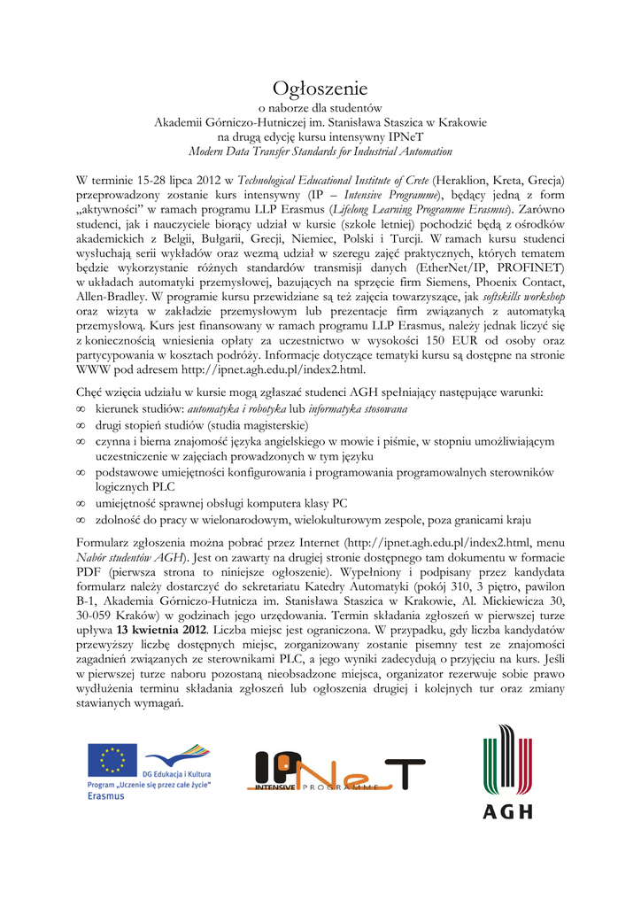 Ogłoszenie o naborze dla studentów Akademii Górniczo-Hutniczej im. Stanisława Staszica w Krakowie na drugą edycję kursu intensywny IPNeT Modern Data Transfer Standards for Industrial Automation W terminie 15-28 lipca 2012 w Technological Educational Institute of Crete (Heraklion, Kreta, Grecja) przeprowadzony zostanie kurs intensywny (IP – Intensive Programme), będący jedną z form „aktywności” w ramach programu LLP Erasmus (Lifelong Learning Programme Erasmus). Zarówno studenci, jak i nauczyciele biorący udział w kursie (szkole letniej) pochodzić będą z ośrodków akademickich z Belgii, Bułgarii, Grecji, Niemiec, Polski i Turcji. W ramach kursu studenci wysłuchają serii wykładów oraz wezmą udział w szeregu zajęć praktycznych, których tematem będzie wykorzystanie różnych standardów transmisji danych (EtherNet/IP, PROFINET) w układach automatyki przemysłowej, bazujących na sprzęcie firm Siemens, Phoenix Contact, Allen-Bradley. W programie kursu przewidziane są też zajęcia towarzyszące, jak softskills workshop oraz wizyta w zakładzie przemysłowym lub prezentacje firm związanych z automatyką przemysłową. Kurs jest finansowany w ramach programu LLP Erasmus, należy jednak liczyć się z koniecznością wniesienia opłaty za uczestnictwo w wysokości 150 EUR od osoby oraz partycypowania w kosztach podróży. Informacje dotyczące tematyki kursu są dostępne na stronie WWW pod adresem http://ipnet.agh.edu.pl/index2.html. Chęć wzięcia udziału w kursie mogą zgłaszać studenci AGH spełniający następujące warunki: • kierunek studiów: automatyka i robotyka lub informatyka stosowana • drugi stopień studiów (studia magisterskie) • czynna i bierna znajomość języka angielskiego w mowie i piśmie, w stopniu umożliwiającym uczestniczenie w zajęciach prowadzonych w tym języku • podstawowe umiejętności konfigurowania i programowania programowalnych sterowników logicznych PLC • umiejętność sprawnej obsługi komputera klasy PC • zdolność do pracy w wielonarodowym, wielokulturowym zespole, poza granicami kraju Formularz zgłoszenia można pobrać przez Internet (http://ipnet.agh.edu.pl/index2.html, menu Nabór studentów AGH). Jest on zawarty na drugiej stronie dostępnego tam dokumentu w formacie PDF (pierwsza strona to niniejsze ogłoszenie). Wypełniony i podpisany przez kandydata formularz należy dostarczyć do sekretariatu Katedry Automatyki (pokój 310, 3 piętro, pawilon B-1, Akademia Górniczo-Hutnicza im. Stanisława Staszica w Krakowie, Al. Mickiewicza 30, 30-059 Kraków) w godzinach jego urzędowania. Termin składania zgłoszeń w pierwszej turze upływa 13 kwietnia 2012. Liczba miejsc jest ograniczona. W przypadku, gdy liczba kandydatów przewyższy liczbę dostępnych miejsc, zorganizowany zostanie pisemny test ze znajomości zagadnień związanych ze sterownikami PLC, a jego wyniki zadecydują o przyjęciu na kurs. Jeśli w pierwszej turze naboru pozostaną nieobsadzone miejsca, organizator rezerwuje sobie prawo wydłużenia terminu składania zgłoszeń lub ogłoszenia drugiej i kolejnych tur oraz zmiany stawianych wymagań. Formularz zgłoszenia chęci udziału studenta Akademii Górniczo-Hutniczej im. Stanisława Staszica w Krakowie w drugiej edycji kursu intensywnego IPNeT Modern Data Transfer Standards for Industrial Automation prowadzonego w dniach 15-28 lipca 2012 Proszę wypełnić formularz czytelnie, pismem technicznym lub drukowanymi literami. Imię (imiona): Nazwisko: Numer albumu: E-mail: Telefon: Uczelnia: Wydział: Kierunek studiów: Stopień studiów: Rok studiów: W poniższej tabeli wpisz TAK lub NIE, zgodnie ze stanem faktycznym. Czynna i bierna znajomość języka angielskiego w mowie i piśmie: Znajomość podstaw konfigurowania i programowania sterowników PLC: Umiejętność sprawnej obsługi komputera klasy PC z systemem operacyjnym Windows: Zdolność do pracy w wielonarodowym, wielokulturowym zespole, poza granicami kraju: .......................................................................................................................... Miejscowość, data, podpis kandydata