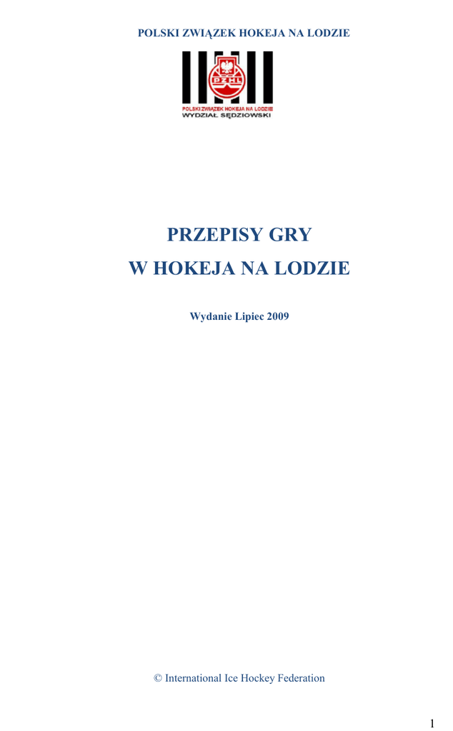 POLSKI ZWIĄZEK HOKEJA NA LODZIE PRZEPISY GRY W HOKEJA NA LODZIE Wydanie Lipiec 2009 © International Ice Hockey Federation 1 Niniejsze Przepisy Gry w Hokeja na Lodzie mają zastosowanie dla wszystkich meczów rozgrywanych pod egidą IIHF oraz wszystkich spotkań rozgrywanych na terenie Polski Autor wersji polskiej: Hubert Godziątkowski www.sedziahokeja.pl Korekta i konsultacje: Komisja Szkoleniowa Wydziału Sędziowskiego PZHL 2 SPIS TREŚCI ROZDZIAŁ 1 – LODOWISKO .................................................................... 11 100 – DEFINICJA LODOWISKA ............................................................................................ 11 101 – ROZMIARY LODOWISKA ........................................................................................... 11 102 – BANDY........................................................................................................................... 11 103 – TAŚMA ODBOJOWA .................................................................................................... 11 104 - DRZWICZKI .................................................................................................................. 11 105 - OSŁONY PLEKSIGLASOWE ....................................................................................... 13 106 – SIATKI W STREFACH KOŃCOWYCH ....................................................................... 13 110 – PODZIAŁ I OZNACZENIE TAFLI................................................................................ 13 111 – LINIE BRAMKOWE ...................................................................................................... 13 112 – LINIE NIEBIESKIE ........................................................................................................ 13 113 – LINIA ŚRODKOWA ...................................................................................................... 13 114 – PUNKTY WZNOWIEŃ I KOŁA ................................................................................... 15 115 - PUNKT I KOŁO NA ŚRODKU LODOWISKA ............................................................ 15 116 - PUNKTY WZNOWIEŃ GRY W STREFIE NEUTRALNEJ ......................................... 15 117 - PUNKTY WZNOWIEŃ GRY W STREFIE KOŃCOWEJ ............................................ 15 118 – POLE SĘDZIOWSKIE ................................................................................................... 17 119 – POLE BRAMKOWE ...................................................................................................... 17 130 – BRAMKA, SŁUPKI I SIATKA ...................................................................................... 19 140 – 141 – 142 – 143 – ŁAWKI GRACZY ......................................................................................................... 19 ŁAWKI KAR ................................................................................................................. 19 ŁAWKI SĘDZIÓW BRAMKOWYCH .......................................................................... 19 ŁAWKA SEKRETARZA ZAWODÓW ........................................................................ 19 150 – 151 – 152 – 153 – URZĄDZENIA SYGNALIZACYJNE I CZASU .......................................................... 21 SYRENA ........................................................................................................................ 21 ZEGAR .......................................................................................................................... 21 CZERWONE I ZIELONE ŚWIATŁA ........................................................................... 21 160 – SZATNIE ZAWODNIKÓW ........................................................................................... 21 161 – SZATNIE SĘDZIÓW GŁÓWNYCH I LINIOWYCH .................................................... 21 170 – OŚWIETLENIE LODOWISKA ...................................................................................... 21 171 – PALENIE NA OBIEKCIE .............................................................................................. 21 172 – MUZYKA NA OBIEKCIE ............................................................................................. 21 3 ROZDZIAŁ 2 – DRUŻYNY, GRACZE I ICH SPRZĘT ......................... 23 200 – ZAWODNICY W UBIORACH ...................................................................................... 23 201 – KAPITAN DRUŻYNY ................................................................................................... 23 210 – SPRZĘT .......................................................................................................................... 23 220 – 221 – 222 – 223 – 224 – 225 – 226 – 227 – SPRZĘT GRACZA ........................................................................................................ 23 ŁYŻWY GRACZA ........................................................................................................ 23 KIJ GRACZA ................................................................................................................. 23 KASK GRACZA ............................................................................................................ 25 PEŁNA MASKA NA TWARZ I „PÓŁPLEKSA” ......................................................... 25 RĘKAWICE GRACZA .................................................................................................. 25 OCHRANIACZ SZYI I GARDŁA ................................................................................ 25 OCHRANIACZ NAZĘBNY .......................................................................................... 27 230 – SPRZĘT BRAMKARZA ................................................................................................ 27 231 – ŁYŻWY BRAMKARZA .....................................................