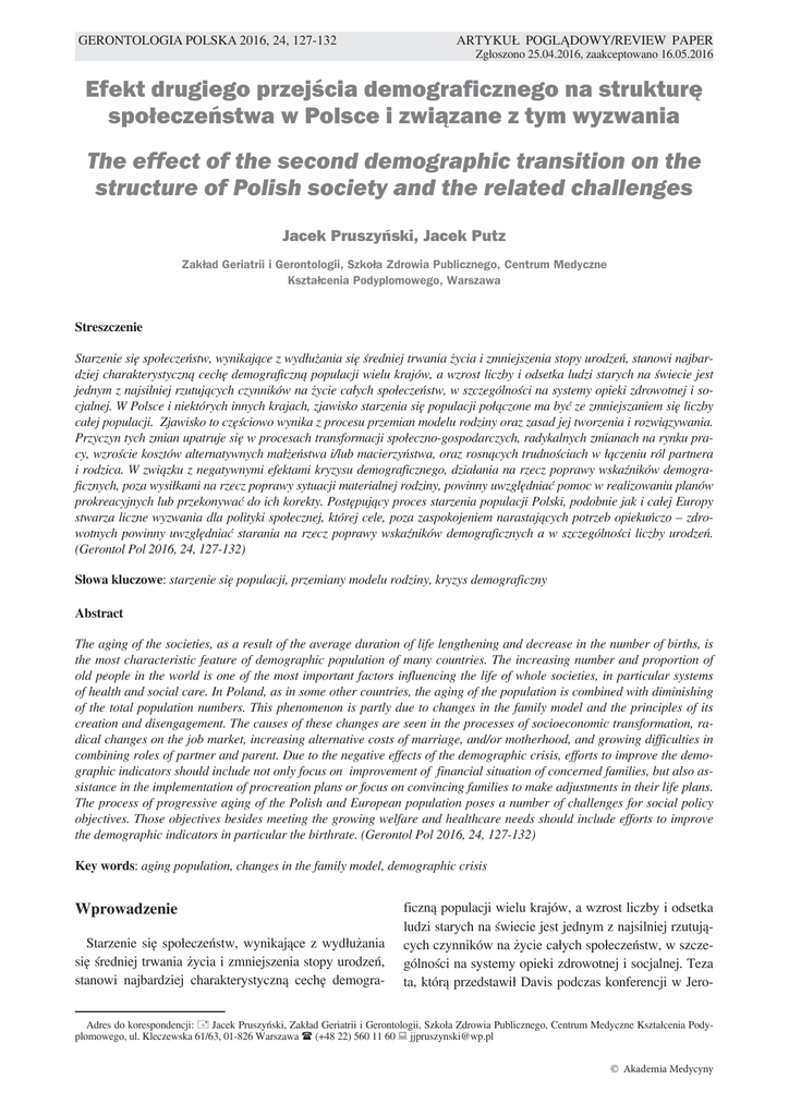 GERONTOLOGIA POLSKA 2016, 24, 127-132 ARTYKUŁ POGLĄDOWY/REVIEW PAPER Zgłoszono 25.04.2016, zaakceptowano 16.05.2016 Efekt drugiego przejœcia demograficznego na strukturê spo³eczeñstwa w Polsce i zwi¹zane z tym wyzwania The effect of the second demographic transition on the structure of Polish society and the related challenges Jacek Pruszyński, Jacek Putz Zakład Geriatrii i Gerontologii, Szkoła Zdrowia Publicznego, Centrum Medyczne Kształcenia Podyplomowego, Warszawa Streszczenie Starzenie się społeczeństw, wynikające z wydłużania się średniej trwania życia i zmniejszenia stopy urodzeń, stanowi najbardziej charakterystyczną cechę demograficzną populacji wielu krajów, a wzrost liczby i odsetka ludzi starych na świecie jest jednym z najsilniej rzutujących czynników na życie całych społeczeństw, w szczególności na systemy opieki zdrowotnej i socjalnej. W Polsce i niektórych innych krajach, zjawisko starzenia się populacji połączone ma być ze zmniejszaniem się liczby całej populacji. Zjawisko to częściowo wynika z procesu przemian modelu rodziny oraz zasad jej tworzenia i rozwiązywania. Przyczyn tych zmian upatruje się w procesach transformacji społeczno-gospodarczych, radykalnych zmianach na rynku pracy, wzroście kosztów alternatywnych małżeństwa i/lub macierzyństwa, oraz rosnących trudnościach w łączeniu ról partnera i rodzica. W związku z negatywnymi efektami kryzysu demograficznego, działania na rzecz poprawy wskaźników demograficznych, poza wysiłkami na rzecz poprawy sytuacji materialnej rodziny, powinny uwzględniać pomoc w realizowaniu planów prokreacyjnych lub przekonywać do ich korekty. Postępujący proces starzenia populacji Polski, podobnie jak i całej Europy stwarza liczne wyzwania dla polityki społecznej, której cele, poza zaspokojeniem narastających potrzeb opiekuńczo – zdrowotnych powinny uwzględniać starania na rzecz poprawy wskaźników demograficznych a w szczególności liczby urodzeń. (Gerontol Pol 2016, 24, 127-132) Słowa kluczowe: starzenie się populacji, przemiany modelu rodziny, kryzys demograficzny Abstract The aging of the societies, as a result of the average duration of life lengthening and decrease in the number of births, is the most characteristic feature of demographic population of many countries. The increasing number and proportion of old people in the world is one of the most important factors influencing the life of whole societies, in particular systems of health and social care. In Poland, as in some other countries, the aging of the population is combined with diminishing of the total population numbers. This phenomenon is partly due to changes in the family model and the principles of its creation and disengagement. The causes of these changes are seen in the processes of socioeconomic transformation, radical changes on the job market, increasing alternative costs of marriage, and/or motherhood, and growing difficulties in combining roles of partner and parent. Due to the negative effects of the demographic crisis, efforts to improve the demographic indicators should include not only focus on improvement of financial situation of concerned families, but also assistance in the implementation of procreation plans or focus on convincing families to make adjustments in their life plans. The process of progressive aging of the Polish and European population poses a number of challenges for social policy objectives. Those objectives besides meeting the growing welfare and healthcare needs should include efforts to improve the demographic indicators in particular the birthrate. (Gerontol Pol 2016, 24, 127-132) Key words: aging population, changes in the family model, demographic crisis Wprowadzenie Starzenie się społeczeństw, wynikające z wydłużania się średniej trwania życia i zmniejszenia stopy urodzeń, stanowi najbardziej charakterystyczną cechę demogra- ficzną populacji wielu krajów, a wzrost liczby i odsetka ludzi starych na świecie jest jednym z najsilniej rzutujących czynników na życie całych społeczeństw, w szczególności na systemy opieki zdrowotnej i socjalnej. Teza ta, którą przedstawił Davis podczas konferencji w Jero- Adres do korespondencji: Jacek Pruszyński, Zakład Geriatrii i Gerontologii, Szkoła Zdrowia Publicznego, Centrum Medyczne Kształcenia Podyplomowego, ul. Kleczewska 61/63, 01-826 Warszawa (+48 22) 560 11 60 [email protected] Akademia Medycyny 128 JACEK PRUSZYŃSKI, JACEK PUTZ zolimie w 1999 roku, pomimo upływu 17 lat od chwili jej wygłoszenia nie straciła nic na swojej aktualności. Współczesny świat, wśród wielu niespotykanych do tej pory możliwości, oferuje żyjącym obecnie osobom szansę na dożycie nie tylko do okresu starości, ale również na osiągnięcie długowieczności, czyli okresu znacznie początek starości przewyższającego. Efekty tego zjawiska można prześledzić na przykładzie progu demograficznej starości, definiowanej zgodnie z normami ONZ, jako sytuację, w której 7% danego społeczeństwa osiągnęło lub przekroczyło 65 rok życia. Polska przekroczyła próg demograficznej starości w 1967 roku, a próg zaawansowanej starości demograficznej (definiowanej, jako sytuację, w której udział osób w wieku 65 lat i starszym w ogólnej strukturze ludności osiąga ponad 10%) w 1980 roku [1]. Warto zauważyć, iż prognoza demograficzna sporządzona w 1999 roku zakładała, że w 2010 roku będzie w Polsce około 5 mln osób starszych (65+), które będą stanowiły prawie 13% całej populacji [2]. Prognoza ta okazała się prawdziwa, ponieważ wyniki, jakie podaje Mały Rocznik Statystyczny to 5,2 miliona osób w wieku, 65+ które stanowiły 13,6 % całej populacji w 2010 roku [3]. Z kolei dane Małego Rocznika Statystycznego z 2014 roku pokazują, że proces postępującego starzenia się społeczeństwa nadal trwa, ponieważ cztery lata później liczba osób w wieku 65+ osiągnęła wart