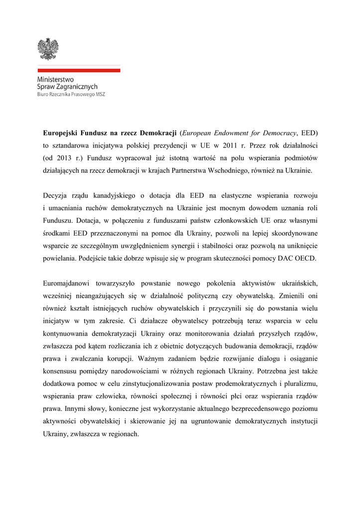 Europejski Fundusz na rzecz Demokracji (European Endowment for Democracy, EED) to sztandarowa inicjatywa polskiej prezydencji w UE w 2011 r. Przez rok działalności (od 2013 r.) Fundusz wypracował już istotną wartość na polu wspierania podmiotów działających na rzecz demokracji w krajach Partnerstwa Wschodniego, również na Ukrainie. Decyzja rządu kanadyjskiego o dotacja dla EED na elastyczne wspierania rozwoju i umacniania ruchów demokratycznych na Ukrainie jest mocnym dowodem uznania roli Funduszu. Dotacja, w połączeniu z funduszami państw członkowskich UE oraz własnymi środkami EED przeznaczonymi na pomoc dla Ukrainy, pozwoli na lepiej skoordynowane wsparcie ze szczególnym uwzględnieniem synergii i stabilności oraz pozwolą na uniknięcie powielania. Podejście takie dobrze wpisuje się w program skuteczności pomocy DAC OECD. Euromajdanowi towarzyszyło powstanie nowego pokolenia aktywistów ukraińskich, wcześniej nieangażujących się w działalność polityczną czy obywatelską. Zmienili oni również kształt istniejących ruchów obywatelskich i przyczynili się do powstania wielu inicjatyw w tym zakresie. Ci działacze obywatelscy potrzebują teraz wsparcia w celu kontynuowania demokratyzacji Ukrainy oraz monitorowania działań przyszłych rządów, zwłaszcza pod kątem rozliczania ich z obietnic dotyczących budowania demokracji, rządów prawa i zwalczania korupcji. Ważnym zadaniem będzie rozwijanie dialogu i osiąganie konsensusu pomiędzy narodowościami w różnych regionach Ukrainy. Potrzebna jest także dodatkowa pomoc w celu zinstytucjonalizowania postaw prodemokratycznych i pluralizmu, wspierania praw człowieka, równości społecznej i równości płci oraz wspierania rządów prawa. Innymi słowy, konieczne jest wykorzystanie aktualnego bezprecedensowego poziomu aktywności obywatelskiej i skierowanie jej na ugruntowanie demokratycznych instytucji Ukrainy, zwłaszcza w regionach. Fundacja Solidarności Międzynarodowej (do 2013 Polska Fundacja Międzynarodowej Współpracy na rzecz Rozwoju „Wiedzieć Jak”) została powołana w 1996 r. z inicjatywy Prezydenta RP i reaktywowana w 2011 r. z inicjatywy ministra Radosława Sikorskiego. Podstawowym celem działalności jest wspieranie prodemokratycznych przemian w społeczeństwach, które ze względu na system polityczny nie mają możliwości współdecydowania o własnym losie oraz krajów w okresie transformacji systemowej. Znakiem graficznym Fundacji jest logo polskiej prezydencji w Radzie UE. Fundacja realizuje swoje cele głownie przez wsparcie projektów realizowanych przez polskie organizacje pozarządowe we współpracy z partnerami lokalnymi z zagranicy. W latach 2012-2013 w ramach programu „Wsparcie Demokracji” Fundacja dofinansowała realizację 122 projektów w krajach Partnerstwa Wschodniego, Azji Centralnej, Tunezji i Birmie / Mjanmie. W ramach działań własnych Fundacja m.in. wysyła obserwatorów na wybory w ramach misji OBWE / ODHIR, prowadzi Centrum Informacyjne dla Władz lokalnych w Mołdawii. Od końca 2013 r. Fundacja aktywnie angażuje się we wspieranie prodemokratycznych i proeuropejskich o jakie obywatele Ukrainy walczyli na Majdanie w Kijowie i na wielu majdanach w całej Ukrainie. Fundacja m.in. aktywnie zaangażowała się w powstanie i działania Komitetu Obywatelskiego Solidarności z Ukrainą, wspiera niezależne media (w tym odkupuje dziennikarzom zniszczony sprzęt), uczestniczy w misjach eksperckich, udziela wsparcia pomocy medycznej dla rannych z Majdanu. W 2014 r. Fundacja wspiera 11 projektów polskich organizacji pozarządowych oraz organizuje około stuosobową misję obserwacyjną na wybory w Ukrainie. Szacujemy, że w bieżącym roku łączny koszt działań realizowanych przez Fundację ze środków polskiej współpracy rozwojowej MSZ RP w Ukrainie wyniesie ok. 5 mln złotych. W ramach Polsko-Kanadyjskiego Programu Wsparcia Demokracji Fundacja planuje sfinansowanie do 2016 r. ok. 25 projektów w Ukrainie. Realizowane przez partnerów z Ukrainy i Polski (organizacje pozarządowe, samorządy, media) projekty będą dotyczyły wsparcia reformy samorządowej na szczeblu lokalnym i regionalnym (ze szczególnym uwzględnieniem Ukrainy wschodniej i południowej) oraz wsparcia niezależnych mediów i budowania wspólnej dla całej Ukrainy przestrzeni świadomości obywatelskiej. Łączny budżet programu w latach 2014-16 to 5,5 mln dolarów kanadyjskich (14 850 tys. zł).