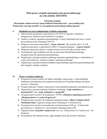 Plan pracy zespołu matematyczno-przyrodniczego na rok szkolny 2015/2016. Priorytetu zespołu: „Rozwijanie zainteresowań i pasji naukami matematyczno – przyrodniczymi. Wspieranie rozwoju uczniów ze szczególnymi potrzebami edukacyjnymi”. I. Działania na rzecz podniesienia wyników nauczania: 1. Opracowanie programów nauczania na rok 2015/16 zgodnie z podstawą programową. Dostosowanie kryteriów wymagań. 2. Analiza wyników egzaminu gimnazjalnego z części matematycznej oraz z części przyrodniczej roku szkolnego 2014/15. 3. Diagnoza nauczania matematyki „ Sesja z plusem” dla uczniów klas I, II i III organizowana przez wydawnictwo GWO w ramach programu „Lepsza Szkoła”. 4. Diagnoza nauczania chemii z wydawnictwem Nowa Era dla uczniów klas I. 5. Prowadzenie zajęć dodatkowych dla uczniów klas III pod kątem dobrego przygotowania do egzaminu gimnazjalnego. 6. Organizacja i przeprowadzenie próbnego egzaminu gimnazjalnego z matematyki i z części przyrodniczej. Analiza wyników egzaminu próbnego. 7. Organizacja i przeprowadzenie dodatkowego próbnego egzaminu gimnazjalnego dla klas drugich. Analiza wyników. II. Praca z uczniem zdolnym. 1. Przygotowywanie uczniów do etapu szkolnego, rejonowego i wojewódzkiego konkursów przedmiotowych organizowanych przez Świętokrzyskiego Kuratora oświaty w Kielcach. 2. Przeprowadzenie I etapów (szkolnych) wojewódzkich konkursów przedmiotowych. 3. Organizacja i przeprowadzenie konkursu szkolnego „Liga zadaniowa z matematyki” oraz „Liga zadaniowa z geografii”. 4. Przygotowanie uczniów do konkursów: OTWP „Młodzież zapobiega pożarom” i „Bezpieczeństwo w ruchu drogowym”. 5. Przygotowanie uczniów do konkursu matematycznego „Mistrz Sudoku Ziemi Sandomierskiej” organizowanego przez Gimnazjum w Klimontowie. 6. Przygotowanie uczniów do konkursów pod patronatem LOP np. „Ciekawostki przyrodnicze w obiektywie”, prowadzenie szkolnego koła LOP. 7. Organizowanie wyjazdów naukowych m.in. na „Małopolską Noc Naukowców” do Krakowa. 8. Prowadzenie kół zainteresowań, zajęć dodatkowych dla uczniów zdolnych. III. IV. Praca z uczniem słabym, ze specjalnymi potrzebami edukacyjnymi. 1. Prowadzenie zajęć pozalekcyjnych, wspomagających uczniów z trudnościami w nauce. 2. Indywidualizacja nauczania ze szczególnym uwzględnieniem uczniów posiadających opinie i orzeczenia Poradni Psychologiczno – Pedagogicznej. Prowadzenie zajęć dla w/w uczniów. 3. Współpraca nauczyciela wspomagającego w klasach integracyjnych z Warsztatami Terapii Zajęciowej w Sandomierzu. 4. Przygotowanie dzieci niepełnosprawnych do udziału w konkursach (plastycznych, recytatorskich). 5. Organizacja pracy w klasach integracyjnych, włączanie dzieci niepełnosprawnych w życie społeczności szkolnej oraz imprez wynikających z kalendarza uroczystości szkolnych. Samokształcenie i doskonalenie w ramach zespołu przedmiotowego. Awans zawodowy oraz podnoszenie kwalifikacji zawodowych nauczycieli. 1. Przeprowadzenie szkoleniowych rad Pedagogicznych w ramach WDN zgodnie z potrzebami szkoły. 2. Przeprowadzenie lekcji otwartych. 3. Wykorzystanie technik informatycznych i szkolnego sprzętu multimedialnego w pracy na lekcjach i w przygotowaniu zajęć. 4. Kontynuacja lub rozpoczęcie stażu przez nauczycieli starających się o wyższy szczebel na drodze awansu zawodowego. 5. Udział nauczycieli w kursach doskonalących i dokształcających. 6. Przeprowadzenie lekcji podlegających hospitacjom diagnozującym, doradczodoskonalącym i kontrolno- oceniającym. V. Organizacja różnorodnych imprez, uroczystości, akcji, zgodnie z kalendarium uroczystości szkolnych. Inne działania członków zespołu. 1. Organizacja i przeprowadzenie konkursu dla uczniów szkół podstawowych powiatu sandomierskiego :„Duet matematyczno – przyrodniczy”. 2. Zorganizowanie Dnia Preorientacji Zawodowej, współpraca ze szkołami ponadgimnazjalnymi. 3. Organizacja i przeprowadzenie akcji ewakuacji szkoły. 4. Dzień Otwartych Drzwi – spotkanie z szóstoklasistami i ich rodzicami. 5. Prowadzenie na bieżąco strony internetowej szkoły. 6. Opieka nad pracowniami szkolnymi. 7. Współpraca z rodzicami i środowiskiem lokalnym. Opracowanie: Małgorzata Tutak