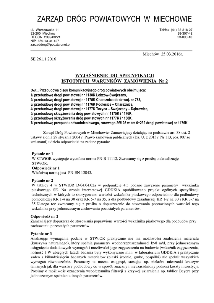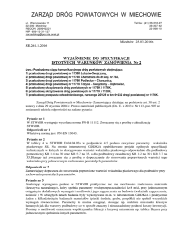 ZARZĄD DRÓG POWIATOWYCH W MIECHOWIE ul. Warszawska 11 32-200 Miechów REGON 299943221 NIP 659-13-31-127 [email protected] Tel/fax (41) 38-318-27 38-307-42 23-098-10 ___________________________________________________________________________ Miechów 25.03.2016r. SE.261.1.2016 WYJAŚNIENIE DO SPECYFIKACJI ISTOTNYCH WARUNKÓW ZAMÓWIENIA Nr 2 Dot.: Przebudowa ciągu komunikacyjnego dróg powiatowych obejmująca: 1/ przebudowę drogi powiatowej nr 1138K Łobzów-Swojczany, 2/ przebudowę drogi powiatowej nr 1175K Charsznica do dr.woj. nr 783, 3/ przebudowę drogi powiatowej nr 1176K Podlesice – Charsznica, 4/ przebudowę drogi powiatowej nr 1177K Tczyca – Swojczany – Dąbrowiec, 5/ przebudowę skrzyżowania dróg powiatowych nr 1175K i 1176K, 6/ przebudowę skrzyżowania dróg powiatowych nr 1177K i 1138K, 7/ przebudowę przepustu odwodnieniowego, rurowego 2Ø125 w km 6+232 drogi powiatowej nr 1176K. Zarząd Dróg Powiatowych w Miechowie- Zamawiający działając na podstawie art. 38 ust. 2 ustawy z dnia 29 stycznia 2004 r. Prawo zamówień publicznych (Dz. U. z 2013 r. Nr 113, poz. 907 ze zmianami) udziela odpowiedzi na zadane pytania: Pytanie nr 1 W STWiOR występuje wycofana norma PN-B 11112. Zwracamy się z prośbą o aktualizację STWiOR. Odpowiedź nr 1 Właściwą normą jest PN-EN 13043. Pytanie nr 2 W tablicy 4 w STWIOR D-04.04.02a w podpunkcie 4.5 podano zawyżone parametry wskaźnika piaskowego SE. Na stronie internetowej GDDKiA opublikowano projekt ogólnych specyfikacji technicznych w których to skorygowano wartości wskaźnika piaskowego odpowiednio dla podbudowy pomocniczej KR 1-4 na 30 oraz KR 5-7 na 35, a dla podbudowy zasadniczej KR 1-2 na 30 i KR 3-7 na 35.Dlatego też zwracamy się z prośbą o dopuszczenie do stosowania poprawionych wartości tego wskaźnika przy jednoczesnym zachowaniu pozostałych parametrów. Odpowiedź nr 2 Zamawiający dopuszcza do stosowania poprawione wartości wskaźnika piaskowego dla podbudów przy zachowaniu pozostałych parametrów. Pytanie nr 3 Analizując wymagania podane w STWiOR praktycznie nie ma możliwości znalezienia materiału (kruszywa naturalnego), który spełnia parametry wodoprzepuszczalności k>8 m/d, przy jednoczesnym osiągnięciu dodatkowych wymagań i możliwości jego zagęszczenia na budowie (wskaźnik zagęszczenia, nośność ) W ubiegłych latach badania były wykonywane m.in. w laboratorium GDDKiA i praktycznie żaden z kilkudziesięciu badanych materiałów (piaski średnie, grube, pospółki) nie spełnił wszystkich wymagań równocześnie. Parametry te można osiągnąć, stosując np. niektóre mieszanki kruszyw łamanych jak dla warstwy podbudowy co w sposób znaczny i nieuzasadniony podnosi koszty inwestycji. Prosimy o możliwość oznaczenia współczynnika filtracji z krzywej uziarnienia np. tablice Beyera przy jednoczesnym spełnieniu innych parametrów. Odpowiedź nr 3 Kruszywo stosowane na warstwę odsączającą powinno spełniać wymogi SST odnośnie parametru wodoprzepuszczalności. Pytanie nr 4 W dokumentacji przetargowej brakuje projektu Stałej Organizacji Ruchu dla poszczególnych dróg powiatowych niezbędnego do kalkulacji ofertowej. Prosimy o uzupełnienie na stronie Zamawiającego Odpowiedź nr 4 Zamawiający na stronie internetowej umieści wykaz znaków z projektów zmiany stałej organizacji ruchu dotyczące przedmiotowych dróg powiatowych. Co pozwoli na prawidłową wycena pozycji kosztorysowych odnoszących się do oznakowania pionowego. Pytanie nr 5 Dotyczy pozycji związanych z remontem przepustów fi 50 cm pod zjazdami: Jaki zakres remontu należy wycenić w cenie jednostkowej dla poz. 3.4, 3.5 (kosztorys nr 1); poz. 3.3, 3.4, 3.5 (kosztorys nr 2), poz. 3.8, poz. 3.9 (kosztorys nr 3); poz. 3.3, 3.4, 3.5 (kosztorys nr 4) ? Prosimy o szczegółowe określenie zakresu remontu. Odpowiedź nr 5 W pozycjach wymienionych w pytaniu 5, remont przepustów drogowych obejmuje: - rozbiórkę istniejących przepustów wraz z murkami czołowymi, - ułożenie nowych rur betonowych lub z tworzyw sztucznych, na ławie z kruszywa, - zasypanie przepustu z zagęszczeniem oraz wykonanie nawierzchni zjazdu lub odtworzenie konstrukcji drogi. Pytanie nr 6 Czy w pozycjach kosztorysowych: 3.4, 3.5 (kosztorys nr 1); poz. 3.3, 3.4, 3.5 (kosztorys nr 2), poz. 3.8, poz. 3.9 (kosztorys nr 3); poz. 3.3, 3.4, 3.5 (kosztorys nr 4) należy wycenić remont polegający na wymianie rur fi 50 cm i w odpowiednich pozycjach nowych murków czołowych? Odpowiedź nr 6 Remont przepustów obejmuje zakres j.w., natomiast w odpowiednich pozycjach kosztorysu należy wycenić wykonanie murków czołowych na tych przepustach. Pytanie nr 7 Czy pod warstwę wyrównawczą należy wykonać skropienie międzywarstwowe? Jeśli tak to w jakiej pozycji należy to skalkulować? Odpowiedź nr 7 Istniejącą nawierzchnię bitumiczną, na której będzie bezpośrednio układana nowa warstwa nawierzchni jezdni – warstwa profilująco- wzmacniająca ,wyrównawcza, należy skropić asfaltem upłynnionym. Przedmiotowe skropienie należy skalkulować w pozycjach kosztorysowych: - kosztorys ofertowy nr 1 – poz. 1.3, - kosztorys ofertowy nr 2 – poz. 2.5, - kosztorys ofertowy nr 3 – poz. 2.6, - kosztorys ofertowy nr 4 – poz. 2.6, Pytanie nr 8 Czy ilość m2 w poz. 1.3 (kosztorys nr 1) została określona prawidłowo? Zamawiający przewiduje na tym odcinku wykonanie 2 warstw bitumicznych przy jednokrotnym skropieniu. Odpowiedź nr 8 Ilość przyjęta w pozycji 1.3 (kosztorys nr 1) jest prawidłowa i odnosi się do skropienia asfaltem upłynnionym istniejącej nawierzchni bitumicznej, na której będzie układana nowa warstwa nawierzchni jezdni – warstwa profilująco- wzmacniająca, (wyrównawcza). Skropienie technologiczne międzywarstwowe (pomiędzy w-wą wyrównawczą a ścieralną) zgodnie z SST należy wykonać emulsją asfaltową uwzględniając je w pozycjach kosztorysowych wykonania warstwy ścieralnej nawierzchni jezdni. Pytani