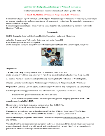 Centralny Ośrodek Sportu Akademickiego w Wilkasach zaprasza na: Seminarium szkoleniowe z zakresu koreańskich sztuk i sportów walki w dniach 4-5.02.2017r. (Wilkasy, ul. Niegocińska 5, 11-500 Giżycko) Seminarium odbędzie się w Centralnym Ośrodku Sportu Akademickiego w Wilkasach, w obiekcie przystosowanym do treningu sztuk i sportów walki, gwarantującym zakwaterowanie i wyżywienie dla uczestników seminarium w swoim obiekcie hotelowym. Seminarium prowadzone będzie przez światowej klasy ekspertów z Korei Południowej, mistrzów Taekwondo, Hapkido i Taekkyon. Prowadzenie: BYUN, Seung Jin, 6 dan hapkido (Korea Hapkido Federation) i taekwondo (Kukkiwon) Adiunkt w Departmencie Taekwondo, Keimyung University, Korea Płd. Certyfikowany trener taekwondo i hapkido, Mistrz nauczyciel Taekkyon zarejestrowany w Narodowej Liście Dziedzictwa Kulturowego Korei (nr 76) Współpraca: 1. CHOI, Kyu Yong: nauczyciel sztuk walki w Seoul Gym, Seul, Korea Płd. mistrz nauczyciel Taekkyon zarejestrowany w Narodowej Liście Dziedzictwa Kulturowego Korei (nr. 76), 2. Dariusz Nowicki: 6 dan taekwondo (Kukkiwon), 4 dan hapkido (All Federation of World Hapkido), Miejsce: Centralny Ośrodek Sportu Akademickiego w Wilkasach, ul. Niegocińska 5, 11-500 Giżycko Organizator: Centralny Ośrodek Sportu Akademickiego w Wilkasach przy współpracy z KS KorioOlsztyn Koszt: a/ pakiet zawierający seminarium oraz zakwaterowanie i wyżywienie 240 pln/os. (2 dni) b/ uczestnictwo tylko w seminarium: 160 pln/os. (1-2 dni) c/ dla trenerów sekcji taekwondo AZS oferta specjalna (tylko 50 pln) przy zgłoszeniu do ZG AZS i organizatora do dnia 20.01.2017r. Rezerwacja i potwierdzenie miejsca na seminarium do dnia 26.01.2017r.: tel. +48 428 07 09, email: [email protected] Płatność: (po wcześniejszej potwierdzonej rezerwacji) do dnia 27.01.2017r. na konto COSA Wilkasy BPH SA O/GIŻYCKO nr 95 1060 0076 0000 3210 0016 8517 (dopisek „seminarium”) Bliższe informacje o programie seminarium: Dariusz Nowicki (email: [email protected], kom. 502 089 616,) Uczestnictwo: trenerzy i zaawansowani zawodnicy taekwondo (minimum 16r.ż i stopień 2 kup), zaawansowani trenerzy i zawodnicy innych azjatyckich sztuk walki (minimum 16r.ż i stopień 2 kup/kyu), w uzasadnionych przypadkach młodsi uczestnicy po ustaleniu z Dariuszem Nowickim. Bliższe informacje o programie seminarium: Dariusz Nowicki (email: [email protected], kom. 502 089 616,) Program: Godziny 12:30-13:30 13:45-14:45 14:45-15:00 15:00-16:15 Dzień pierwszy – 4.02.2017 (sobota) Tematyka Rejestracja i zakwaterowanie uczestników Obiad Powitanie i wprowadzenie do problematyki seminarium 1. Sesja treningowa (wszyscy uczestnicy) 16:15-16:45 16:45-18:00 Przerwa wypoczynkowa 2. Sesja treningowa (wszyscy uczestnicy) 18:00-19:15 19:15-20:30 przerwa wypoczynkowa i kolacja 3. Sesja treningowa: z podziałem na 2 podgrupy: a/gr. trenerska ze stopniami mistrzowskimi b/gr. zawodników i osób bez stopnia mistrzowskiego Godziny 8:00-9:00 9:00-11:30 11:30-12:00 12:00-13:45 Dzień drugi – 5.02.2017 (niedziela) Tematyka śniadanie 4. Sesja treningowa (wszyscy uczestnicy) 13:45-14:00 Przerwa 5. Sesja treningowa: z podziałem na 2 podgrupy: a/g r.trenerska ze stopniami mistrzowskimi b/gr. zawodników i osób bez stopnia mistrzowskiego Zakończenie seminarium, wręczenie certyfikatów 14:00-15:00 Obiad Prowadzący COSA Wilkasy Michał Żak, Dariusz Nowicki Seung Jin Byun, Kyu Yong Choi, D. Nowicki COSA Wilkasy Seung Jin Byun, Kyu Yong Choi, D. Nowicki COSA Wilkasy Seung Jin Byun, Kyu Yong Choi, D. Nowicki Prowadzący COSA Wilkasy Seung Jin Byun, Kyu Yong Choi, D. Nowicki Seung Jin Byun, Kyu Yong Choi, D. Nowicki Seung Jin Byun, Dariusz Nowicki, Michał Żak COSA Wilkasy W programie: 1. 2. 3. 4. 5. 6. 7. Podstawy taekkyon i jego wpływ na współczesne taekwondo i hapkido. Specyficzne ciosy i kopnięcia dla hapkido. Trening padów. Dźwignie nadgarstkowe i barkowe, rzuty. Zaawansowane techniki dla posiadaczy stopni mistrzowskich, techniki ucisku i ataku w punkty witalne. Zastosowanie technik hapkido i taekwondo w samoobronie (hosinsul). Przygotowanie mentalne w hapkido i taekwondo (ćwiczenia oddechowe i wizualizacyjne). Uwaga: uczestnicy seminarium winni być ubezpieczeni we własnym zakresie od następstw nieszczęśliwych wypadków. Organizator nie ponosi odpowiedzialności za ewentualne wypadki w trakcie uczestniczenia w seminarium.