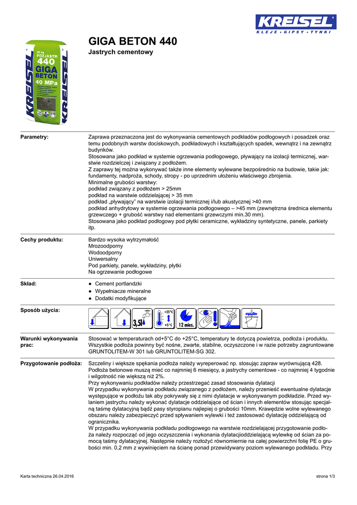 GIGA BETON 440 Jastrych cementowy Parametry: Zaprawa przeznaczona jest do wykonywania cementowych podkładów podłogowych i posadzek oraz temu podobnych warstw dociskowych, podkładowych i kształtujących spadek, wewnątrz i na zewnątrz budynków. Stosowana jako podkład w systemie ogrzewania podłogowego, pływający na izolacji termicznej, warstwie rozdzielczej i związany z podłożem. Z zaprawy tej można wykonywać także inne elementy wylewane bezpośrednio na budowie, takie jak: fundamenty, nadproża, schody, stropy - po uprzednim ułożeniu właściwego zbrojenia. Minimalne grubości warstwy: podkład związany z podłożem > 25mm podkład na warstwie oddzielającej > 35 mm podkład „pływający” na warstwie izolacji termicznej i/lub akustycznej >40 mm podkład anhydrytowy w systemie ogrzewania podłogowego – >45 mm (zewnętrzna średnica elementu grzewczego + grubość warstwy nad elementami grzewczymi min.30 mm). Stosowana jako podkład podłogowy pod płytki ceramiczne, wykładziny syntetyczne, panele, parkiety itp. Cechy produktu: Bardzo wysoka wytrzymałość Mrozoodporny Wodoodporny Uniwersalny Pod parkiety, panele, wykładziny, płytki Na ogrzewanie podłogowe Skład: ● Cement portlandzki ● Wypełniacze mineralne ● Dodatki modyfikujące Sposób użycia: Warunki wykonywania prac: Stosować w temperaturach od+5°C do +25°C, temperatury te dotyczą powietrza, podłoża i produktu. Wszystkie podłoża powinny być nośne, zwarte, stabilne, oczyszczone i w razie potrzeby zagruntowane GRUNTOLITEM-W 301 lub GRUNTOLITEM-SG 302. Przygotowanie podłoża: Szczeliny i większe spękania podłoża należy wyreperować np. stosując zapraw wyrównującą 428. Podłoża betonowe muszą mieć co najmniej 6 miesięcy, a jastrychy cementowe - co najmniej 4 tygodnie i wilgotność nie większą niż 2%. Przy wykonywaniu podkładów należy przestrzegać zasad stosowania dylatacji W przypadku wykonywania podkładu związanego z podłożem, należy przenieść ewentualne dylatacje występujące w podłożu tak aby pokrywały się z nimi dylatacje w wykonywanym podkładzie. Przed wylaniem jastrychu należy wykonać dylatacje oddzielające od ścian i innych elementów stosując specjalną taśmę dylatacyjną bądź pasy styropianu najlepiej o grubości 10mm. Krawędzie wolne wylewanego obszaru należy zabezpieczyć przed spływaniem wylewki i też zastosować dylatację oddzielającą od ogranicznika. W przypadku wykonywania podkładu podłogowego na warstwie rozdzielającej przygotowanie podłoża należy rozpocząć od jego oczyszczenia i wykonania dylatacjioddzielającą wylewkę od ścian za pomocą taśmy dylatacyjnej. Następnie należy rozłożyć równomiernie na całej powierzchni folię PE o grubości min. 0,2 mm z wywinięciem na ścianę ponad przewidywany poziom wylewanego podkładu. Przy Karta techniczna 26.04.2016 strona 1/3 GIGA BETON 440 Jastrych cementowy połączeniach folii trzeba zastosować zakład min.10cm i skleić ją na złączach taśmą samoprzylepną lub zgrzać, tak aby uzyskać szczelną izolację. W przypadku podkładu podłogowego „pływającego”na oczyszczonym i równym podłożu należy ułożyć mijankowo (z przesunięciem krawędzi) płyty ze styropianu lub wełny mineralnej odpowiedniej twardości. Układać je tak, aby nie występowały szczeliny miedzy nimi. Przy stosowaniu płyt styropianowych można zastosować podsypkę z piasku niwelującą ewentualne nierówności, które mogą powodować łamanie się płyt lub ich klawiszowanie. Wykonać dylatacjęoddzielającą wylewkę od ścian za pomocą taśmy dylatacyjnej. Następnie należy rozłożyć równomiernie na całej powierzchni folię PE o grubości min. 0,2 mm z wywinięciem na ścianę ponad przewidywany poziom wylewanego podkładu. Przy połączeniach folii trzeba zastosować zakład min.10 cm i skleić ją na złączach taśmą samoprzylepną lub zgrzać, tak aby uzyskać szczelną izolację. Uwaga: Prawidłowo wykonany podkład „pływający” nie może bezpośrednio łączyć się ze ścianą, podłożem pod izolacją lub elementami instalacji. należy sprawdzić szczelność i zamocowanie instalacji grzewczej. W przypadku ogrzewania wodnego rury napełnić wodą w celu zapobiegnięcia ich wypływaniu w trakcie prowadzenia prac. Rodzaje podłoża: Betony, żelbety: Zagruntować GRUNTOLITEM-W 301, wylewać sposobem "mokre na mokre" Jastrych cementowy: Zagruntować GRUNTOLITEM-W 301 Przygotowanie produktu: Suchą mieszankę należy wsypywać stopniowo do pojemnika zawierającego odpowiednią ilość czystej, chłodnej wody, mieszając ręcznie lub mechanicznie za pomocą wolnoobrotowego mieszadła, aż do uzyskania jednorodnej, pozbawionej grudek masy. Odstawić na czas dojrzewania wynoszący 5 minut i ponownie dokładnie wymieszać. W przypadku potrzeby wykorzystania części opakowania, całą suchą mieszankę należy starannie wymieszać, gdyż w czasie transportu mogło nastąpić rozdzielenie składników. Stwardniałej zaprawy nie mieszać z woda, ani ze świeżym materiałem. Sposób użycia: Przygotowaną zaprawę należy układać, najczęściej pomiędzy listwami kierunkowymi, warstwą o grubości uzależnionej od rodzaju konstrukcji podłogi oraz ściśliwości warstwy izolacji termicznej lub akustycznej. Nadmiar zaprawy ściągnąć łatą po prowadnicach i po wstępnym zwiazaniu zatrzeć powierzchnię pacą. W przypadku dużych obciążeń podłogi, znacznych wahań temperatury, podłóg na stropach z elementów prefabrykowanych w pomieszczeniach o zwiększonej intensywności eksploatacji, przy układaniu podkładu na warstwie izolacji termicznej lub akustycznej o dużej odkształcalności, a także w celu zmniejszenia liczby dylatacji przeciwskurczowych, stosuje się zbrojenie podkładów Uwagi wykonawcze: Wylewkę chronić przez pierwsze 7 dni od jej wykonania przed nadmiernym nasłonecznieniem, zbyt wysoką temperaturą, silnym wiatrem i wodą (opadami) o