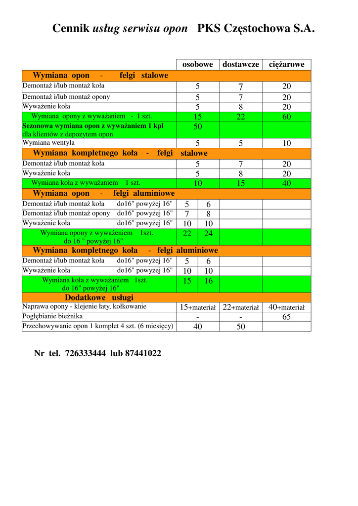 Cennik usług serwisu opon PKS Częstochowa S.A.