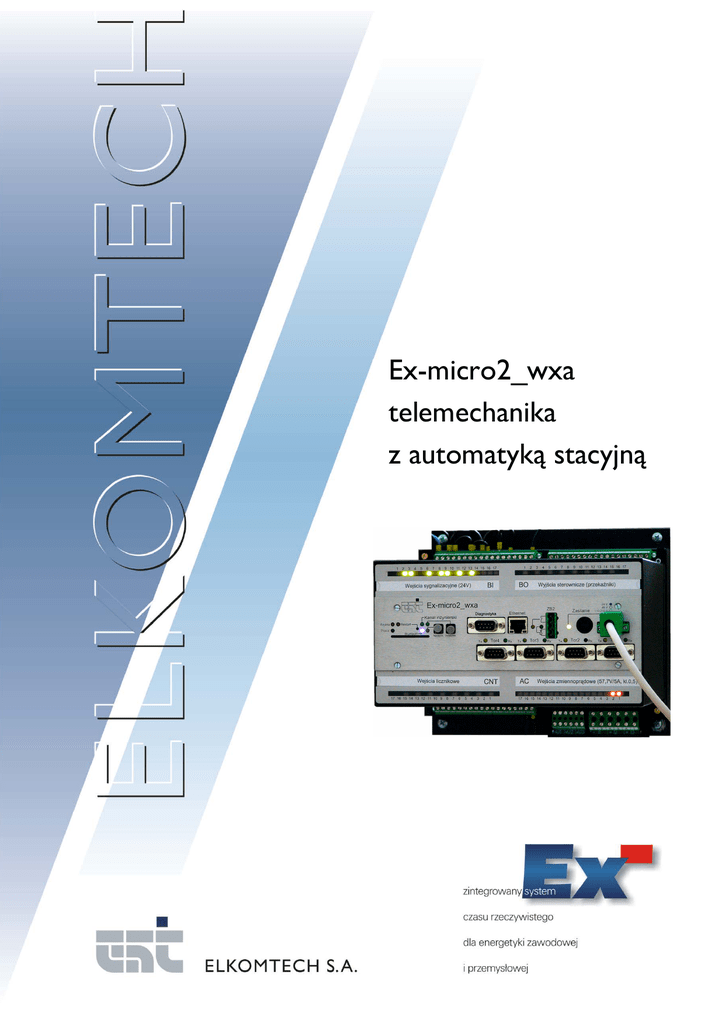 Ex-micro2_wxa telemechanika z automatyką stacyjną Ex-micro2_wxa - telemechanika z automatyką stacyjną Przeznaczenie Typy modułów Ex-micro2_wxa jest programowalnym, uniwersalnym sterownikiem, który może pełnić funkcję zarówno stacji telemechaniki (RTU) jak i koncentratora danych. Ex-micro2_BI_16 - moduł wejść binarnych umożliwiający podłączenie 16 sygnalizacji (dwie grupy po 8). Napięcie sygnalizacji może wynosić 24V=, 110V= lub 220V=. Moduł pozwala na wykrywanie zmian stanów wejść z rozdzielczością czasową 1ms. Informacje o zmianach zapamiętywane są z cechą czasu, co umożliwia analizę sekwencji zdarzeń sygnalizacyjnych. Czas filtrowania sygnałów wejściowych (eliminacja drgań styków) jest indywidualnie programowany dla każdego z wejść, podobnie jak negacja stanu. Wbudowane oprogramowanie pozwala na uruchomienie automatyk stacyjnych wykorzystujących wszystkie dane obecne w sterowniku, pochodzące zarówno ze źródeł lokalnych jak i zdalnych. Budowa Sterownik charakteryzuje się małymi gabarytami oraz odporną mechanicznie obudową (blacha stalowa). Zastosowanie rozłączalnej podstawy (wyposażonej w złącza śrubowe do podłączenia sterownika z obiektem) od modułu głównego (zawierającego obwody elektroniczne) umożliwia łatwe prace serwisowe urządzenia bez pracochłonnego odłączania obwodów elektrycznych z obiektu. Podstawa może być mocowana na ścianie, stojaku lub w szafie. Widok Ex-micro2_wxa Modułowa konstrukcja urządzenia pozwala na elastyczną konfigurację sterownika, limitowaną jedynie liczbą modułów elektronicznych (cztery pakiety wejścia/wyjścia oraz do trzech pakietów łączności), które mogą być jednocześnie zainstalowane. Moduły wyposażone są w lokalny pulpit synoptyczny. Ex-micro2_BO_8 – umożliwia generowanie 8 impulsowych sygnałów binarnych (sterowniczych) typu 1 z N. Czas sterowania przesyłany jest torem łącznościowym podczas polecenia sterowniczego lub programowalny w telemechanice. Impuls sterowniczy ≤ 5s. Ex-micro2_AC6P moduł pomiarów zmiennoprądowych. Pakiet pozwala na podłączenie trzech napięć fazowych oraz trzech prądów. Obwody wejściowe napięciowe mogą być skonfigurowane w gwiazdę ze wspólnym przewodem zerowym lub jako izolowane galwanicznie między sobą (w zależności od wykonania modułu). Klasa pomiaru parametrów sieci wynosi 0,5. Moduł umożliwia pomiar następujących parametrów sieci: wartości skutecznych prądów fazowych, wartości skutecznych napięć fazowych, wartości skutecznych napięć międzyfazowych, mocy czynnych dla wszystkich faz, mocy biernych dla wszystkich faz, sumy mocy czynnych i biernych, częstotliwości sieci. Ex-micro2_AI_8 umożliwia pomiar ośmiu sygnałów analogowych stałoprądowych. W zależności od wykonania moduł umożliwia pomiary jednokierunkowe lub dwukierunkowe, napięciowe lub prądowe o standardowych zakresach (0...5mA, ±5mA, 0...10mA, ±10mA, 0...20mA, 0...5V, ±5V). Zakres jednokierunkowy lub dwukierunkowy ustawiany jest dla wszystkich wejść wspólnie. Ex-micro2_DCO_8 umożliwia generację analogowych sygnałów stałoprądowych. Może posiadać 4 lub 8 wyjść ze wspólnym zaciskiem GND. Standard wyjść jest zależny od wersji wykonania i może wynosić 0...5mA, ±5mA, 0...10mA, 0...20mA, 4...20mA. Do poprawnej pracy pakietu wymagane jest dodatkowe zewnętrzne zasilanie 24VDC. Ex-micro2_IMP_8 posiada 8 wzajemnie izolowanych torów wejściowych. Umożliwia zliczanie i rejestrację impulsów z liczników energii o częstotliwości do 1kHz. Stany liczydeł rejestrowane są typowo co 15 minut (czas może być programowany) i zapamiętywane w pamięci nieulotnej. Możliwa jest również rejestracja przyrostów w określonym przedziale okresu rejestracji stanów. Stan próbek pamiętany jest za okres do 42 dni, natomiast przyrostów do 48 godzin. Rozdzielczość systemu pomiarowego Ex-micro2_wxa wynosi 10 lub 12 bitów (w zależności od wykonania). Sterownik może również zbierać dane z zewnętrznych przetworników A/C na drodze łączności cyfrowej. Realizacja blokad stacyjnych, polowych i międzypolowych Sterownik Ex-micro_wxa może realizować blokady logiczne. Funkcja blokad umożliwia przypisanie do każdego polecenia sterowniczego, lokalnego lub zdalnego, warunków powodujących odrzucenie sterowania. Warunki te odpowiadają wyspecyfikowanym stanom urządzeń wykonawczych, a informacje o ich aktualnym położeniu pochodzą z sytemu telemechaniki nadzorującego stację. Informacja o odrzuceniu polecenia i przyczynach, które je spowodowały jest rejestrowana w dzienniku zdarzeń. System może być opcjonalnie skonfigurowany tak, aby po odpowiednim ostrzeżeniu istniała możliwość "przełamania" blokady. Realizacja automatyk Sterownik w wersji Ex-micro2_wxa posiada dostępny dla użytkownika system automatyk opartych o programowalne sekwencje oraz moduł logiki kombinacyjnej. Pozwala to na uruchomienie automatyk stacyjnych wykorzystujących wszystkie dane obecne w sterowniku, pochodzące zarówno ze źródeł lokalnych jak i zdalnych. Sekwencje programowalne – umożliwiają stworzenie w konfiguracji urządzenia algorytmu składającego się z kolejnych kroków. W każdym kroku można zaprogramować wykonanie sterowanie, ustawienie stanu wewnętrznego (zmiennej), itp. Wykonanie danego kroku może być uzależnione od warunku logicznego. Można także wprowadzić czas oczekiwania na spełnienie warunku w danym kroku. Moduł sekwencji może korzystać z modułu logiki kombinacyjnej. Sekwencje mogą być wyzwalane zdalnie, lokalnie wejściem dwustanowym lub automatycznie na podstawie stanów wewnętrznych. Logika kombinacyjna (kalkulator) – umożliwia stworzenie wielu funkcji logicznych i arytmetycznych, których argumentami są stany wewnętrzne i stany wejść. Funkcje mogą ustawić stan wewnętrzny lub pobudzić skonfigurowane wyjście. Funkcje kalkulatora można powiązać z sekwencjami programowa