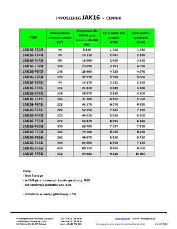 TYPOSZEREG JAK16 - CENNIK TYP Powierzchnia wymiany ciepła [m2] Wydajność dla R404A przy to=-5°C i dt1=8K [W] Cena netto bez grzałek [EUR] Cena netto z grzałkami [EUR] 49 8 830 1 758 1 940 74 14 110 2 041 2 280 99 18 990 2 920 3 150 124 23 890 3 783 4 090 148 28 960 4 720 4 970 173 32 570 5 558 5 800 74 14 370 2 131 2 350 111 21 810 3 089 3 280 148 29 570 3 910 4 100 186 37 280 4 859 5 050 223 44 170 6 070 6 250 260 52 650 7 145 7 300 220 44 520 5 039 5 250 275 54 870 6 092 6 280 330 68 700 7 137 7 350 386 79 380 8 220 8 420 262 46 570 5 520 5 720 349 63 900 6 950 7 150 436 80 150 8 450 8 650 523 94 880 9 820 10 030 JAK16-F240 JAK16-F340 JAK16-F440 JAK16-F540 JAK16-F640 JAK16-F740 JAK16-F245 JAK16-F345 JAK16-F445 JAK16-F545 JAK16-F645 JAK16-F745 JAK16-F450 JAK16-F550 JAK16-F650 JAK16-F750 JAK16-F356 JAK16-F456 JAK16-F556 JAK16-F656 Ceny: - loco Tarczyn - w EUR przeliczane po kursie sprzedaży NBP - nie zawierają podatku VAT 23% - chłodnice w wersji glikolowej + 5% Przedsiębiorstwo Produkcji Urządzeń Chłodniczych Tarczyn Sp. z o.o. Ul. Błońska 85, 05-555 Tarczyn Tel. +48 22 727 86 86 Fax: +48 22 727 81 61 kom.+48 697 702 206 www.ppuch.pl e-mail: [email protected] Zastrzegamy sobie prawo do wprowadzania zmian styczeń 2012 TYPOSZEREG TAK16 - CENNIK TYP Powierzchnia wymiany ciepła [m2] Wydajność dla R404A przy to=-5°C i dt1=8K [W] Cena netto bez grzałek [EUR] Cena netto z grzałkami [EUR] 66 9 520 1 850 2 220 99 14 990 2 780 3 210 132 20 070 3 810 4 305 165 25 200 4 620 5 130 198 30 850 5 385 5 908 231 34 820 6 609 7 130 99 14 650 2 559 3 040 149 22 240 3 672 4 165 198 30 000 4 800 5 305 248 37 650 5 851 6 536 297 45 070 6 916 7 438 347 52 810 8 152 8 687 294 47 040 5 094 5 598 367 58 250 6 234 6 747 440 72 830 7 407 7 930 514 84 920 8 547 9 080 TAK16-F240 TAK16-F340 TAK16-F440 TAK16-F540 TAK16-F640 TAK16-F740 TAK16-F245 TAK16-F345 TAK16-F445 TAK16-F545 TAK16-F645 TAK16-F745 TAK16-F450 TAK16-F550 TAK16-F650 TAK16-F750 Ceny: - loco Tarczyn - w EUR przeliczane po kursie sprzedaży NBP - nie zawierają podatku VAT 23% - chłodnice w wersji glikolowej + 5% Przedsiębiorstwo Produkcji Urządzeń Chłodniczych Tarczyn Sp. z o.o. Ul. Błońska 85, 05-555 Tarczyn Tel. +48 22 727 86 86 Fax: +48 22 727 81 61 kom.+48 697 702 206 www.ppuch.pl e-mail: [email protected] Zastrzegamy sobie prawo do wprowadzania zmian listopad 2011 Cennik nagrzewnic NWO NWO-100 øD [mm] 100 3/8” A [mm] 190 B [mm] 215 C [mm] 305 b [mm] 138 Waga [kg] 6 NWO-125 125 3/8” 190 215 305 138 7 NWO-160 160 3/8” 265 290 305 213 8 NWO-200 200 3/8” 265 290 305 213 10 NWO-250 250 1/2” 390 365 345 338 13 NWO-315 315 1/2” 465 440 345 413 17 NWO-400 400 1/2” 540 515 385 488 21 NWO-500 500 3/4” 640 625 385 588 28 Typ ød Cena netto [EUR] 190 200 215 230 275 300 365 440 Cennik chłodnic CWO Typ ød CWO-100 øD [mm] 100 ½” A [mm] 240 B [mm] 190 C [mm] 98 L [mm] 355 K [mm] 285 Waga [kg] 6 CWO-125 125 ¾” 330 265 188 355 285 7 CWO-160 160 ¾” 330 265 180 355 285 8 CWO-200 200 ¾” 405 340 263 355 285 10 CWO-250 250 ¾” 480 415 338 355 285 13 CWO-315 315 ¾” 555 490 413 355 285 17 CWO-400 400 ¾” 715 515 438 425 315 21 Przedsiębiorstwo Produkcji Urządzeń Chłodniczych Tarczyn Sp. z o.o. Ul. Błońska 85, 05-555 Tarczyn Tel. +48 22 727 86 86 Fax: +48 22 727 81 61 kom.+48 697 702 206 www.ppuch.pl Cena netto [EUR] 210 230 255 280 345 370 445 e-mail: [email protected] Zastrzegamy sobie prawo do wprowadzania zmian luty 2012 CENNIK WODNYCH NAGRZEWNIC POWIETRZA PRODUKOWANYCH PRZEZ PPUCh TARZCYN Wodna nagrzewnica powietrza LAVA LAVA 1 LAVA 2 LAVA 3 410 EUR 460 EUR 510 EUR Wodna nagrzewnica powietrza BRYZA z opcją chłodzenia BRYZA 980 EUR Wodna nagrzewnica powietrza CYKLON cyrkulacyjna CYKLON 640 EUR Wodna nagrzewnica powietrza FALA FALA 1 FALA 2 398 EUR 633 EUR Ceny: - loco Tarczyn - w EUR przeliczane po kursie sprzedaży NBP - WSZYSTKIE CENY NETTO – NALEŻY DOLICZYD VAT 23% Przedsiębiorstwo Produkcji Urządzeń Chłodniczych Tarczyn Sp. z o.o. Ul. Błońska 85, 05-555 Tarczyn Tel. +48 22 727 86 86 Fax: +48 22 727 81 61 kom.+48 697 702 206 www.ppuch.pl e-mail: [email protected] Zastrzegamy sobie prawo do wprowadzania zmian luty 2012 Cennik wentylatorowych chłodnic cieczy typoszeregu DR na wentylatorach ø630 [kW] Przepływ powietrza 3 [m /h] Poziom hałasu [dB(A)] Wlot Wylot [cal] Opory czynnika [kPa] Przepływ czynnika 3 [m /h] DR-13633HA51 107,7 31 800 57 1 ½” 35,6 18,7 DR-13634HA68 116,5 30 000 57 1 ½” 35,9 DR-14633HA51 145,3 42 000 59 2” DR-14634HA68 158,0 40 000 59 DR-15633HA51 185,0 53 000 DR-15634HA68 200,0 50 000 Wydajnośd Typ Objętośd wewn. 3 [dcm ] Masa [kg] 254 41 335 20,2 340 53 370 46,7 25,2 340 54 445 2” 42,4 27,4 452 70 485 60 2 ½” 65,7 32,1 424 69 555 60 2 ½” 52,5 34,6 565 88 615 Powierzchnia 2 [m ] CENA NETTO [EUR] 4 230 4 670 5 560 6 170 7 250 7 750 1. Wentylatory – ø630 ssące – 940W/400V 2. Wydajnośd Q[kW] obliczona wg PN-EN 1048:2001 3. Głośnośd podana jako ciśnienie dźwięku z odległości 10m. Ceny: - loco Tarczyn - w EUR przeliczane po kursie sprzedaży NBP - nie zawierają podatku VAT 23% Przedsiębiorstwo Produkcji Urządzeń Chłodniczych Tarczyn Sp. z o.o. Ul. Błońska 85, 05-555 Tarczyn Tel. +48 22 727 86 86 Fax: +48 22 727 81 61 kom.+48 697 702 206 www.ppuch.pl e-mail: [email protected] Zastrzegamy sobie prawo do wprowadzania zmian luty 2012 Cennik wentylatorowych chłodnic cieczy typoszeregu VD na wentylatorach ø630 Typ Wydajnośd [kW] Przepływ powietrza 3 [m /h] Poziom hałasu [dB(A)] Wlot wylot [cal] Powierzchnia 2 [m ] Objętośd wewn. 3 [dcm ] Ilośd went. [szt.] Masa [kg] Cena netto [EUR] VD-21634 125,7 33 200 65 1 ½” 307 70 2 380 6400 VD-22634 256,4 66 400 66 2” 614 128 4 700 12620 VD-23634 384,7 99 600 70 2 ½” 921 174 6 1010 18840 VD-24634 503,0 132 800 71 3” 1229 233 8 1330 26090 VD-25634 634,0 166 000 72 4” 1536 281 10 1640 37050 1. Wentylatory – ø630 ssące – 1,9kW/400V 2. Wydajnośd Q[kW] obliczona wg PN-EN 