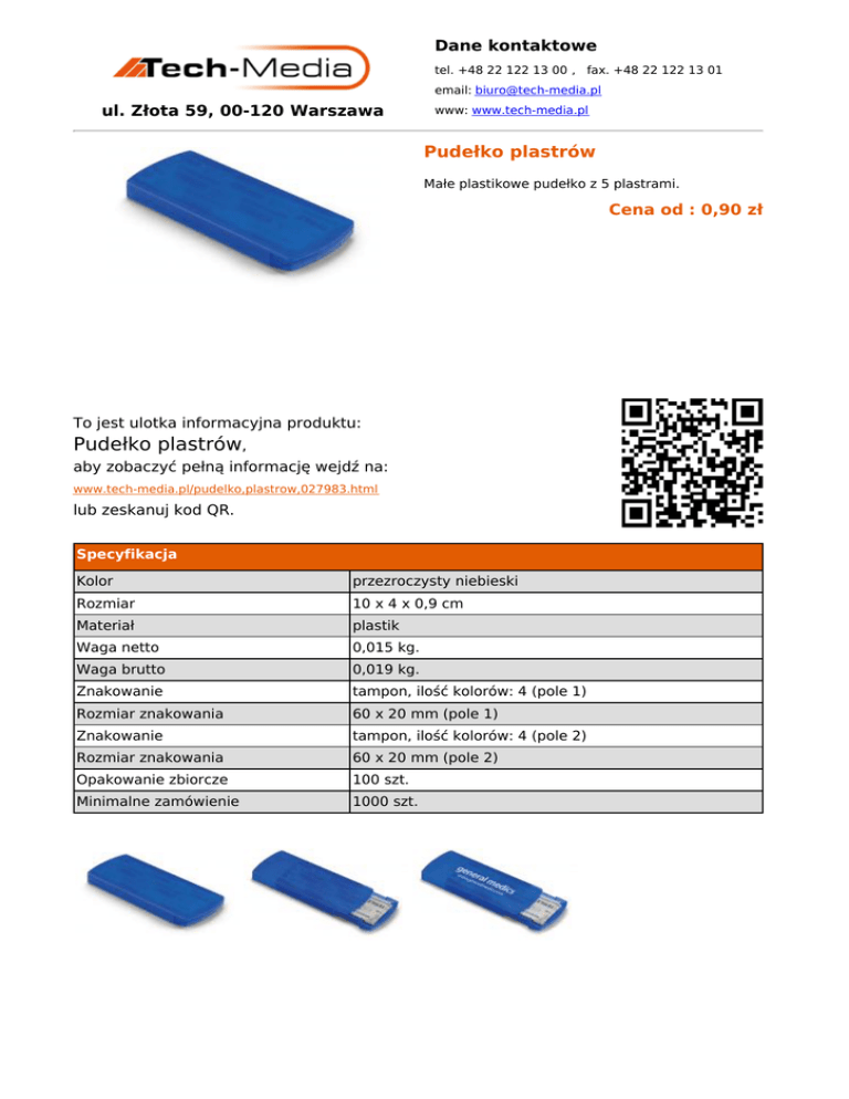 Dane kontaktowe tel. +48 22 122 13 00 , fax. +48 22 122 13 01 email: [email protected] ul. Złota 59, 00-120 Warszawa www: www.tech-media.pl Pudełko plastrów Małe plastikowe pudełko z 5 plastrami. Cena od : 0,90 zł To jest ulotka informacyjna produktu: Pudełko plastrów, aby zobaczyć pełną informację wejdź na: www.tech-media.pl/pudelko,plastrow,027983.html lub zeskanuj kod QR. Specyfikacja Kolor przezroczysty niebieski Rozmiar 10 x 4 x 0,9 cm Materiał plastik Waga netto 0,015 kg. Waga brutto 0,019 kg. Znakowanie tampon, ilość kolorów: 4 (pole 1) Rozmiar znakowania 60 x 20 mm (pole 1) Znakowanie tampon, ilość kolorów: 4 (pole 2) Rozmiar znakowania 60 x 20 mm (pole 2) Opakowanie zbiorcze 100 szt. Minimalne zamówienie 1000 szt.