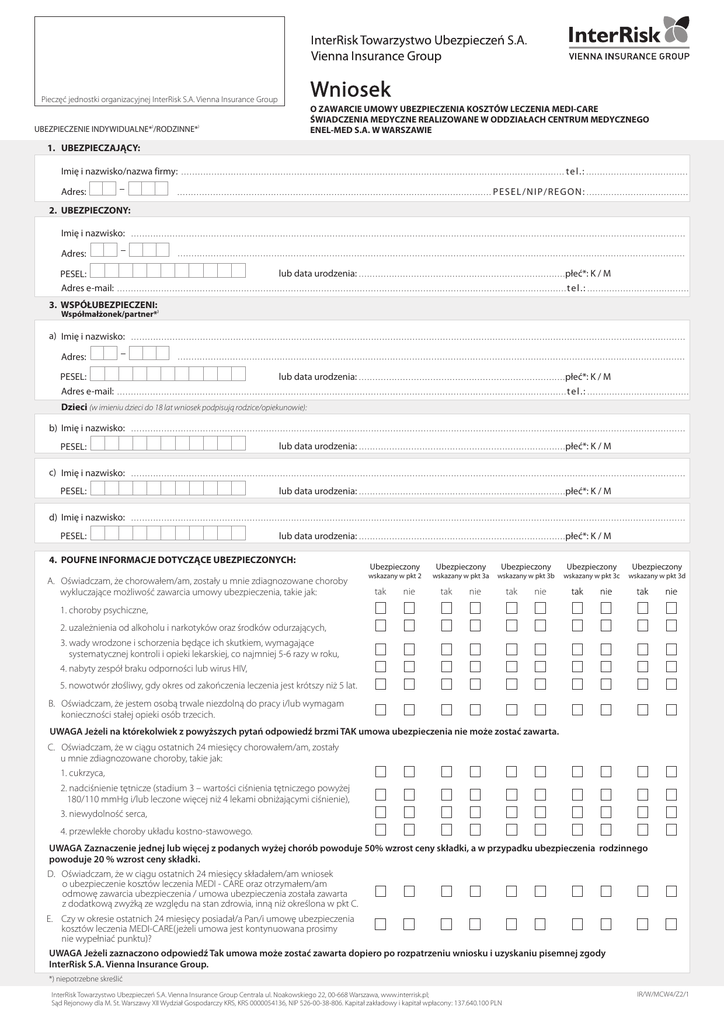 Wniosek Pieczęć jednostki organizacyjnej InterRisk S.A. Vienna Insurance Group ) O ZAWARCIE UMOWY UBEZPIECZENIA KOSZTÓW LECZENIA MEDI-CARE ŚWIADCZENIA MEDYCZNE REALIZOWANE W ODDZIAŁACH CENTRUM MEDYCZNEGO ENEL-MED S.A. W WARSZAWIE ) UBEZPIECZENIE INDYWIDUALNE* /RODZINNE* 1. UBEZPIECZAJĄCY: Imię i nazwisko/nazwa firmy: . . . . . . . . . . . . . . . . . . . . . . . . . . . . . . . . . . . . . . . . . . . . . . . . . . . . . . . . . . . . . . . . . . . . . . . . . . . . . . . . . . . . . . . . . . . . . . . . . . . . . . . . . . . . . . . . . . . . . . . . . . . . . . . . . . . . . . . . . . . te l. : . . . . . . . . . . . . . . . . . . . . . . . . . . . . . . . . . . . . . Adres: .................................................................................................................. PESEL/NIP/REGON: ..................................... 2. UBEZPIECZONY: Imię i nazwisko: . . . . . . . . . . . . . . . . . . . . . . . . . . . . . . . . . . . . . . . . . . . . . . . . . . . . . . . . . . . . . . . . . . . . . . . . . . . . . . . . . . . . . . . . . . . . . . . . . . . . . . . . . . . . . . . . . . . . . . . . . . . . . . . . . . . . . . . . . . . . . . . . . . . . . . . . . . . . . . . . . . . . . . . . . . . . . . . . . . . . . . . . . . . . . . . . . . . . . . . . . Adres: ........................................................................................................................................................................................ lub data urodzenia: . . . . . . . . . . . . . . . . . . . . . . . . . . . . . . . . . . . . . . . . . . . . . . . . . . . . . . . . . . . . . . . . . . . . . . . . . . . płeć*: K / M PESEL: Adres e-mail: . . . . . . . . . . . . . . . . . . . . . . . . . . . . . . . . . . . . . . . . . . . . . . . . . . . . . . . . . . . . . . . . . . . . . . . . . . . . . . . . . . . . . . . . . . . . . . . . . . . . . . . . . . . . . . . . . . . . . . . . . . . . . . . . . . . . . . . . . . . . . . . . . . . . . . . . . . . . . . . . . . . te l. : . . . . . . . . . . . . . . . . . . . . . . . . . . . . . . . . . . . . . 3. WSPÓŁUBEZPIECZENI: Współmałżonek/partner*) a) Imię i nazwisko: . . . . . . . . . . . . . . . . . . . . . . . . . . . . . . . . . . . . . . . . . . . . . . . . . . . . . . . . . . . . . . . . . . . . . . . . . . . . . . . . . . . . . . . . . . . . . . . . . . . . . . . . . . . . . . . . . . . . . . . . . . . . . . . . . . . . . . . . . . . . . . . . . . . . . . . . . . . . . . . . . . . . . . . . . . . . . . . . . . . . . . . . . . . . . . . . . . . . . . . . . Adres: ........................................................................................................................................................................................ lub data urodzenia: . . . . . . . . . . . . . . . . . . . . . . . . . . . . . . . . . . . . . . . . . . . . . . . . . . . . . . . . . . . . . . . . . . . . . . . . . . . płeć*: K / M PESEL: Adres e-mail: . . . . . . . . . . . . . . . . . . . . . . . . . . . . . . . . . . . . . . . . . . . . . . . . . . . . . . . . . . . . . . . . . . . . . . . . . . . . . . . . . . . . . . . . . . . . . . . . . . . . . . . . . . . . . . . . . . . . . . . . . . . . . . . . . . . . . . . . . . . . . . . . . . . . . . . . . . . . . . . . . . . te l. : . . . . . . . . . . . . . . . . . . . . . . . . . . . . . . . . . . . . . Dzieci (w imieniu dzieci do 18 lat wniosek podpisują rodzice/opiekunowie): b) Imię i nazwisko: . . . . . . . . . . . . . . . . . . . . . . . . . . . . . . . . . . . . . . . . . . . . . . . . . . . . . . . . . . . . . . . . . . . . . . . . . . . . . . . . . . . . . . . . . . . . . . . . . . . . . . . . . . . . . . . . . . . . . . . . . . . . . . . . . . . . . . . . . . . . . . . . . . . . . . . . . . . . . . . . . . . . . . . . . . . . . . . . . . . . . . . . . . . . . . . . . . . . . . . . . PESEL: lub data urodzenia: . . . . . . . . . . . . . . . . . . . . . . . . . . . . . . . . . . . . . . . . . . . . . . . . . . . . . . . . . . . . . . . . . . . . . . . . . . .płeć*: K / M c) Imię i nazwisko: . . . . . . . . . . . . . . . . . . . . . . . . . . . . . . . . . . . . . . . . . . . . . . . . . . . . . . . . . . . . . . . . . . . . . . . . . . . . . . . . . . . . . . . . . . . . . . . . . . . . . . . . . . . . . . . . . . . . . . . . . . . . . . . . . . . . . . . . . . . . . . . . . . . . . . . . . . . . . . . . . . . . . . . . . . . . . . . . . . . . . . . . . . . . . . . . . . . . . . . . . PESEL: lub data urodzenia: . . . . . . . . . . . . . . . . . . . . . . . . . . . . . . . . . . . . . . . . . . . . . . . . . . . . . . . . . . . . . . . . . . . . . . . . . . .płeć*: K / M d) Imię i nazwisko: . . . . . . . . . . . . . . . . . . . . . . . . . . . . . . . . . . . . . . . . . . . . . . . . . . . . . . . . . . . . . . . . . . . . . . . . . . . . . . . . . . . . . . . . . . . . . . . . . . . . . . . . . . . . . . . . . . . . . . . . . . . . . . . . . . . . . . . . . . . . . . . . . . . . . . . . . . . . . . . . . . . . . . . . . . . . . . . . . . . . . . . . . . . . . . . . . . . . . . . . . PESEL: lub data urodzenia: . . . . . . . . . . . . . . . . . . . . . . . . . . . . . . . . . . . . . . . . . . . . . . . . . . . . . . . . . . . . . . . . . . . . . . . . . . .płeć*: K / M 4. POUFNE INFORMACJE DOTYCZĄCE UBEZPIECZONYCH: A. Oświadczam, że chorowałem/am, zostały u mnie zdiagnozowane choroby wykluczające możliwość zawarcia umowy ubezpieczenia, takie jak: Ubezpieczony Ubezpieczony Ubezpieczony Ubezpieczony Ubezpieczony wskazany w pkt 2 wskazany w pkt 3a wskazany w pkt 3b wskazany w pkt 3c wskazany w pkt 3d tak nie tak nie tak nie tak nie tak nie 1. choroby psychiczne, 2. uzależnienia od alkoholu i narkotyków oraz środków odurzających, 3. wady wrodzone i schorzenia będące ich skutkiem, wymagające systematycznej kontroli i opieki lekarskiej, co najmniej 5-6 razy w roku, 4. nabyty zespół braku odporności lub wirus HIV, 5. nowotwór złośliwy,