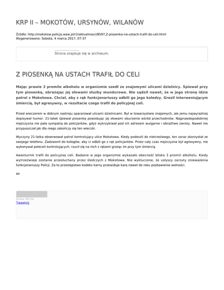 KRP II – MOKOTÓW, URSYNÓW, WILANÓW Źródło: http://mokotow.policja.waw.pl/r2/aktualnosci/8597,Z-piosenka-na-ustach-trafil-do-celi.html Wygenerowano: Sobota, 4 marca 2017, 07:37 Strona znajduje się w archiwum. Z PIOSENKĄ NA USTACH TRAFIŁ DO CELI Mając prawie 3 promile alkoholu w organizmie szedł ze znajomymi ulicami dzielnicy. Śpiewał przy tym piosenkę, obrażając jej słowami służby mundurowe. Nie sądził nawet, że w jego stronę idzie patrol z Mokotowa. Chciał, aby z rąk funkcjonariuszy odbili go jego koledzy. Groził interweniującym śmiercią, był agresywny, w rezultacie czego trafił do policyjnej celi. Przed wieczorem w dobrym nastroju spacerował ulicami dzielnicami. Był w towarzystwie znajomych, ale jemu najwyraźniej dopisywał humor. 21-latek śpiewał piosenkę powodując jej słowami oburzenie wśród przechodniów. Najprawdopodobniej mężczyzna nie pała sympatią do policjantów, gdyż wykrzykiwał pod ich adresem wulgarne i obraźliwe zwroty. Nawet nie przypuszczał jak dla niego zakończy się ten wieczór. Wyczyny 21-latka obserwował patrol kontrolujący ulice Mokotowa. Kiedy podeszli do nietrzeźwego, ten zaraz skorzystał ze swojego telefonu. Zadzwonił do kolegów, aby ci odbili go z rąk policjantów. Przez cały czas mężczyzna był agresywny, nie wykonywał poleceń kontrolujących, rzucił się na nich z rękami grożąc im przy tym śmiercią. Awanturnik trafił do policyjnej celi. Badanie w jego organizmie wykazało obecność blisko 3 promili alkoholu. Kiedy wytrzeźwieje zostanie przesłuchany przez śledczych z Mokotowa. Nie wykluczone, że usłyszy zarzuty znieważenia funkcjonariuszy Policji. Za to przestępstwo kodeks karny przewiduje karę nawet do roku pozbawienia wolności. ao Ocena: 0/5 (0) Tweetnij