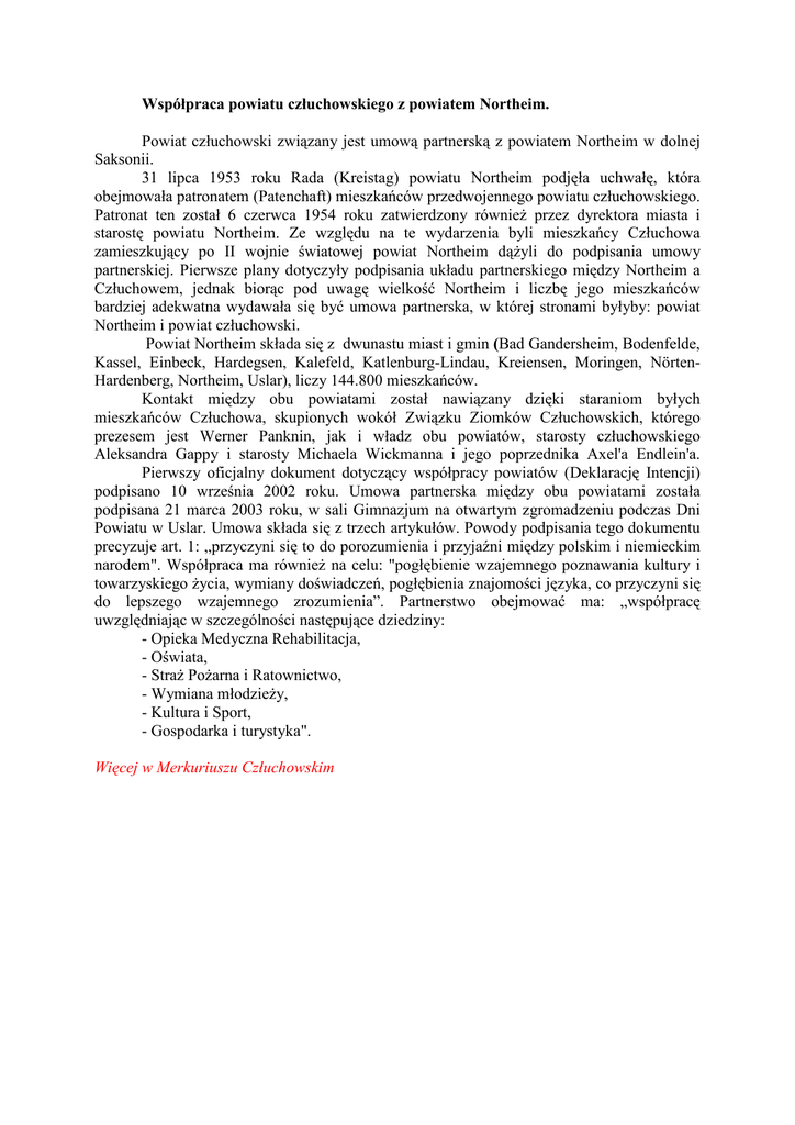 Współpraca powiatu człuchowskiego z powiatem Northeim. Powiat człuchowski związany jest umową partnerską z powiatem Northeim w dolnej Saksonii. 31 lipca 1953 roku Rada (Kreistag) powiatu Northeim podjęła uchwałę, która obejmowała patronatem (Patenchaft) mieszkańców przedwojennego powiatu człuchowskiego. Patronat ten został 6 czerwca 1954 roku zatwierdzony równieŜ przez dyrektora miasta i starostę powiatu Northeim. Ze względu na te wydarzenia byli mieszkańcy Człuchowa zamieszkujący po II wojnie światowej powiat Northeim dąŜyli do podpisania umowy partnerskiej. Pierwsze plany dotyczyły podpisania układu partnerskiego między Northeim a Człuchowem, jednak biorąc pod uwagę wielkość Northeim i liczbę jego mieszkańców bardziej adekwatna wydawała się być umowa partnerska, w której stronami byłyby: powiat Northeim i powiat człuchowski. Powiat Northeim składa się z dwunastu miast i gmin (Bad Gandersheim, Bodenfelde, Kassel, Einbeck, Hardegsen, Kalefeld, Katlenburg-Lindau, Kreiensen, Moringen, NörtenHardenberg, Northeim, Uslar), liczy 144.800 mieszkańców. Kontakt między obu powiatami został nawiązany dzięki staraniom byłych mieszkańców Człuchowa, skupionych wokół Związku Ziomków Człuchowskich, którego prezesem jest Werner Panknin, jak i władz obu powiatów, starosty człuchowskiego Aleksandra Gappy i starosty Michaela Wickmanna i jego poprzednika Axel'a Endlein'a. Pierwszy oficjalny dokument dotyczący współpracy powiatów (Deklarację Intencji) podpisano 10 września 2002 roku. Umowa partnerska między obu powiatami została podpisana 21 marca 2003 roku, w sali Gimnazjum na otwartym zgromadzeniu podczas Dni Powiatu w Uslar. Umowa składa się z trzech artykułów. Powody podpisania tego dokumentu precyzuje art. 1: „przyczyni się to do porozumienia i przyjaźni między polskim i niemieckim narodem". Współpraca ma równieŜ na celu: "pogłębienie wzajemnego poznawania kultury i towarzyskiego Ŝycia, wymiany doświadczeń, pogłębienia znajomości języka, co przyczyni się do lepszego wzajemnego zrozumienia”. Partnerstwo obejmować ma: „współpracę uwzględniając w szczególności następujące dziedziny: - Opieka Medyczna Rehabilitacja, - Oświata, - StraŜ PoŜarna i Ratownictwo, - Wymiana młodzieŜy, - Kultura i Sport, - Gospodarka i turystyka". Więcej w Merkuriuszu Człuchowskim