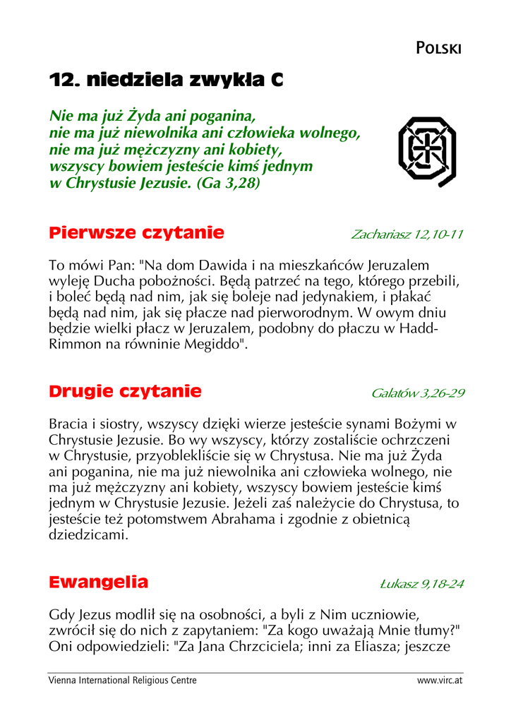 Polski Nie ma już Żyda ani poganina, nie ma już niewolnika ani człowieka wolnego, nie ma już mężczyzny ani kobiety, wszyscy bowiem jesteście kimś jednym w Chrystusie Jezusie. (Ga 3,28) To mówi Pan: "Na dom Dawida i na mieszkańców Jeruzalem wyleję Ducha pobożności. Będą patrzeć na tego, którego przebili, i boleć będą nad nim, jak się boleje nad jedynakiem, i płakać będą nad nim, jak się płacze nad pierworodnym. W owym dniu będzie wielki płacz w Jeruzalem, podobny do płaczu w HaddRimmon na równinie Megiddo". Bracia i siostry, wszyscy dzięki wierze jesteście synami Bożymi w Chrystusie Jezusie. Bo wy wszyscy, którzy zostaliście ochrzczeni w Chrystusie, przyoblekliście się w Chrystusa. Nie ma już Żyda ani poganina, nie ma już niewolnika ani człowieka wolnego, nie ma już mężczyzny ani kobiety, wszyscy bowiem jesteście kimś jednym w Chrystusie Jezusie. Jeżeli zaś należycie do Chrystusa, to jesteście też potomstwem Abrahama i zgodnie z obietnicą dziedzicami. Gdy Jezus modlił się na osobności, a byli z Nim uczniowie, zwrócił się do nich z zapytaniem: "Za kogo uważają Mnie tłumy?" Oni odpowiedzieli: "Za Jana Chrzciciela; inni za Eliasza; jeszcze Vienna International Religious Centre www.virc.at inni mówią, że któryś z dawnych proroków zmartwychwstał." Zapytał ich: "A wy za kogo Mnie uważacie?" Piotr odpowiedział: "Za Mesjasza Bożego". Wtedy surowo im przykazał i napomniał ich, żeby nikomu o tym nie mówili. I dodał: "Syn Człowieczy musi wiele wycierpieć: będzie odrzucony przez starszych, arcykapłanów i uczonych w Piśmie; będzie zabity, a trzeciego dnia zmartwychwstanie". Potem mówił do wszystkich: "Jeśli kto chce iść za Mną, niech się zaprze samego siebie, niech co dnia weźmie swój krzyż i niech Mnie naśladuje. Bo kto chce zachować swoje życie, straci je, a kto straci swe życie z mego powodu, ten je zachowa". Dzisiejszej niedzieli można postawić sobie pytanie: czy inni mogą w nas rozpoznać chrześcijan? Lub sformułowane inaczej: jak wygląda nasza bezkompromisowa gotowość do naśladowania Chrystusa? "Naśladowanie" – słowo, pojęcie, które podsuwa nam dzisiejsza Ewangelia. Tekst jest wyraźnie podzielony na dwie części: na początku znajduje się wyznanie Piotra: "Ty jesteś Mesjasz". Wyznanie, z pozoru lekko wypowiedziane, zawiera w sobie daleko idące konsekwencje. Poświadcza, że Jezus Chrystus jest Bogiem, wybranym przez Boga, w którym i poprzez którego Bóg działa na rzecz naszego zbawienia w historii. Jednocześnie zauważalne jest odniesienie do wydarzeń krzyża i zaznaczenie drogi, którą miał przejść Jezus – uniżenia, cierpienia i śmierci do zmartwychwstania. Po tej pierwszej części następuje druga o zdecydowanie ostrej logice: o cierpieniu i krzyżu Chrystusa nie można mówić jedynie teoretycznie. Wyznanie Piotra prowokuje nas do sformułowania własnego wyznania o Chrystusie. Kim Ty, Jezusie, jesteś dla mnie? Z takiej osobistej wiary w Chrystusa wyrasta osobiste Jego naśladowanie. Jakie są zatem tego konsekwencje? One są zawsze praktyczne i konkretne. Pierwszym krokiem jest przyjrzenie się własnemu życiu, wyjaśnienie powiązań i uczenie się ich znaczenia. Nasze życie musi rozpocząć rozmowę z życiem Chrystusa. Dróżki naszej głowy i serca muszą być skonfrontowane z wymagającymi Drogami Jezusa. Drugi krok naśladowania rozpocznie się wówczas sam z siebie: z ukierunkowania na Ewangelię wyrasta automatycznie solidarność z małymi, zdeptanymi, ślepymi, sparaliżowanymi, głuchymi, zalęknionymi ... z ubogimi. Tak radykalna i konsekwentna solidarność jako wyraz naśladowania może być niebezpieczna. Ten, kto sprzeciwia się dążeniu do władzy i pysze (poza i w Kościele), poczuje natychmiast konsekwencje naśladowania Jezusa – doświadczy krzyża. Niedorzecznością jest przekonanie o tym, że musimy szukać cierpienia i krzyża. Mieszając swoje życie z życiem Chrystusa, doświadczymy krzyża samoistnie – ale także zmartwychwstania. Nie wolno nam zapomnieć, że droga Jezusa nie kończy się na krzyżu, lecz ukazuje się na nowo w wielkanocny poranek. Gdy wyniesiemy z tego radość i poczucie pewności, to i inni zrozumieją dlaczego jesteśmy chrześcijanami. Vienna International Religious Centre [email protected]