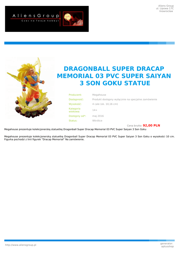 Aliens Group ul. Lipowa 17C Inowrocław DRAGONBALL SUPER DRACAP MEMORIAL 03 PVC SUPER SAIYAN 3 SON GOKU STATUE Producent: Megahouse Dostępność: Produkt dostępny wyłącznie na specjalne zamówienie Wysokość: 4 cale (ok. 10,16 cm) Kategoria wiekowa: 14+ Dostępny od*: maj 2016 Status: Wkrótce Cena brutto: 92,00 PLN Megahouse prezentuje kolekcjonerską statuetkę Dragonball Super Dracap Memorial 03 PVC Super Saiyan 3 Son Goku Megahouse prezentuje kolekcjonerską statuetkę Dragonball Super Dracap Memorial 03 PVC Super Saiyan 3 Son Goku o wysokości 10 cm. Figurka pochodzi z linii figurek "Dracap Memorial" Na zamówienie. http://www.aliensgroup.pl generator: aptusshop