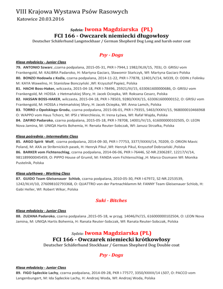 VIII Krajowa Wystawa Psów Rasowych Katowice 20.03.2016 Sędzia: Iwona Magdziarska (PL) FCI 166 - Owczarek niemiecki długowłosy Deutscher Schäferhund Langstockhaar / German Shepherd Dog Long and harsh outer coat Psy - Dogs Klasa młodzieży - Junior Class 79. ANTONIO Szwarc ,czarna podpalana, 2015-05-31, PKR I-7944,1 1982/XLIX/15, 703J, O: GRISU vom Frankengold, M: KALIBRA Padaroko, H: Martyna Gaciarz, Sławomir Stańczyk, Wł: Martyna Gaciarz Polska 80. BONZO Hodowla z Koźla, czarna podpalana, 2014-11-22, PKR I-77878, 12401/V/14, M339, O: ODIN z Folinku M: KAYA Wawelno, H: Stanisław Bonczyński ,Wł: Krzysztof Papież, Polska 81. HACHI Boss-Haker, wilczasta, 2015-04-18, PKR I-78496, 25921/III/15, 633061600000686, O: GRISU vom Frankengold, M: HOSSA z Hetmańskiej Sfory, H: Jacek Ociepka, Wł: Roksana Cesarz, Polska 82. HASSAN BOSS-HAKER, wilczasta, 2015-04-18, PKR I-78503, 9280/XXIX/15, 633061600000152, O: GRISU vom Frankengold, M: HOSSA z Hetmańskiej Sfory, H: Jacek Ociepka, Wł: Anna Lamch, Polska 83. TORRO z Opolskiego Grodu, czarna podpalana, 2015-06-01, PKR I-79355, 5463/XXXIV/15, 968000010466968 O: WAPPO vom Haus Tchorz, M: IPSI z Wierchlesia, H: Irena Łyżwa, Wł: Rafał Wajda, Polska 84. ZAFIRO Padaroko, czarna podpalana, 2015-05-18, PKR I-78708, 14001/IV/15, 616000000102505, O: LEON Nova Jamina, M: UNIQA Hartis Bohemia, H: Renata Reuter-Sobczak, Wł: Janusz Strzałka, Polska Klasa pośrednia - Intermediate Class 85. ARGO Spirit Wolf, czarna podpalana, 2014-09-30, PKR I-77753, 3377/XXXIII/14, 70209, O: ORION Mavic Poland, M: AXA ze Stribrnickich pasek, H: Henryk Pikul ,Wł: Henryk Pikul, Krzysztof Dobrzański ,Polska 86. BARKER vom Fichtenschlag, czarna podpalana, 2014-06-06, PKR I-76446, SZ-NR.2306287, 12217/V/14, 981189900045459, O: PIPPO House of Grumil, M: FANDA vom Fichtenschlag ,H: Marco Ossmann Wł: Monika Pustelnik, Polska Klasa użytkowa - Working Class 87. GUIDO Team Gleisenauer Schlob, czarna podpalana, 2010-05-30, PKR I-67972, SZ-NR.2253539, 1242/XLVI/10, 276098102793368, O: QUATTRO von der Partnachklamm M: FANNY Team Gleisenauer Schlob, H: Gabi Heller, Wł: Robert Wikar, Polska Suki - Bitches Klasa młodzieży - Junior Class 88. ZUZANA Padaroko, czarna podpalana ,2015-05-18, w przyg. 14046/IV/15, 616000000102504, O: LEON Nova Jamina, M: UNIQA Hartis Bohemia, H: Ranata Reuter-Sobczak, Wł: Ranata Reuter-Sobczak, Polska Sędzia: Iwona Magdziarska (PL) FCI 166 - Owczarek niemiecki krótkowłosy Deutscher Schäferhund Stockhaar / German Shepherd Dog Double coat Psy - Dogs Klasa młodzieży - Junior Class 89. FIGO Sądeckie Lachy, czarna podpalana, 2014-09-28, PKR I-77577, 3350/XXXIII/14 L507, O: PACCO vom Langenbungert, M: Ida Sądeckie Lachy, H: Andrzej Woda, Wł: Andrzej Woda, Polska Klasa pośrednia - Intermediate Class 90. MESSI Box-Dogs, czarna podpalana, 2014-06-30, PKR I-75959, 3297/XXXIII/14, Q676, O: MAFFEY vom Quartier Latin, M: GINA Ontopus, H: Adam Skwarczek, Wł: Marek Gołyżniak, Polska Suki - Bitches Klasa młodzieży - Junior Class 91. ALICE vom Haus Tchorz, czarna podpalana, 2015-05-06, w przyg. 31373/II/15, 968000010407086, O: HUNTER vom Haus Tchorz, M: HEXI vom Bad Waldle, H: Mirosław Tchórz, Wł: Dorota Niemiec, Polska 92. HIRA Box-Dogs, czarna podpalana, 2015-01-03, PKR I-77574, 8946/XIV/15, 616093400045615, O: HUGH vom Eichenplatz, M: GINA Ontopus, H: Adam Skwarczek, Wł: Mariusz Książek, Polska 93. HIPSI Box-Dogs, czarna podpalana ,2015-01-03, PKR I-77987, 1608/XLVI/15, 616093400045613, O: HUGH v. Eichenplatz M: GINA Ontopus H: Adam Skwarczek Wł: Adam Skwarczek ,Polska 94. Team Carrubba, czarna podpalana, 2015-03-29, ROI 15/77484, 9185/XIV/15, 360260002462740, O: FRED vom Rumbachtal, M: DUNYA Team Carrubba, H: Mariusz Książek, Wł: Mariusz Książek , Polska Klasa pośrednia - Intermediate Class 95. Al-grom YANKA, czarna podpalana, 2014-10-02, PKR I-78756, 93180/I/14, A704, O: ILIANO vom Fichtenschlag M: Al-grom YOKO, H: Marzena I Mirosław Zawiślak, Wł: Marzena I Mirosław Zawiślak, Michał Kaczor , Polska 96. DARA Śmiłowickie Wilki, czarna podpalana, 2014-07-23, PKR I-75975, 13833/IV/14, 616093900103498, O: HIRO Śmiłowickie Wilki, M: SMARTIE vom Zellwaldrand, H: Renata Horzela, Wł: Sebastian Paprocki, Polska 97. DOLI ze Skalnego Wzgórza, czarna podpalana, 2014-11-19, PKR I-77713, 7083/XXIII/14, 900164000612176, O: VADIM von Aurelius, M: XILA ze Skalnego Wzgórza, H: Gertruda Jureczko ,Wł: Abrahamyan Gevorg , Polska Klasa otwarta - Open Class 98. IBERIA von Gran Peregrino, czarna, 2014-01-26, PKR I-74221, 31172/II/14, 967000009260207, O: ZIDAN of Flokish Fest, M: RYTSUKA de Peregrino H: Alexander Moscoa Zeledon Wł: Alexander Moscoa Zeledon, Wojciech Gąsiorek, Polska