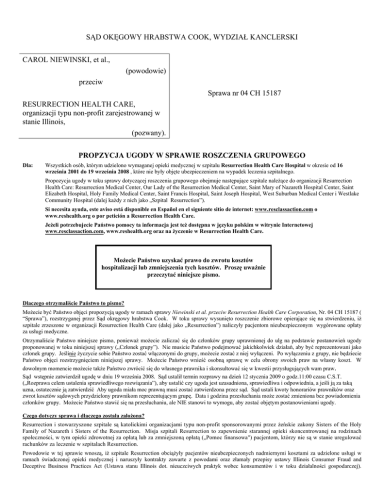 SĄD OKĘGOWY HRABSTWA COOK, WYDZIAŁ KANCLERSKI CAROL NIEWINSKI, et al., (powodowie) przeciw Sprawa nr 04 CH 15187 RESURRECTION HEALTH CARE, organizacji typu non-profit zarejestrowanej w stanie Illinois, (pozwany). PROPZYCJA UGODY W SPRAWIE ROSZCZENIA GRUPOWEGO Dla: Wszystkich osób, którym udzielono wymaganej opieki medycznej w szpitalu Resurrection Health Care Hospital w okresie od 16 września 2001 do 19 września 2008 , które nie były objęte ubezpieczeniem na wypadek leczenia szpitalnego. Propozycja ugody w toku sprawy dotyczącej roszczenia grupowego obejmuje następujące szpitale należące do organizacji Resurrection Health Care: Resurrection Medical Center, Our Lady of the Resurrection Medical Center, Saint Mary of Nazareth Hospital Center, Saint Elizabeth Hospital, Holy Family Medical Center, Saint Francis Hospital, Saint Joseph Hospital, West Suburban Medical Center i Westlake Community Hospital (dalej każdy z nich jako „Szpital Resurrection”). Si necesita ayuda, este aviso está disponible en Español en el siguiente sitio de internet: www.resclassaction.com o www.reshealth.org o por petición a Resurrection Health Care. Jeżeli potrzebujecie Państwo pomocy ta informacja jest też dostępna w języku polskim w witrynie Internetowej www.resclassaction.com, www.reshealth.org oraz na życzenie w Resurrection Health Care. Możecie Państwo uzyskać prawo do zwrotu kosztów hospitalizacji lub zmniejszenia tych kosztów. Proszę uważnie przeczytać niniejsze pismo. Dlaczego otrzymaliście Państwo to pismo? Możecie być Państwo objęci propozycją ugody w ramach sprawy Niewinski et al. przeciw Resurrection Health Care Corporation, Nr. 04 CH 15187 ( “Sprawa”), rozstrzyganej przez Sąd okręgowy hrabstwa Cook. W toku sprawy wysunięto roszczenie zbiorowe opierające się na stwierdzeniu, iż szpitale zrzeszone w organizacji Resurrection Health Care (dalej jako „Resurrection”) naliczyły pacjentom nieubezpieczonym wygórowane opłaty za usługi medyczne. Otrzymaliście Państwo niniejsze pismo, ponieważ możecie zaliczać się do członków grupy uprawnionej do ulg na podstawie postanowień ugody proponowanej w toku niniejszej sprawy („Członek grupy”). Nie musicie Państwo podejmować jakichkolwiek działań, aby być reprezentowani jako członek grupy. Jeślinie życzycie sobie Państwo zostać włączonymi do grupy, możecie zostać z niej wyłączeni. Po wyłączeniu z grupy, nie będziecie Państwo objęci rozstrzygnięciem niniejszej sprawy. Możecie Państwo wnieść osobną sprawę w celu obrony swoich praw na własny koszt. W dowolnym momencie możecie także Państwo zwrócić się do własnego prawnika i skonsultować się w kwestii przysługujących wam praw. Sąd wstępnie zatwierdził ugodę w dniu 19 września 2008. Sąd ustalił termin rozprawy na dzień 12 stycznia 2009 o godz.11:00 czasu C.S.T. („Rozprawa celem ustalenia sprawiedliwego rozwiązania”), aby ustalić czy ugoda jest uzasadniona, sprawiedliwa i odpowiednia, a jeśli ją za taką uzna, ostatecznie ją zatwierdzić Aby ugoda miała moc prawną musi zostać zatwierdzona przez sąd. Sąd ustali kwoty honorariów prawników oraz zwrot kosztów sądowych przydzielony prawnikom reprezentującym grupę. Data i godzina przesłuchania może zostać zmieniona bez powiadomienia członków grupy. Możecie Państwo stawić się na przesłuchaniu, ale NIE stanowi to wymogu, aby zostać objętym postanowieniami ugody. Czego dotyczy sprawa i dlaczego została założona? Resurrection i stowarzyszone szpitale są katolickimi organizacjami typu non-profit sponsorowanymi przez żeńskie zakony Sisters of the Holy Family of Nazareth i Sisters of the Resurrection. Misja szpitali Resurrection to zapewnienie starannej opieki skoncentrowanej na rodzinach społeczności, w tym opieki zdrowotnej za opłatą lub za zmniejszoną opłatą („Pomoc finansowa") pacjentom, którzy nie są w stanie uregulować rachunków za leczenie w szpitalach Resurrection. Powodowie w tej sprawie wnoszą, iż szpitale Resurrection obciążyły pacjentów nieubezpieczonych nadmiernymi kosztami za udzielone usługi w ramach świadczonej opieki medycznej i naruszyły kontrakty zawarte z powodami oraz złamały przepisy ustawy Illinois Consumer Fraud and Deceptive Business Practices Act (Ustawa stanu Illinois dot. nieuczciwych praktyk wobec konsumentów i w toku działalności gospodarczej). Organizacja Resurrection zaprzeczyła i nadal zdecydowanie zaprzecza, iż wystąpiły jakiekolwiek wykroczenia, błędy, odpowiedzialność i szkody jakiegokolwiek rodzaju dotyczące powodów i grupy. Organizacja Resurrection zaprzecza także jakimkolwiek bezprawnym lub niepoprawnym działaniom oraz temu, iż szpitale Resurrection nie udzieliły wymaganego wsparcia finansowego. Organizacja Resurrection zgodziła się na objęcie ugodą jedynie w celu umorzenia roszczeń i uniknięcia wydatków i niedogodności związanych ze sporem sądowym. Rada grupy oraz organizacja osiągnęły ugodę po negocjacjach trwających kilka miesięcy. Po analizie faktów, przepisów prawa, zagrożeń i korzyści dla grupy, Rada grupy ustaliła, że niniejsza ugoda leży w najlepszym interesie grupy. Dzięki niej w toku niniejszego skomplikowanego postępowania nie wystąpią kwestie niejasne i opóźnienia, a grupa uzyska zwrot znacznych kwot. Członkowie grupy uprawnieni do ulgi w ramach niniejszej ugody nie będą obciążeni jakimikolwiek ryzykiem lub kosztami. Jakie korzyści mogą Państwo odnieść w wyniku ugody? Ugoda może przynieść Państwu trzy podstawowe korzyści: (1) Możecie zostać Państwo uprawnieni do wsparcia finansowego ze strony szpitali Resurrection w celu regulowania przyszłych kosztów usług szpitalnych niezbędnych z medycznego punktu widzenia; (2) Możecie zostać Państwo uprawnieni do ponownej kalkulacji nieuregulowanych rachunków za usługi szpitalne niezbędne z medycznego punktu widzenia wystawionych przez szpital Resur