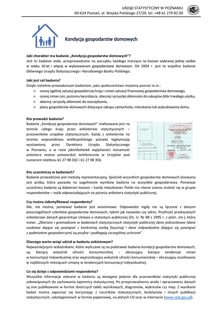 URZĄD STATYSTYCZNY W POZNANIU 60-624 Poznań, ul. Wojska Polskiego 27/29, tel. +48 61 279 82 00 Kondycja gospodarstw domowych Jaki charakter ma badanie „Kondycja gospodarstw domowych”? Jest to badanie stałe, przeprowadzane na początku każdego miesiąca na losowo wybranej jednej osobie w wieku 16 lat i więcej w wylosowanym gospodarstwie domowym. Od 2004 r. jest to wspólne badanie Głównego Urzędu Statystycznego i Narodowego Banku Polskiego. Jaki jest cel badania? Dzięki rzetelnie prowadzonym badaniom, jako społeczeństwo możemy poznać m.in.: • ocenę ogólnej sytuacji gospodarczej kraju i zmian sytuacji finansowej gospodarstwa domowego, • ocenę zmian cen, poziomu bezrobocia, obecnej i przyszłej skłonności do zakupów dóbr trwałego użytku, • obecną i przyszłą skłonność do oszczędzania, • plany gospodarstw domowych dotyczące zakupu samochodu, mieszkania lub wybudowania domu. Kto prowadzi badania? Badanie „Kondycja gospodarstw domowych” realizowane jest na terenie całego kraju przez ankieterów statystycznych – pracowników urzędów statystycznych. Każdy z ankieterów na terenie województwa wielkopolskiego posiada legitymację wystawioną przez Dyrektora Urzędu Statystycznego w Poznaniu, a w razie jakichkolwiek wątpliwości tożsamość ankietera można potwierdzić telefonicznie w Urzędzie pod numerem telefonu 61 27 98 302 i 61 27 98 356. Kto uczestniczy w badaniach? Badanie prowadzone jest metodą reprezentacyjną. Spośród wszystkich gospodarstw domowych losowana jest próba, która pozwala na uogólnienie wyników badania na wszystkie gospodarstwa. Ponieważ uczestnicy badania są dobierani losowo – każdy mieszkaniec Polski ma równe szanse znaleźć się w grupie respondentów – osób odpowiadających na pytania ankietera statystyki publicznej. Czy można zidentyfikować respondenta? Nie, nie można, ponieważ badanie jest anonimowe. Odpowiedzi nigdy nie są łączone z danymi poszczególnych członków gospodarstw domowych, takimi jak nazwisko czy adres. Poufność przekazanych ankieterowi danych gwarantuje Ustawa o statystyce publicznej (Dz. U. Nr 88 z 1995 r. z późn. zm.), która mówi: „Zbierane i gromadzone w badaniach statystycznych statystyki publicznej dane jednostkowe (dane osobowe dające się powiązać z konkretną osobą fizyczną) i dane indywidualne (dające się powiązać z podmiotem gospodarczym) są poufne i podlegają szczególnej ochronie”. Dlaczego warto wziąć udział w badaniu ankietowym? Najważniejszymi wskaźnikami, które wyliczane są na podstawie badania kondycji gospodarstw domowych, są: bieżący wskaźnik ufności konsumenckiej – obrazujący bieżące tendencje zmian w konsumpcji indywidualnej oraz wyprzedzający wskaźnik ufności konsumenckiej – obrazujący oczekiwane w najbliższych miesiącach zmiany w tendencjach konsumpcji indywidualnej. Co się dzieje z odpowiedziami respondenta? Wszystkie informacje zebrane w badaniu są dostępne jedynie dla pracowników statystyki publicznej zobowiązanych do zachowania tajemnicy statystycznej. Po przeprowadzeniu analiz i opracowaniu danych są one publikowane w formie zbiorczych tablic wynikowych, diagramów, wykresów czy map. Z wynikami badań można zapoznać się korzystając z roczników statystycznych, biuletynów i innych publikacji statystycznych, udostępnianych w formie papierowej, na płytach CD oraz w internecie (www.stat.gov.pl). URZĄD STATYSTYCZNY W POZNANIU 60-624 Poznań, ul. Wojska Polskiego 27/29, tel. +48 61 279 82 00 Czego dowiadujemy się z „Badania kondycji gospodarstw domowych: Bieżący wskaźnik ufności konsumenckiej Wyprzedzający wskaźnik ufności konsumenckiej Obydwa wskaźniki ufności konsumenckiej mogą przyjmować wartości od –100 do +100. Wartość dodatnia oznacza przewagę liczebną konsumentów nastawionych optymistycznie nad konsumentami nastawionymi pesymistycznie, natomiast wartość ujemna oznacza przewagę liczebną konsumentów nastawionych pesymistycznie nad konsumentami nastawionymi optymistycznie. Wyniki badań wykorzystywane są przez Narodowy Bank Polski przy tworzeniu „Raportu o inflacji” Więcej informacji o badaniach ankietowych na stronie http://stat.gov.pl/informacja-o-badaniach-ankietowych/ oraz http://poznan.stat.gov.pl/co-gdzie-jak-zalatwic/gdy-skontaktuje-sie-z-nami-ankieter/