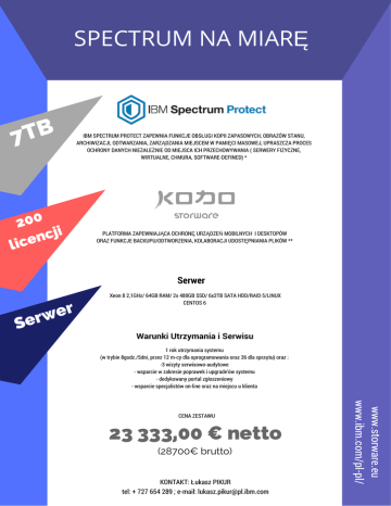 SPECTRUM NA MIARĘ B T 7 200 cji n e lic IBM SPECTRUM PROTECT ZAPEWNIA FUNKCJE OBSŁUGI KOPII ZAPASOWYCH, OBRAZÓW STANU, ARCHIWIZACJI, ODTWARZANIA, ZARZĄDZANIA MIEJSCEM W PAMIĘCI MASOWEJ, UPRASZCZA PROCES OCHRONY DANYCH NIEZALEŻNIE OD MIEJSCA ICH PRZECHOWYWANIA ( SERWERY FIZYCZNE, WIRTUALNE, CHMURA, SOFTWARE-DEFINED) * PLATFORMA ZAPEWNIAJĄCA OCHRONĘ URZĄDZEŃ MOBILNYCH I DESKTOPÓW ORAZ FUNKCJE BACKUPU/ODTWORZENIA, KOLABORACJI UDOSTĘPNIANIA PLIKÓW ** Serwer r e w Ser Xeon 8 2,1GHz/ 64GB RAM/ 2x 480GB SSD/ 6x2TB SATA HDD/RAID 5/LINUX CENTOS 6 Warunki Utrzymania i Serwisu 1 rok utrzymania systemu (w trybie 8godz./5dni, przez 12 m-cy dla oprogramowania oraz 36 dla sprzętu) oraz : -3 wizyty serwisowo-audytowe - wsparcie w zakresie poprawek i upgrade'ów systemu - dedykowany portal zgłoszeniowy - wsparcie specjalistów on-line oraz na miejscu u klienta 23 333,00 € netto (28700€ brutto) KONTAKT: Łukasz PIKUR tel: + 727 654 289 ; e-mail: [email protected] www.storware.eu www.ibm.com/pl-pl/ CENA ZESTAWU IBM Spectrum Protect (dawniej Tivoli Storage Manager) *Pojemnościowa licencja na 7TB IBM Spectrum Protect SUR, które pozwalają na nielimitowaną rozbudowę, zarówno w zakresie pojemności (licencji) ale także ilości serwerów, na których składowany i zarządzany jest backup. Wybrane funkcje: • obsługa kopii zapasowych, obrazów stanu, archiwizacji, odtwarzania, zarządzania miejscem w pamięci masowej, • mechanizmy odtwarzania maszyn oraz usuwania skutków awarii. • ochrona maszyn wirtualnych, serwerów plików, poczty, baz danych, systemów zarządzania zasobami • skalowalność typu enterprise IBM Spectrum Protect pozwala na backup szerokiej gamy środowisk: • systemy Windows, Linux (x86, x86_64, System Z, Power), AIX, MacOS, Solaris, HP-UX • środowiska mobilne - wtyczka KODO dla Android, iOS, Windows Phone • środowiska wirtualne (VMware, MS Hyper-V) • wtyczki vProtect dla otwartych hypervisor’ów (KVM, XEN, Citrix, Redhat) • serwery poczty: MS Exchange i Lotus Domino • bazy danych: DB2, ORACLE, MSSQL i MySQL • systemy planowania zasobami przedsiębiorstwa na bazie rozwiązań SAP • możliwość transferu danych z klienta backupu/archiwum bezpośrednio po sieci SAN Storware KODO **Licencja Storware KODO na 200 użytkowników pozwala na backup stacji roboczej oraz do 4 urządzeń mobilnych per użytkownik bez limitu danych. Platforma Storware KODO zapewnia ciągłą ochronę kluczowych danych przedsiębiorstw przechowywanych na komputerach stacjonarnych jak i laptopach oraz urządzeniach przenośnych typu tablet i smartfon. System pozwala również na współdzielenie danych lub migrowanie ich na inne urządzenia. Podstawowe funkcje Storware KODO • Obsługa wielu platform - (Windows, MacOS, iOS, Android, Windows Phone) • myKODO, czyli kontenery pozwalające na przechowywanie i szyfrowanie własnych plików na urządzeniach mobilnych • Migracja międzyplatformowa (dla urządzeń mobilnych) • Możliwość odtworzenia pojedynczego pliku dokumentu, obiektu z galerii, kontaktu czy zadań z kalendarza • Możliwość odtworzenia danych z konkretnego punktu w czasie • Przyrostowa kopia bezpieczeństwa • Wersjonowanie chronionych obiektów • Ochrona poczty elektronicznej (Outlook, Lotus Notes) • Usuwanie danych z zagubionego/skradzionego telefonu z pełnym odtworzeniem danych na nowym urządzeniu KONTAKT: Łukasz PIKUR tel: + 727 654 289 ; e-mail: [email protected] www.storware.eu www.ibm.com/pl-pl/ Opis Funkcjonalny Oprogramowania