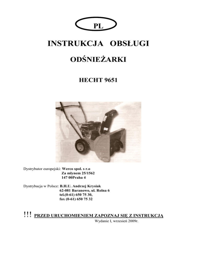 PL INSTRUKCJA OBSŁUGI ODŚNIEŻARKI HECHT 9651 Dystrybutor europejski: Werco spol. s r.o Za mlynem 25/1562 147 00Praha 4 Dystrybucja w Polsce: B.H.U. Andrzej Krysiak 62-081 Baranowo, ul. Rolna 6 tel.(0-61) 650 75 30, fax (0-61) 650 75 32 !!! PRZED URUCHOMIENIEM ZAPOZNAJ SIĘ Z INSTRUKCJĄ Wydanie I, wrzesień 2009r. 2 SPIS TREŚCI 1. INSTRUKCJA OBSŁUGI 3 2. INSTRUKCJA OBSŁUGI ODŚNIEŻARKI 3 3. OGÓLNE WSKAZÓWKI DOTYCZĄCE BEZPIECZEŃSTWA 4 4. PRZYGOTOWANIE DO ODŚNIEŻANIA 4 5. PRZED URUCHOMIENIEM SILNIKA 5 6. UŻYTKOWANIE ODŚNIEŻARKI 5 7.MONTAŻ 6 8. PRZYGOTOWANIE PALIWA 7 9. URUCHAMIANIE SILNIKA 7 10. STEROWANIE 7 11. REGULACJA KIERUNKU WYRZUTU ŚNIEGU 7 13. REGULACJA POŁOŻENIA KANAŁU WYRZUTOWEGO 7 14. SPRAWDZANIE POPRAWNOŚCI DOPŁYWU PALIWA 8 15. KONSERWACJA I PRZECHOWYWANIE ODŚNIEŻACZA 8 16. DANE TECHNICZNE 8 3 1. INSTRUKCJA OBSŁUGI Tekst oznaczony symbolem podaje szczególne środki ostrożności, które muszą być przestrzegane przez użytkownika, aby uniknąć szkód w odśnieżaczu. Tekst oznaczony symbolem podaje szczególne środki ostrożności, których koniecznie należy przestrzegać, aby uniknąć obrażeń osób obsługujących odśnieżarkę lub znajdujących się w jej pobliżu. Ogólny symbol niebezpieczeństwa. Ostrzega przed obrażeniami, które mogą być wywołane wyrzucanymi przedmiotami, np.: przecięcie, zmiażdżenie, zapalenie i inne. Ten symbol zwraca uwagę na niebezpieczeństwo obrażeń spowodowanych wirującym elementem zbierającym. Ten symbol wskazuje, że osoby które nie zapoznały się z instrukcją obsługi odśnieżarki nie mogą w żadnym przypadku jej uruchamiać. -DZIECIOM NIE WOLNO URUCHAMIAĆ URZĄDZENIA -PRZED SPRAWDZENIEM, CZYSZCZENIEM, NAPRAWĄ URZĄDZENIA ODŁĄCZYĆ PRZEWÓD ŚWIECY ZAPŁONOWEJ -PO WYŁĄCZENIU URZĄDZENIA WIRNIK OBRACA SIĘ DO CAŁKOWITEGO ZATRZYMANIA Nalepki utrzymywać w czystości i w przypadku odklejenia się lub uszkodzenia należy nalepić nową, którą można nabyć u dystrybutora. 2. INSTRUKCJA OBSŁUGI ODŚNIEŻARKI Niniejszą instrukcję należy dokładnie przeczytać przed montażem i uruchomieniem odśnieżarki. Należy ściśle przestrzegać objaśnień i wskazówek. Szczególnie zwrócić uwagę na wskazówki dotyczące bezpieczeństwa. Do obsługi, konserwacji odśnieżarki upoważnione są tylko osoby, które zapoznały się z instrukcją obsługi. Producent poddał odśnieżarkę dokładnej kontroli jakości. Jednak urządzenie należy sprawdzić ze względu na ewentualne uszkodzenia transportowe i w przypadku ich stwierdzenia reklamować u sprzedającego. Producent zastrzega sobie prawo do zmian konstrukcyjnych. 4 Identyfikacja odśnieżarki: Na korpusie znajduje się tabliczka znamionowa z danymi identyfikacyjnymi odśnieżarki. Przy zamawianiu części, reklamacjach i innych kontaktach z dystrybutorem należy podawać typ (model), nr fabryczny oraz datę produkcji odśnieżarki. W tym miejscu, dla ułatwienia prosimy wpisać dane swojego odśnieżarki: Typ (model)..............................................nr serii....................................data produkcji........... 3. OGÓLNE WSKAZÓWKI DOTYCZĄCE BEZPIECZEŃSTWA Odśnieżarka przeznaczony jest do usuwania śniegu z chodników, placów i parkingów. Użycie niezgodne z tym przeznaczeniem jest uważane za postępowanie niezgodne z instrukcją obsługi. Przed użyciem odśnieżarki po raz pierwszy, należy dokładnie przeczytać, a później przestrzegać zaleceń instrukcji, dotyczących bezpieczeństwa, obsługi i konserwacji. Przed rozpoczęciem pracy obsługujący musi zaznajomić się ze wszystkimi mechanizmami odśnieżarki i ich funkcjami. Należy upewnić się, czy wszystkie mechanizmy zamontowane są w sposób pewny i czy są sprawne. Dzieciom i młodzieży do lat 16 nie wolno obsługiwać odśnieżarki. Nie wolno używać odśnieżarki, jeżeli w pobliżu znajdują się osoby postronne (zwłaszcza dzieci) i zwierzęta. Należy pamiętać, że obsługujący jest odpowiedzialny za ewentualne szkody wyrządzone osobom trzecim. W czasie pracy należy ciągle kontrolować otoczenie i zwracać uwagę na wystarczającą widoczność. Przed pozostawieniem odśnieżarki należy upewnić się czy silnik jest wyłączony. Używanie części zamiennych innych niż oryginalne może spowodować zwolnienie producenta od odpowiedzialności gwarancyjnej za uszkodzenie. W czasie czasu pracy należy stosować ochronniki słuchu oraz ograniczyć czas pracy ciągłej do 2 godzin ze względu na podwyższony poziom drgań. 4. PRZYGOTOWANIE DO ODŚNIEŻANIA 1.Przed rozpoczęciem odśnieżania oczyść przyszłe miejsce pracy z kamieni, kawałków drewna, metali i innych obcych przedmiotów. 2.Bezpośrednio przed użyciem należy sprawdzić, czy wszystkie nakrętki i inne elementy są dobrze dokręcone, nieuszkodzone i nie zużyte. 3.Zużyte, zniszczone śruby, nakrętki muszą być wymienione na nowe. Należy stosować tylko oryginalne części. 4.Należy przestrzegać przepisów bezpieczeństwa związanych z paliwem napędowym. Nieprzestrzeganie środków ostrożności grozi pożarem, obrażeniami, zatruciem lub wybuchem. 5.Sprawdzaj poziom paliwa przed uruchomieniem silnika. 6.Paliwo dolewać do zbiornika przed uruchomieniem odśnieżarki. 7.Paliwo w zbiorniku najlepiej uzupełniać na świeżym powietrzu lub w dobrze wentylowanym pomieszczeniu. 8.Aby uniknąć pożaru lub eksplozji dokładnie zakręcaj korek baku oraz wycieraj rozlane paliwo. 9.Nie podejmuj pracy bez odpowiedniej zimowej odzieży. Używaj obuwia, które zapewnia dobrą przyczepność na śliskich podłożach. 5 10. Przechowywanie urządzenia oraz uzupełnianie paliwa z dala od źródeł ognia lub wysokiej temperatury. 5. PRZED URUCHOMIENIEM SILNIKA 1.Należy zapoznać się z instrukcją odśnieżarki. Nie stosowanie się do wskazówek producenta może doprowadzić do utraty gwarancji. 2.Przed uruchomieniem silnika należy sprawdzić czy w pobliżu nie ma osób trzecich.