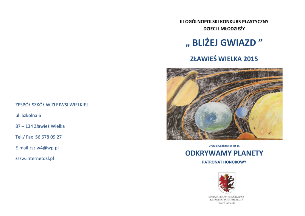 III OGÓLNOPOLSKI KONKURS PLASTYCZNY DZIECI I MŁODZIEŻY „ BLIŻEJ GWIAZD ” ZŁAWIEŚ WIELKA 2015 ZESPÓŁ SZKÓŁ W ZŁEJWSI WIELKIEJ ul. Szkolna 6 87 – 134 Zławieś Wielka Tel./ Fax 56 678 09 27 E-mail [email protected] zszw.internetdsl.pl Urszula Godkowska lat 15 ODKRYWAMY PLANETY PATRONAT HONOROWY REGULAMIN III OGÓLNOPLSKI KONKURS PLASTYCZNY DZIECI I MŁODZIEŻY „ BLIŻEJ GWIAZD” ZŁAWIEŚ WIELKA 2015 TEMAT: „ODKRYWAMY PLANETY” Planeta – dosł. „wędrowiec”, obiekt astronomiczny okrążający gwiazdę. W Układzie Słonecznym znanych jest 8 planet (Merkury, Wenus, Ziemia, Mars, Jowisz, Saturn, Uran i Neptun. Potwierdzono również istnienie ponad 1000 planet poza słonecznych okrążających gwiazdy inne niż Słooce. ORGANIZATOR TECHNIKA Zespół Szkół w Złejwsi Wielkiej Prace mogą byd wykonane w dowolnej technice malarskiej. Konkurs objęty Honorowym Patronatem FORMAT Marszałka Województwa Kujawsko-Pomorskiego Piotra Całbeckiego Maksymalny do 70 x 100 cm UCZESTNICY CELE KONKURSU - zainteresowanie dzieci i młodzieży astronomią, osiągnięciami naukowymi w tej dziedzinie, badaniemkosmosu, zwłaszcza badaniem planet poza słonecznych. Do udziału w konkursie zapraszamy dzieci i młodzież ze szkół oraz placówek kulturalnych z terenu Polski w wieku od 7 do 19 lat. Prace będą oceniane w następujących kategoriach 7 -10 lat, 11- 13 lat, 14 -16 lat, 17 19 lat. -rozwijanie wrażliwości oraz wyobraźni uczestników konkursu poprzez obcowanie z pięknem nocnego nieba TERMINY - popularyzacja astronomii poprzez sztukę Termin nadsyłania prac do 30 maja 2015 r.(nie liczy się data stempla pocztowego, ale termin dostarczenia prac!) - zaprezentowanie podczas wystawy pokonkursowej najciekawszych prac plastycznych, wymiana doświadczeo wśród nauczycieli i instruktorów plastyki Uroczyste podsumowanie konkursu, wręczenie nagród oraz otwarcie wystawy odbędzie się w dniu 13 czerwca 2015 r. podczas ASTROFESTIWALU w Kruszwicy. OCENA PRAC Jury powołane przez organizatora przyzna 3 nagrodyi 2 wyróżnienia w każdej kategorii wiekowej. Jury ma prawo do innego przydziału nagród i wyróżnieo. Decyzje jury są ostateczne. O wynikach konkursu zostaną powiadomione tylko te placówki, z których będą nagrodzeni laureaci. Prace Każdy uczestnik może złożyd tylko jedną pracę. Prace zbiorowe nie będą oceniane. Prace powinny byd zapakowane i zabezpieczone!!! Prac nie oprawiamy i nie rolujemy!!! Organizator nie ponosi odpowiedzialności za zniszczenie prac podczas transportu. POSTANOWIENIA KOOCOWE WSZYSTKIE PRACE PRZECHODZĄ NA WŁASNOŚĆ ZESPOŁU SZKÓŁ W ZŁEJWSI WIELKIEJ I NIE PODLEGAJĄ ZWROTOWI. Organizator zastrzega sobie prawo do bezpłatnej reprodukcji i wykorzystania zdjęd prac nagrodzonych. Zespół Szkół w Złejwsi Wielkiej oświadcza, że wszystkie dane osobowe będą wykorzystane jedynie w celach informacyjnych dotyczących konkursu. Jednocześnie uczestniczący w jakikolwiek sposób w konkursie, (jako autor prac lub opiekun) zgadzają się na przetwarzanie danych osobowych w celach informacyjnych dotyczących konkursu. Informacji i wyjaśnieo udziela opiekun konkursu Alicja Żelazek e-mail: [email protected] Więcej również na stronie internetowej Zespołu Szkół w Złejwsi Wielkiej zszw.internetdsl.pl . Opis pracy Na odwrocie pracy należy umieścid drukowanymi literami: Imię i nazwisko Wiek ( nie klasa) Adres szkoły lub pracowni plastycznej, telefon, fax. Imię i nazwisko nauczyciela / instruktora. Serdecznie zapraszamy do udziału w konkursie. Dyrektor ZS w Złejwsi WielkiejKoordynator projektu ASTROBAZA Robert SwiontekBrzezinski Wiesław Skórzyoski