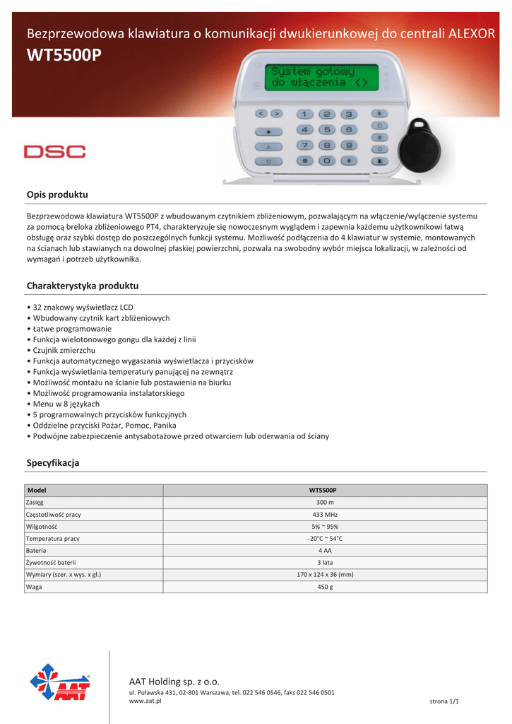 Bezprzewodowa Bezprzewodowa klawiatura klawiatura oo komunikacji komunikacji dwukierunkowej dwukierunkowej do do centrali centrali ALEXOR ALEXOR PC9 PC WT5500P WT5500P Opis produktu Bezprzewodowa klawiatura WT5500P z wbudowanym czytnikiem zbliżeniowym, pozwalającym na włączenie/wyłączenie systemu za pomocą breloka zbliżeniowego PT4, charakteryzuje się nowoczesnym wyglądem i zapewnia każdemu użytkownikowi łatwą obsługę oraz szybki dostęp do poszczególnych funkcji systemu. Możliwość podłączenia do 4 klawiatur w systemie, montowanych na ścianach lub stawianych na dowolnej płaskiej powierzchni, pozwala na swobodny wybór miejsca lokalizacji, w zależności od wymagań i potrzeb użytkownika. Charakterystyka produktu • 32 znakowy wyświetlacz LCD • Wbudowany czytnik kart zbliżeniowych • Łatwe programowanie • Funkcja wielotonowego gongu dla każdej z linii • Czujnik zmierzchu • Funkcja automatycznego wygaszania wyświetlacza i przycisków • Funkcja wyświetlania temperatury panującej na zewnątrz • Możliwość montażu na ścianie lub postawienia na biurku • Możliwość programowania instalatorskiego • Menu w 8 językach • 5 programowalnych przycisków funkcyjnych • Oddzielne przyciski Pożar, Pomoc, Panika • Podwójne zabezpieczenie antysabotażowe przed otwarciem lub oderwania od ściany Specyfikacja Model WT5500P Zasięg 300 m Częstotliwość pracy 433 MHz Wilgotność 5% ~ 95% Temperatura pracy -20°C ~ 54°C Bateria 4 AA Żywotność baterii 3 lata Wymiary (szer. x wys. x gł.) 170 x 124 x 36 (mm) Waga 450 g AAT Holding sp. z o.o. ul. Puławska 431, 02-801 Warszawa, tel. 022 546 0546, faks 022 546 0501 www.aat.pl strona 1/1