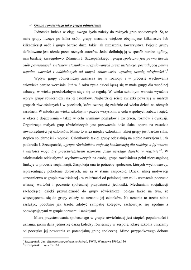 • Grupa rówieśnicza jako grupa odniesienia Jednostka ludzka w ciągu swego życia należy do różnych grup społecznych. Są to małe grupy liczące po kilka osób, grupy znacznie większe obejmujące kilkanaście lub kilkadziesiąt osób i grupy bardzo duże, takie jak zrzeszenia, towarzystwa. Pojęcie grupy definiowane jest różnie przez różnych autorów. Jedni definiują ją w sposób bardzo ogólny, inni bardziej szczegółowo. Zdaniem J. Szczepańskiego „grupa społeczna jest pewną ilością osób powiązanych systemem stosunków uregulowanych przez instytucję, posiadającą pewne wspólne wartości i oddzielonych od innych zbiorowości wyraźną zasadą odrębności”.1 Wpływ grupy rówieśniczej zaznacza się w rozwoju i w procesie wychowania człowieka bardzo wcześnie. Już w 3 roku życia dzieci łączą się w małe grupy dla wspólnej zabawy, w wieku przedszkolnym staje się to regułą. W wieku szkolnym wzrasta wyraźnie wpływ grupy rówieśniczej na jej członków. Najbardziej ścisłe związki powstają w małych grupach rówieśniczych i w paczkach, które tworzą się zależnie od wieku dzieci na różnych zasadach. W młodszym wieku szkolnym - przede wszystkim w celu wspólnych zabaw i zajęć, w okresie dojrzewania - także w celu wymiany poglądów i zwierzeń, rozmów i dyskusji. Organizacja małych grup rówieśniczych jest przeważnie dość słaba, oparta na zasadzie równorzędności jej członków. Mimo to więź między członkami takiej grupy jest bardzo silna, stopień solidarności - wysoki. Członkowie takiej grupy oddziałują na siebie nawzajem i, jak podkreśla J. Szczepański, „grupa rówieśników staje się konkurencją dla rodziny, a jej wzorce i wartości mogą być przeciwieństwem wzorców, jakie uzyskuje dziecko w rodzinie”2. W całokształcie oddziaływań wychowawczych na osobę, grupa rówieśnicza pełni niezastąpioną funkcję w procesie socjalizacji. Zaspokaja ona te potrzeby społeczne, których wychowawcy, reprezentujący pokolenie dorosłych, nie są w stanie zaspokoić. Dzięki silnej motywacji uczestnictwo w grupie rówieśniczej - w zależności od pełnionej tam roli - wzmacnia poczucie własnej wartości i poczucie społecznej przydatności jednostki. Mechanizm socjalizacji zachodzącej dzięki przynależność do grupy rówieśniczej polega także na tym, że włączającemu się do grupy zależy na uznaniu jej członków. Na uznanie to trzeba sobie zasłużyć, podobnie jak trzeba zdobyć sympatię kolegów, zachowując się zgodnie z obowiązującymi w grupie normami i sankcjami. Miarą przystosowania społecznego w grupie rówieśniczej jest stopień popularności i uznania, jakim daną jednostkę darzą koledzy rówieśnicy w zespole. Klasę szkolną uważamy od początku jej powstania za potencjalną grupę społeczną. Mimo przypadkowego doboru 1 2 Szczepański Jan: Elementarne pojęcia socjologii, PWN, Warszawa 1966,s.136 Szczepański J.:op.cit s.161 uczniów klasa nie przypomina w niczym tłumu czy innego luźnego zbiorowiska osób: składa się z dzieci w tym samym wieku, znajdujących się na podobnym poziomie rozwoju fizycznego i psychicznego i zebranych do realizacji tego samego celu, co umożliwia szybką integrację izolowanych od siebie początkowo jednostek w coraz bardziej zwartą grupę o wspólnych upodobaniach, zainteresowaniach i rodzajach aktywności. Wewnętrzna struktura tej grupy kształtuje się stopniowo, gdyż powiązania społeczne między uczniami, pozycje i ranga poszczególnych członków grupy, jak również przepisy i normy współżycia rozwijają się w ciągu dłuższego czasu. Przy charakterystyce klasy szkolnej można oprócz ogólnego pojęcia grupy społecznej zastosować podział na grupy formalne i nieformalne. Granice między tymi grupami są płynne, lecz zasadniczy kierunek rozwoju społecznej kultury klasy szkolnej polega na tym, że stopniowo następuje rozbudowa związków nieformalnych w obrębie grupy formalnej, jaką początkowo stanowi klasa. Korzystna z wychowawczego punktu widzenia jest taka sytuacja, w której zespoły uczniów tworzą się na zasadzie dobrowolnej przynależności ich członków, ale równocześnie organizują się dla wspólnej nauki i pracy. Stosunki społeczne można określić jako unormowane określonymi rolami i wzorcami społecznymi wzajemne postawy osobników, wytworzone w wyniku świadomego, bezpośredniego, trwalszego oddziaływania na siebie. Układ stosunków i zależności między uczniami w klasie związany jest także z rolami społecznymi dzieci, ich pozycją, popularnością, rangą w hierarchii społecznej uczniów. Układ ten można charakteryzować ponadto w wymiarach takich relacji międzyosobowych, jak dominowanie i podporządkowanie, rywalizacja i współpraca, akceptacja i odrzucanie, itp. Stosunki te i wiążące się z nimi pozycje uczniów w klasie są niezmiernie złożone. Szczególnie przydatna do określenia pozycji ucznia w klasie jest opracowana przez Marka Pilkiewicza Socjometryczna Skala Akceptacji3, która pozwala na przypisanie każdemu uczniowi w zespole określonej pozycji osoby: akceptowanej, akceptowanej przeciętnie, polaryzującej akceptację, izolowanej, odrzuconej. Uczniowie należący do dwóch pierwszych grup wywołują u swoich kolegów postawę pozytywną, co sprzyja ich identyfikacji z grupą i czynnemu włączaniu się w życie klasy. Uczniowie z grupy trzeciej znajdują się w pozycji konfliktowej i cieszą się sympatią części kolegów, pozostali jednak ustosunkowują się do nich negatywnie. Uczniów izolowanych koledzy traktują obojętnie, odrzucani zaś - to ci, którzy budzą postawę negatywną w otoczeniu, co utrudnia zdecydowanie proces ich socjalizacji i współdziałanie z kolegami. Dziecko popularne samo inicjuje wiele kontaktów 3 Pilkiewicz Marek:Techniki socjometryczne.Wprowadzenie do badań, w (red) Wołoszynowa L: Materiały do nauczania psychologii,Seria III,t.2 Metody