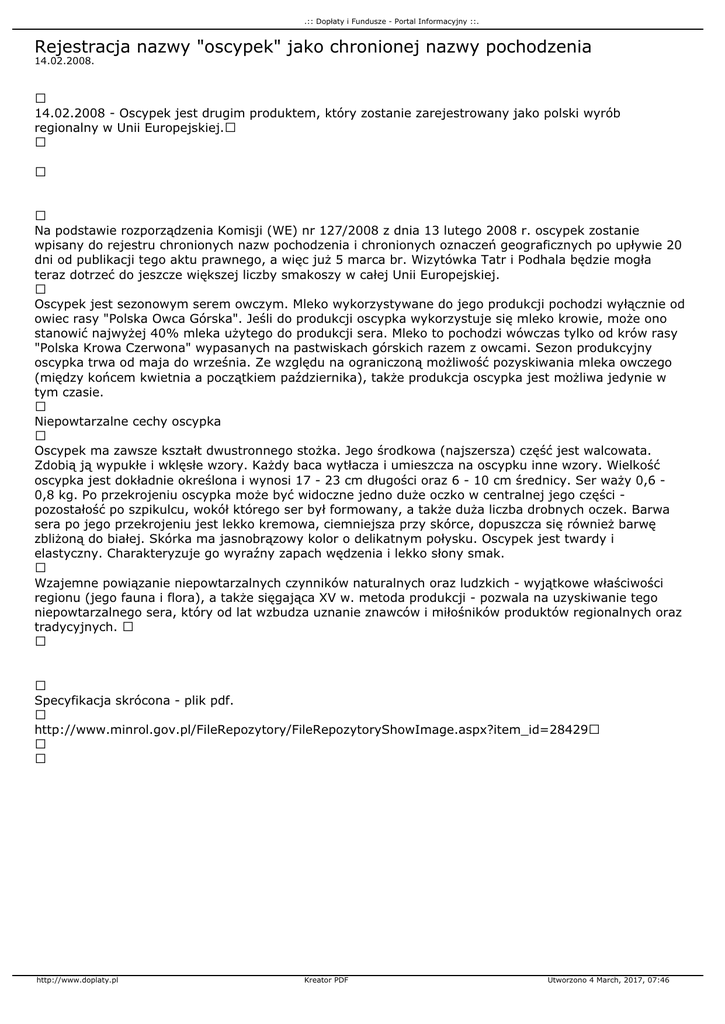 .:: Dopłaty i Fundusze - Portal Informacyjny ::. Rejestracja nazwy "oscypek" jako chronionej nazwy pochodzenia 14.02.2008. 14.02.2008 - Oscypek jest drugim produktem, który zostanie zarejestrowany jako polski wyrób regionalny w Unii Europejskiej. Na podstawie rozporządzenia Komisji (WE) nr 127/2008 z dnia 13 lutego 2008 r. oscypek zostanie wpisany do rejestru chronionych nazw pochodzenia i chronionych oznaczeń geograficznych po upływie 20 dni od publikacji tego aktu prawnego, a więc już 5 marca br. Wizytówka Tatr i Podhala będzie mogła teraz dotrzeć do jeszcze większej liczby smakoszy w całej Unii Europejskiej. Oscypek jest sezonowym serem owczym. Mleko wykorzystywane do jego produkcji pochodzi wyłącznie od owiec rasy "Polska Owca Górska". Jeśli do produkcji oscypka wykorzystuje się mleko krowie, może ono stanowić najwyżej 40% mleka użytego do produkcji sera. Mleko to pochodzi wówczas tylko od krów rasy "Polska Krowa Czerwona" wypasanych na pastwiskach górskich razem z owcami. Sezon produkcyjny oscypka trwa od maja do września. Ze względu na ograniczoną możliwość pozyskiwania mleka owczego (między końcem kwietnia a początkiem października), także produkcja oscypka jest możliwa jedynie w tym czasie. Niepowtarzalne cechy oscypka Oscypek ma zawsze kształt dwustronnego stożka. Jego środkowa (najszersza) część jest walcowata. Zdobią ją wypukłe i wklęsłe wzory. Każdy baca wytłacza i umieszcza na oscypku inne wzory. Wielkość oscypka jest dokładnie określona i wynosi 17 - 23 cm długości oraz 6 - 10 cm średnicy. Ser waży 0,6 0,8 kg. Po przekrojeniu oscypka może być widoczne jedno duże oczko w centralnej jego części pozostałość po szpikulcu, wokół którego ser był formowany, a także duża liczba drobnych oczek. Barwa sera po jego przekrojeniu jest lekko kremowa, ciemniejsza przy skórce, dopuszcza się również barwę zbliżoną do białej. Skórka ma jasnobrązowy kolor o delikatnym połysku. Oscypek jest twardy i elastyczny. Charakteryzuje go wyraźny zapach wędzenia i lekko słony smak. Wzajemne powiązanie niepowtarzalnych czynników naturalnych oraz ludzkich - wyjątkowe właściwości regionu (jego fauna i flora), a także sięgająca XV w. metoda produkcji - pozwala na uzyskiwanie tego niepowtarzalnego sera, który od lat wzbudza uznanie znawców i miłośników produktów regionalnych oraz tradycyjnych. Specyfikacja skrócona - plik pdf. http://www.minrol.gov.pl/FileRepozytory/FileRepozytoryShowImage.aspx?item_id=28429 http://www.doplaty.pl Kreator PDF Utworzono 4 March, 2017, 07:46