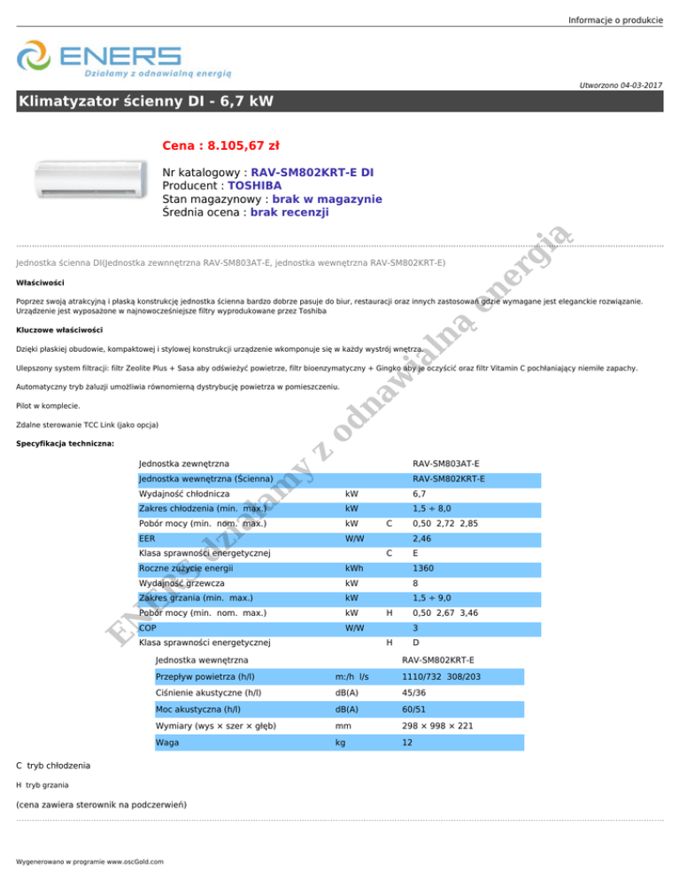 Informacje o produkcie Utworzono 04-03-2017 Klimatyzator ścienny DI - 6,7 kW Cena : 8.105,67 zł Jednostka ścienna DI(Jednostka zewnnętrzna RAV-SM803AT-E, jednostka wewnętrzna RAV-SM802KRT-E) Właściwości en er gi ą Nr katalogowy : RAV-SM802KRT-E DI Producent : TOSHIBA Stan magazynowy : brak w magazynie Średnia ocena : brak recenzji ną Poprzez swoją atrakcyjną i płaską konstrukcję jednostka ścienna bardzo dobrze pasuje do biur, restauracji oraz innych zastosowań gdzie wymagane jest eleganckie rozwiązanie. Urządzenie jest wyposażone w najnowocześniejsze filtry wyprodukowane przez Toshiba Kluczowe właściwości ia l Dzięki płaskiej obudowie, kompaktowej i stylowej konstrukcji urządzenie wkomponuje się w każdy wystrój wnętrza. w Ulepszony system filtracji: filtr Zeolite Plus + Sasa aby odświeżyć powietrze, filtr bioenzymatyczny + Gingko aby je oczyścić oraz filtr Vitamin C pochłaniający niemiłe zapachy. od na Automatyczny tryb żaluzji umożliwia równomierną dystrybucję powietrza w pomieszczeniu. Pilot w komplecie. Zdalne sterowanie TCC Link (jako opcja) z Specyfikacja techniczna: RAV-SM803AT-E y Jednostka zewnętrzna ia ła m Jednostka wewnętrzna (Ścienna) RAV-SM802KRT-E kW Zakres chłodzenia (min. max.) kW Pobór mocy (min. nom. max.) kW EER W/W dz Wydajność chłodnicza Klasa sprawności energetycznej 6,7 1,5 ÷ 8,0 C 0,50 2,72 2,85 2,46 C E kWh 1360 Wydajność grzewcza kW 8 Zakres grzania (min. max.) kW 1,5 ÷ 9,0 Pobór mocy (min. nom. max.) kW COP W/W EN ER S Roczne zużycie energii Klasa sprawności energetycznej H 0,50 2,67 3,46 3 H Jednostka wewnętrzna D RAV-SM802KRT-E Przepływ powietrza (h/l) m:/h l/s 1110/732 308/203 Ciśnienie akustyczne (h/l) dB(A) 45/36 Moc akustyczna (h/l) dB(A) 60/51 Wymiary (wys × szer × głęb) mm 298 × 998 × 221 Waga kg 12 C tryb chłodzenia H tryb grzania (cena zawiera sterownik na podczerwień) Wygenerowano w programie www.oscGold.com
