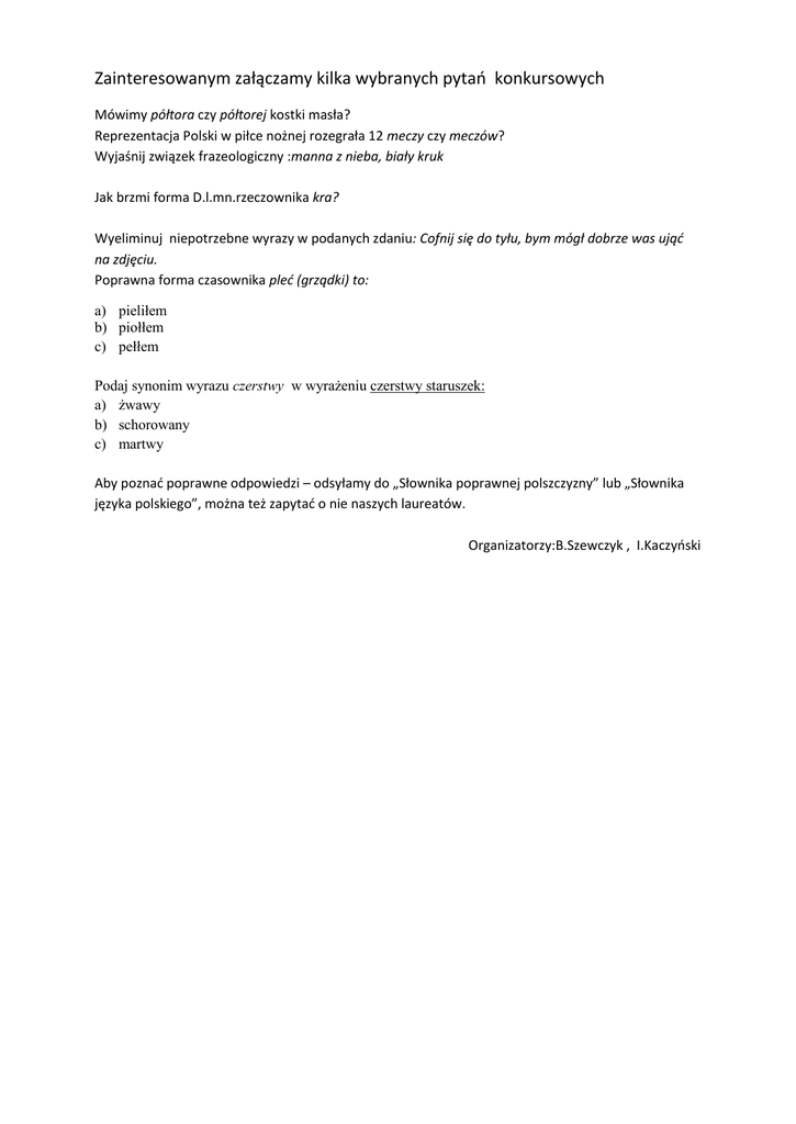 Zainteresowanym załączamy kilka wybranych pytań konkursowych Mówimy półtora czy półtorej kostki masła? Reprezentacja Polski w piłce nożnej rozegrała 12 meczy czy meczów? Wyjaśnij związek frazeologiczny :manna z nieba, biały kruk Jak brzmi forma D.l.mn.rzeczownika kra? Wyeliminuj niepotrzebne wyrazy w podanych zdaniu: Cofnij się do tyłu, bym mógł dobrze was ująć na zdjęciu. Poprawna forma czasownika pleć (grządki) to: a) pieliłem b) piołłem c) pełłem Podaj synonim wyrazu czerstwy w wyrażeniu czerstwy staruszek: a) żwawy b) schorowany c) martwy Aby poznać poprawne odpowiedzi – odsyłamy do „Słownika poprawnej polszczyzny” lub „Słownika języka polskiego”, można też zapytać o nie naszych laureatów. Organizatorzy:B.Szewczyk , I.Kaczyński