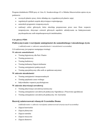 Program działalności PŚDS przy ul. Gen. K. Sosnkowskiego 43 w Mińsku Mazowieckim opiera się na podstawie: rocznych planów pracy, które składają się z tygodniowych planów zajęć, regularnych spotkań zespołu aktywizująco-wspierającego, autorskich programów terapeutycznych, realizacji celów głównych, które określają proponowane przez nasz Dom wsparcie terapeutyczne, dotyczące czterech głównych aspektów odziaływania na funkcjonowanie psychospołeczne osób niepełnosprawnych intelektualnie. Cele główne PŚDS Podtrzymywanie i rozwijanie umiejętności do samodzielnego i niezależnego życia ( oddziaływanie w zakresie samodzielności i niezależności uczestnika) Cel realizowany jest poprzez następujące treningi: W zakresie samodzielności Trening higieniczny dla Pań i Panów Trening poznawczy Trening budżetowy Trening kulinarny/Zajęcia kulinarne Trening umiejętności praktycznych Trening specjalistyczny (dla osób ze spektrum autyzmu) W zakresie niezależności Trening umiejętności interpersonalnych Trening spędzania czasu wolnego Indywidualne wsparcie psychologiczne W zakresie aktywizacji zawodowej Trening aktywizacji zawodowej teoretyczny Trening umiejętności zawodowych praktyczny Ogrodniczy ( Pracownia ogrodnicza) Trening umiejętności zawodowych praktyczny Art- kawiarnia Rozwój zainteresowań własnych Uczestnika Domu (oddziaływanie w zakresie rozwijania zainteresowań artystycznych uczestnika) Zajęcia krawieckie Zajęcia plastyczne Zajęcia teatralne Zajęcia muzyczne Zajęcia dramowe Zajęcia z biżuterii Zajęcia ceramiczne Zajęcia multimedialne Zajęcia rekreacyjno-turystyczne (wycieczki, wyjazdy, spacery) Dążenie do pełnej integracji ze środowiskiem lokalnym poprzez uczestnictwo w życiu kulturalnym (oddziaływanie w zakresie szeroko rozumianej integracji ze środowiskiem lokalnym) Zajęcia klubowe Art-kawiarnia Imprezy integracyjne Poszerzenie świadomości w społeczności lokalnej w zakresie wiedzy na temat niepełnosprawności intelektualnej (oddziaływanie w zakresie szeroko rozumianej integracji ze środowiskiem lokalnym) Projekty edukacyjno-społeczne Spektakle teatralne Współpraca z rodziną (oddziaływanie w zakresie współpracy z rodziną uczestnika) Wsparcie psychologiczne Spotkania organizacyjne z zespołem wspierająco-aktywizującym Imprezy integracyjne PŚDS w Mińsku Mazowieckim dodatkowo w ramach prowadzonych treningów opracował dla każdego uczestnika indywidualny profil potrzeb treningów umiejętności społecznych na podstawie Skali Zachowania Przystosowawczego dla dzieci, młodzieży i dorosłych Kazuro Nihiry w przekładzie Janusza Kostrzewskiego wraz z kartą umiejętności społecznych. Profil potrzeb treningów umiejętności społecznych składa się z: Część I - I. Niezależne funkcjonowanie, II. Rozwój fizyczny, III. Aktywność ekonomiczna, IV. Rozwój mowy, V. Pojęcie liczby i czasu, VI. Prace domowe, VII. Aktywność zawodowa, VIII. Samokontrola IX. Odpowiedzialność X. Uspołecznienie. Część II – I. Zaburzenia w zachowaniu Na podstawie wyników badań psychologicznych (Skala Przystosowawcza Kazuro Nihiry) przeprowadzonych przez psychologa po konsultacji z zespołem wspierająco - aktywizującym dla każdego z uczestników zostaje opracowany indywidualny profil umiejętności społecznych. Profil umiejętności społecznych stanowi podstawę do opracowania kart umiejętności społecznych. Karty umiejętności społecznych zawierają dla każdego uczestnika rodzaj treningu społecznego, rozpoznanie możliwości oraz problemów, cele, metody i formy zajęć. Profil umiejętności społecznych, w zależności od otrzymanych przez uczestnika liczby punktów w zakresie danej sprawności społecznej, określa trzy rodzaje obszarów wskazań do długoterminowej terapii dla każdego uczestnika naszego Domu: Obszar A – skierowany dla osób niezdolnych do osiągnięcia samodzielności, zmuszonych pozostać pod opieką i mieszkać wraz z opiekunami, bądź w ośrodkach opiekuńczych. Obszar B - skierowany do osób zdolnych do samodzielnego zamieszkania, jednak przy stałym wsparciu opiekuna. Obszar C – skierowany do osób zdolnych do samodzielnego zamieszkania jednak wymagających okresowego wsparcia. Profil umiejętności społecznych jest przedstawiony rodzicom i opiekunom, którzy razem z zespołem terapeutycznym, określają potrzeby i możliwości psychofizyczne oraz rodzaj obszaru do długoterminowej terapii dla uczestników naszego Domu.