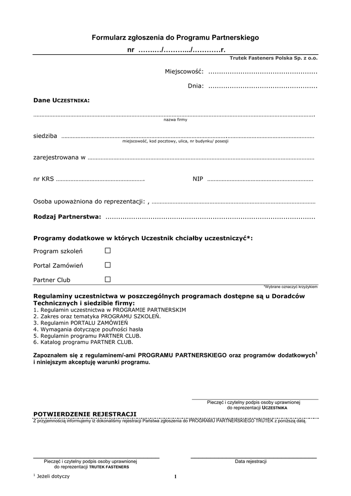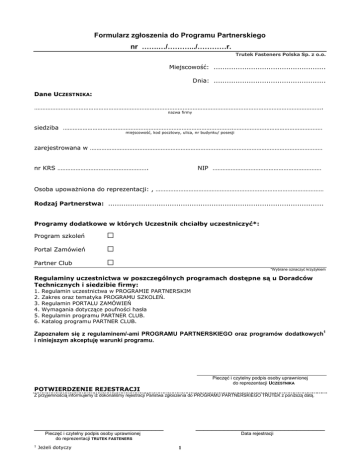 Formularz zgłoszenia do Programu Partnerskiego nr …….…/……….../…………r. Trutek Fasteners Polska Sp. z o.o. Miejscowość: ................................................... Dnia: ................................................... Dane UCZESTNIKA: …………………………………………………………………………………………………………………………………………………………. nazwa firmy siedziba ………………………………………………………………………………………….……………………………………………… miejscowość, kod pocztowy, ulica, nr budynku/ posesji zarejestrowana w …………………………………………………………………………………………………………………………… nr KRS ………………………………………………. NIP ………………………………………………………… Osoba upowaŜniona do reprezentacji: , ………………………………………………………………………………………… Rodzaj Partnerstwa: .................................................................................................. Programy dodatkowe w których Uczestnik chciałby uczestniczyć*: Program szkoleń Portal Zamówień Partner Club □ □ □ *Wybrane oznaczyć krzyŜykiem Regulaminy uczestnictwa w poszczególnych programach dostępne są u Doradców Technicznych i siedzibie firmy: 1. 2. 3. 4. 5. 6. Regulamin uczestnictwa w PROGRAMIE PARTNERSKIM Zakres oraz tematyka PROGRAMU SZKOLEŃ. Regulamin PORTALU ZAMÓWIEŃ Wymagania dotyczące poufności hasła Regulamin programu PARTNER CLUB. Katalog programu PARTNER CLUB. Zapoznałem się z regulaminem/-ami PROGRAMU PARTNERSKIEGO oraz programów dodatkowych i niniejszym akceptuję warunki programu. 1 Pieczęć i czytelny podpis osoby uprawnionej do reprezentacji UCZESTNIKA POTWIERDZENIE REJESTRACJI Z przyjemnością informujemy iŜ dokonaliśmy rejestracji Państwa zgłoszenia do PROGRAMU PARTNERSKIEGO TRUTEK z poniŜszą datą. ________________________________ ________________________________ Pieczęć i czytelny podpis osoby uprawnionej do reprezentacji TRUTEK FASTENERS 1 JeŜeli dotyczy Data rejestracji 1