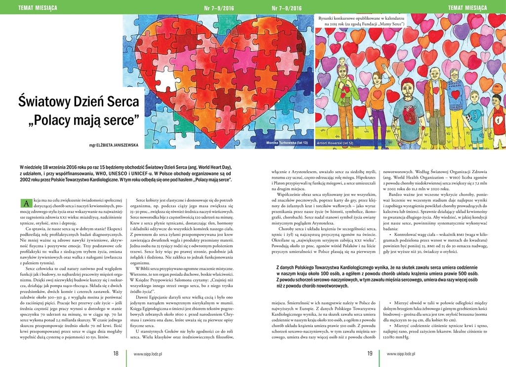 TEMAT MIESIACA Nr 7–9/2016 TEMAT MIESIACA Nr 7–9/2016 Rysunki konkursowe opublikowane w kalendarzu na 2015 rok (za zgodą Fundacji „Mamy Serce”) Światowy Dzień Serca „Polacy mają serce” mgr Elżbieta Janiszewska W niedzielę 18 września 2016 roku po raz 15 będziemy obchodzić Światowy Dzień Serca (ang. World Heart Day), z udziałem, i przy współfinansowaniu, WHO, UNESCO i UNICEF-u. W Polsce obchody organizowane są od 2002 roku przez Polskie Towarzystwo Kardiologiczne. W tym roku odbędą się one pod hasłem ,,Polacy mają serce”. kcja ma na celu zwiększenie świadomości społecznej dotyczącej chorób serca i naczyń krwionośnych, promocję zdrowego stylu życia oraz wskazywanie na najważniejsze zagrożenia zdrowia X XI wieku: miażdżycę, nadciśnienie tętnicze, otyłość, stres i depresję. Co sprawia, że nasze serca są w dobrym stanie? Eksperci podkreślają rolę profilaktycznych badań diagnostycznych. Nie mniej ważne są zdrowe nawyki żywieniowe, aktywność fizyczna i pozytywne emocje. Trzy podstawowe cele profilaktyki to: walka z siedzącym trybem życia, zmiana nawyków żywieniowych oraz walka z nałogami (zwłaszcza z paleniem tytoniu). Serce człowieka to cud natury zarówno pod względem funkcji jak i budowy, to najbardziej pracowity mięsień organizmu. Dzięki swej niezwykłej budowie kurczy się i rozkurcza, działając jak pompa ssąco-tłocząca. Składa się z dwóch przedsionków, dwóch komór i czterech zastawek. Waży zaledwie około 300–350 g, z wyglądu można je porównać do zaciśniętej pięści. Pracuje bez przerwy całe życie – jeśli średnia częstość jego pracy wynosi u dorosłego w stanie spoczynku 70 uderzeń na minutę, to w ciągu np. 70 lat serce wykona ponad 2,5 miliarda skurczy. W czasie jednego skurczu przepompowuje średnio około 70 ml krwi. Ilość krwi przepompowanej przez serce w ciągu dnia mogłaby wypełnić dużą cysternę o pojemności 10 tys. litrów. A 18 Serce kobiety jest elastyczne i dostosowuje się do potrzeb organizmu, np. podczas ciąży jego masa zwiększa się 25–30 proc., zwiększa się również średnica naczyń wieńcowych. Serce noworodka bije z częstotliwością 120 uderzeń na minutę. Krew z serca płynie tętnicami, dostarczając tlen, hormony i składniki odżywcze do wszystkich komórek naszego ciała. Z powrotem do serca żyłami przepompowywana jest krew zawierająca dwutlenek węgla i produkty przemiany materii. Jedna osoba na 25 tysięcy rodzi się z odwrotnym położeniem trzewi. Serce leży więc po prawej stronie, podobnie jak żołądek i śledziona. Nie zakłóca to jednak funkcjonowania organizmu. W Biblii sercu przypisywano ogromne znaczenie mistyczne. Wierzono, że ten organ posiada duchowe, boskie właściwości. W Księdze Przypowieści Salomona czytamy: „Czujniej niż wszystkiego innego strzeż swego serca, bo z niego tryska źródło życia!’’. Dawni Egipcjanie darzyli serce wielką czcią i było ono jedynym narządem wewnętrznym nietykalnym w mumii. Księga Egiptologiczna o śmierci jest zbiorem tekstów pogrzebowych zebranych około 1600 r. przed narodzeniem Chrystusa i zawiera ona dane, które uważa się za pierwsze opisy fizyczne serca. U starożytnych Greków nie było zgodności co do roli serca. Wielu klasyków oraz średniowiecznych filozofów, www.oipp.lodz.pl Monika Turkowska (lat 13) włącznie z Arystotelesem, uważało serce za siedzibę myśli, rozumu czy uczuć, często odrzucając rolę mózgu. Hipokrates i Platon przypisywali tę funkcję mózgowi, a serce umieszczali na drugim miejscu. Współcześnie obraz serca stylizowany jest we wszystkim, od znaczków pocztowych, poprzez karty do gry, przez klejnoty do żelaznych krat i torcików waflowych – jako wyraz przenikania przez nasze życie (w historii, symbolice, ikonografii, chorobach). Serce nadal stanowi symbol życia owiany mistycznym poglądem Arystotelesa. Choroby serca i układu krążenia (w szczególności serca, tętnic i żył) są najczęstszą przyczyną zgonów na świecie. Określane są „największym seryjnym zabójcą X XI wieku”. Powodują około 50 proc. zgonów wśród Polaków i na liście przyczyn umieralności w Polsce plasują się na pierwszym nowotworowych. Według Światowej Organizacji Zdrowia (ang. World Health Organization – W HO) liczba zgonów z powodu choroby niedokrwiennej serca zwiększy się z 7,1 mln w 2002 roku do 11,1 mln w 2020 roku. Bardzo ważne jest wczesne wykrycie choroby, ponieważ leczenie we wczesnym stadium daje najlepsze wyniki i zapobiega wystąpieniu powikłań choroby prowadzących do kalectwa lub śmierci. Sprawnie działający układ krwionośny to gwarancja długiego życia. Aby wiedzieć, w jakiej kondycji jest nasze serce, powinniśmy systematycznie wykonywać badania: • Kontrolować wagę ciała – wskaźnik BMI (waga w kilogramach podzielona przez wzrost w metrach do kwadratu) powinien być poniżej 25, BMI od 25 do 30 oznacza nadwagę, gdy jest wyższe niż 30, świadczy o otyłości. Z danych Polskiego Towarzystwa Kardiologicznego wynika, że na skutek zawału serca umiera codziennie w naszym kraju około 100 osób, a ogółem z powodu chorób układu krążenia umiera prawie 500 osób. Z powodu schorzeń sercowo-naczyniowych, w tym zawału mięśnia sercowego, umiera dwa razy więcej osób niż z powodu chorób nowotworowych. miejscu. Śmiertelność w ich następstwie należy w Polsce do najwyższych w Europie. Z danych Polskiego Towarzystwa Kardiologicznego wynika, że na skutek zawału serca umiera codziennie w naszym kraju około 100 osób, a ogółem z powodu chorób układu krążenia umiera prawie 500 osób. Z powodu schorzeń sercowo-naczyniowych, w tym zawału mięśnia sercowego, umiera dwa razy więcej osób niż z powodu chorób 19 • Mierzyć obwód w talii w połowie odległości między dolnym brzegiem łuku żebrowego i górnym grzebieniem kości biodrowej – groźna dla serca jest tzw. o